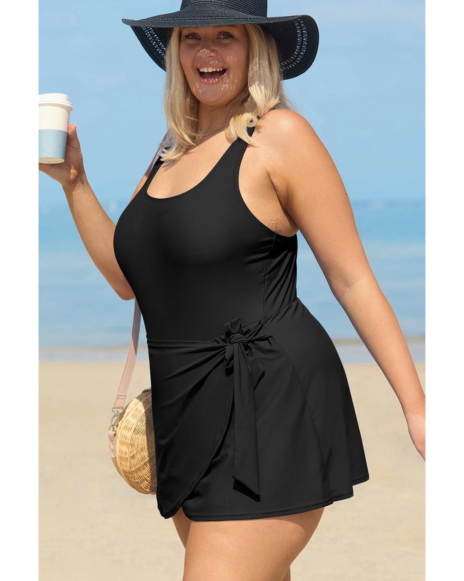 Black Solid Color Square Neck Knotted Plus Size One Piece Swimsuit – 4X