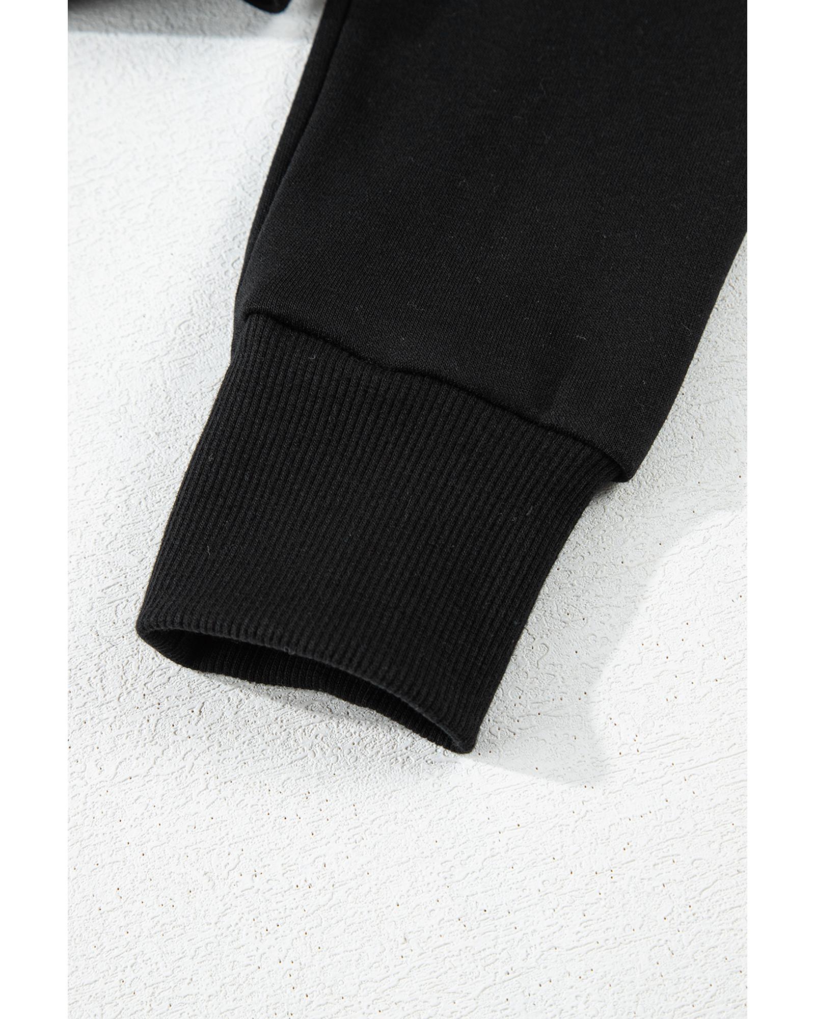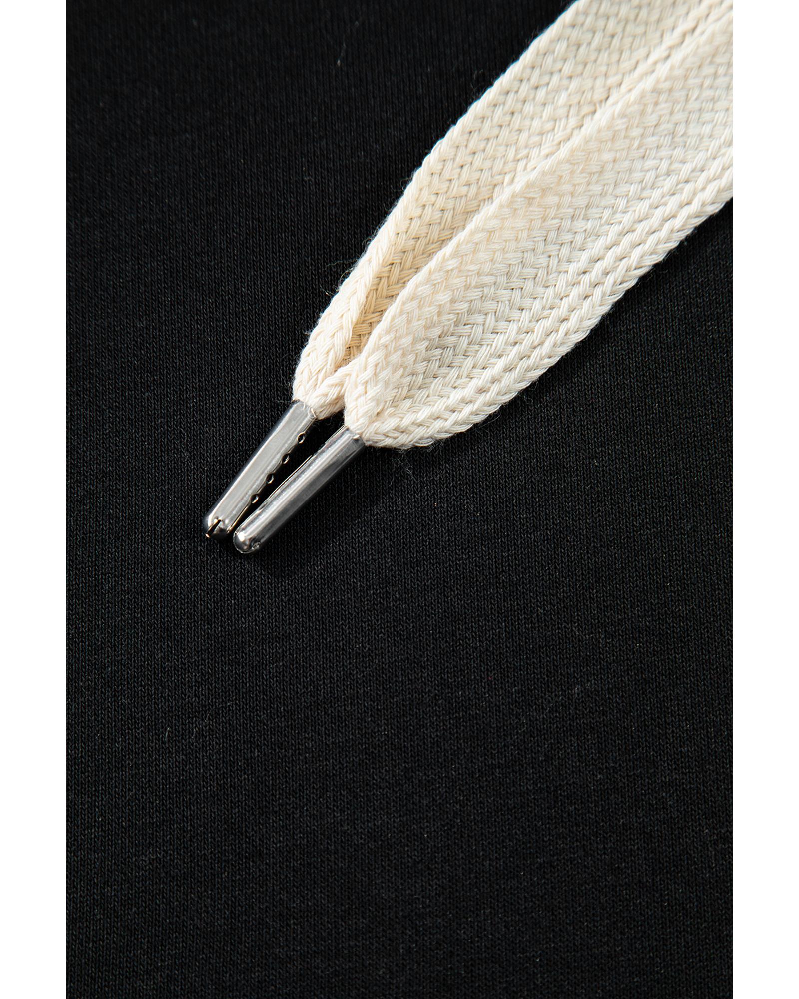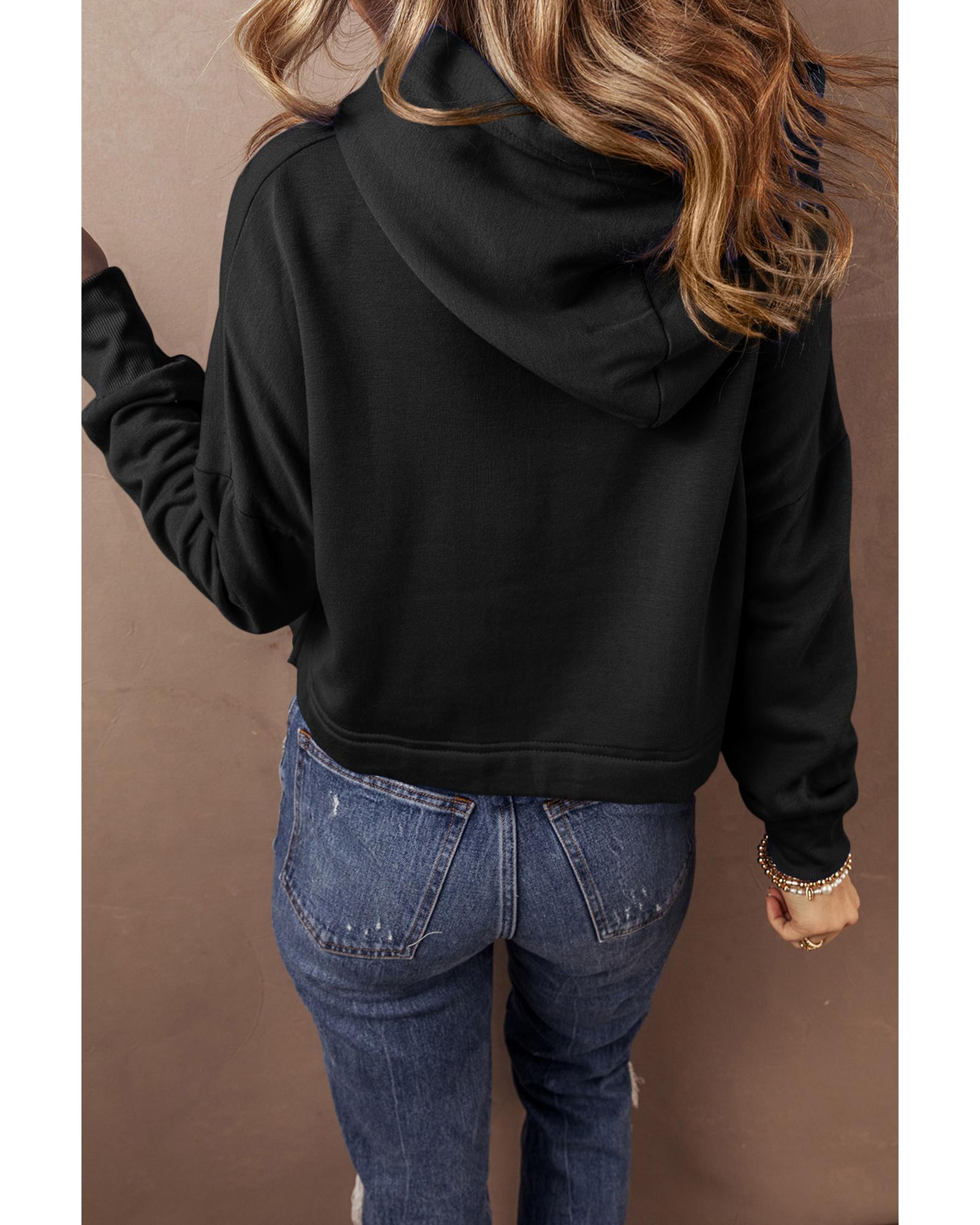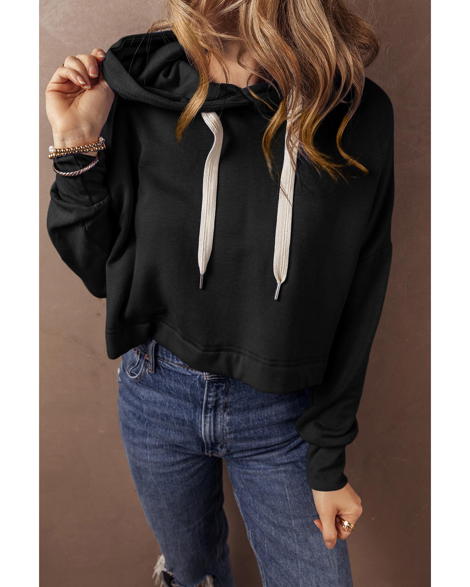 Black Solid Drop Shoulder Drawstring Cropped Hoodie – L