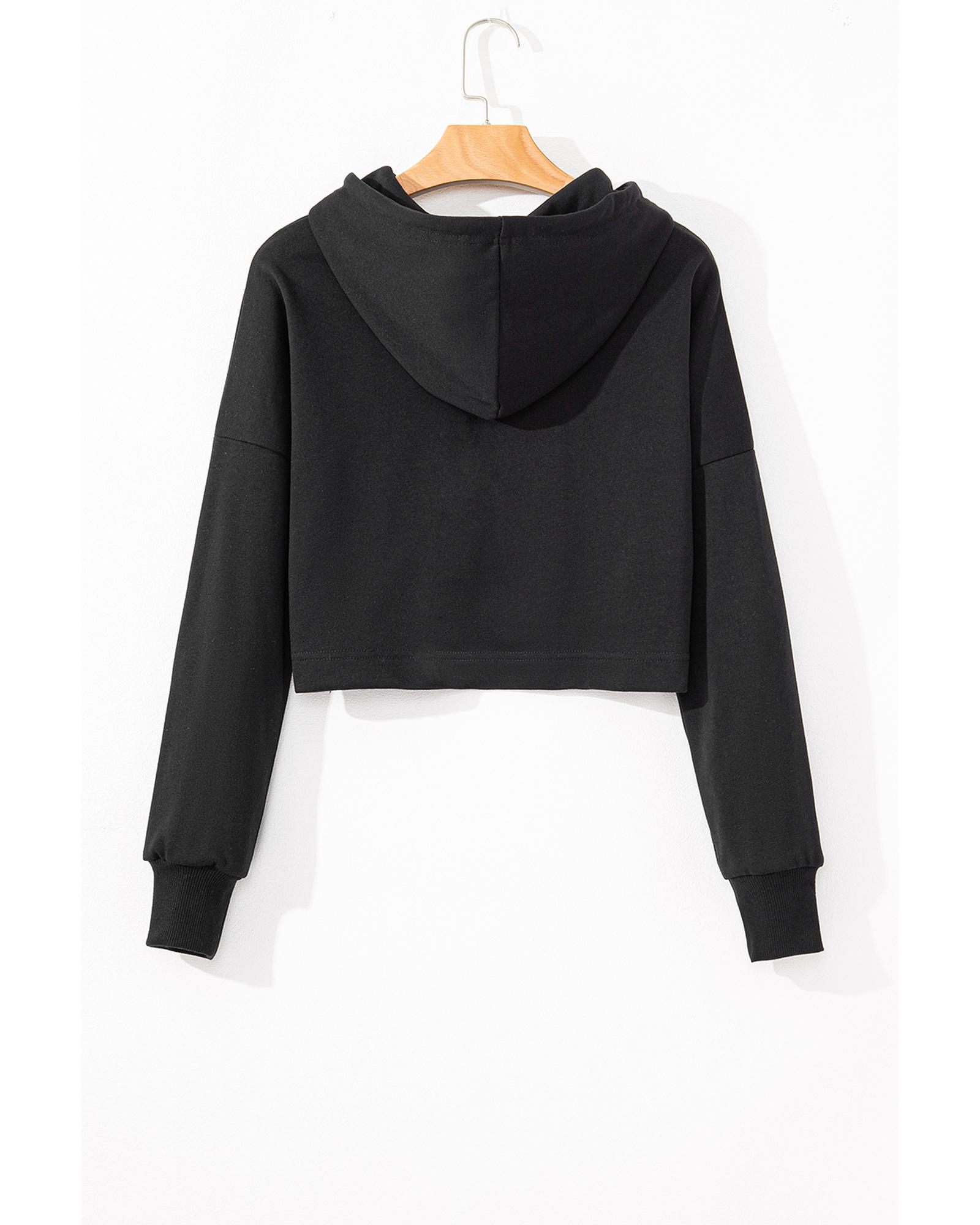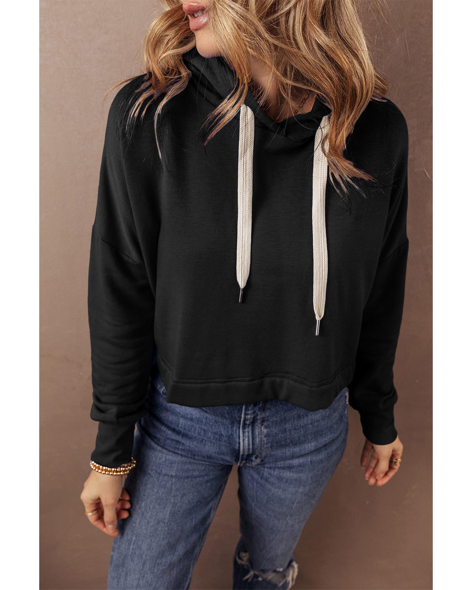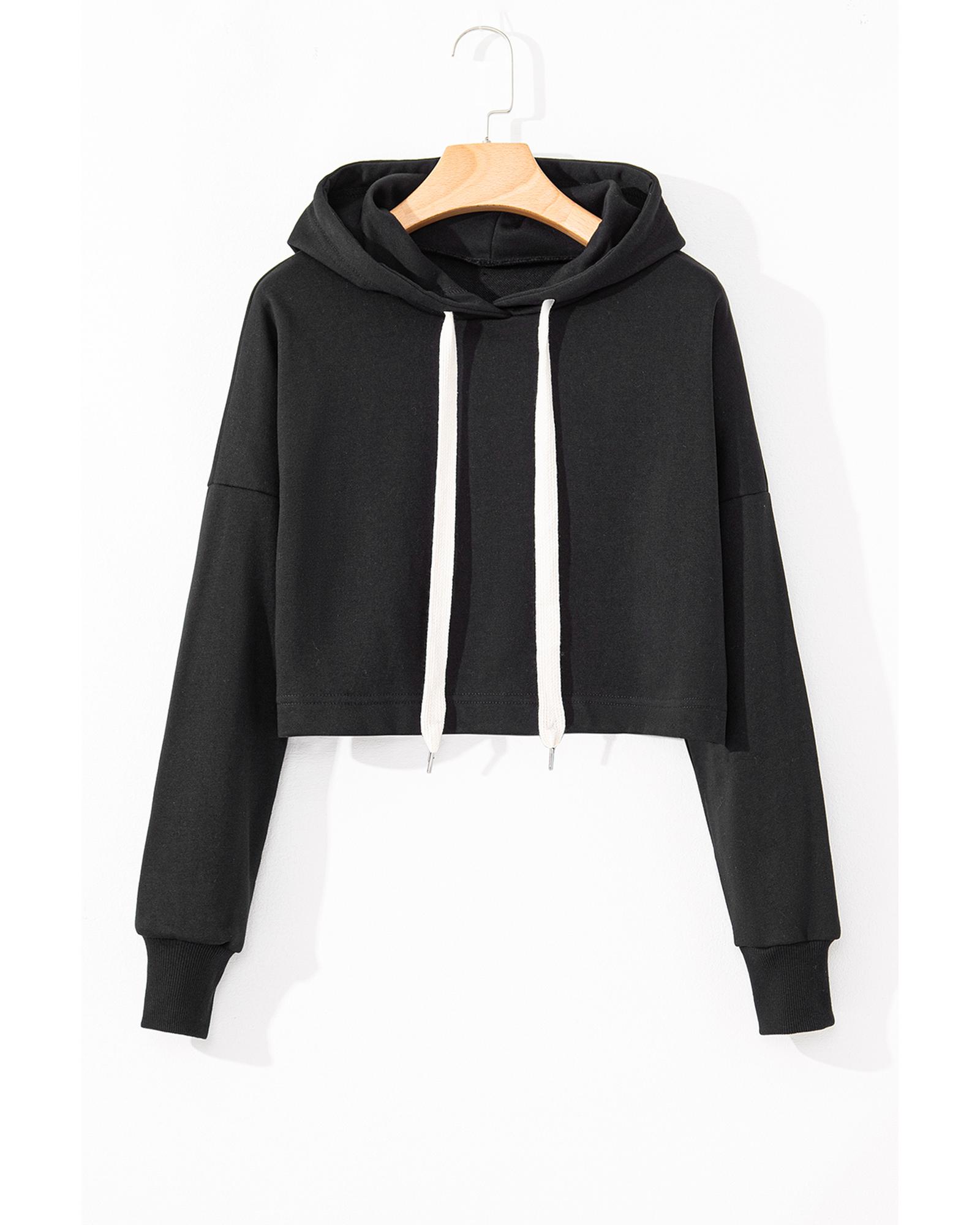 Black Solid Drop Shoulder Drawstring Cropped Hoodie – XL