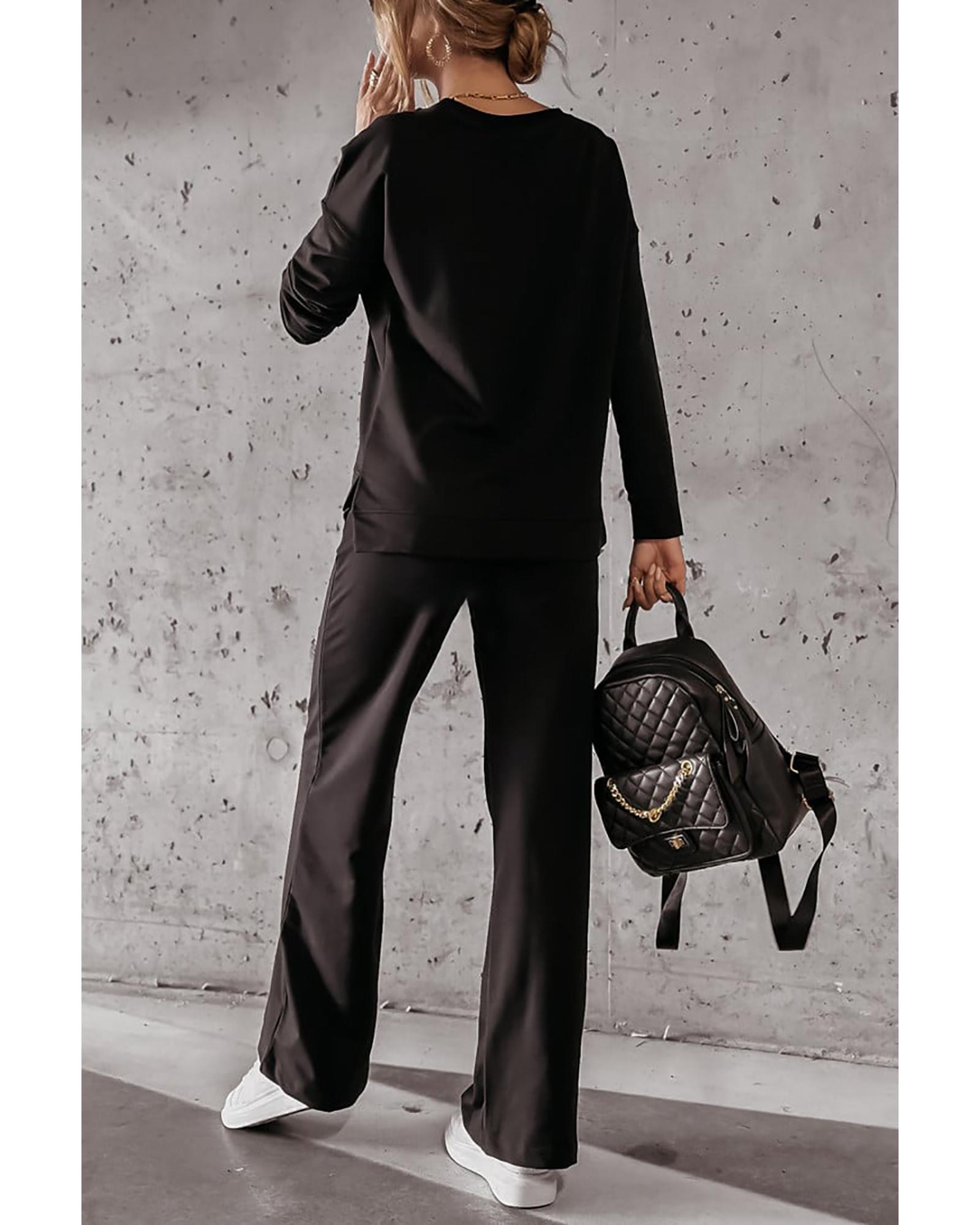 Black Solid Pullover and Seamed Casual Pants Set – L