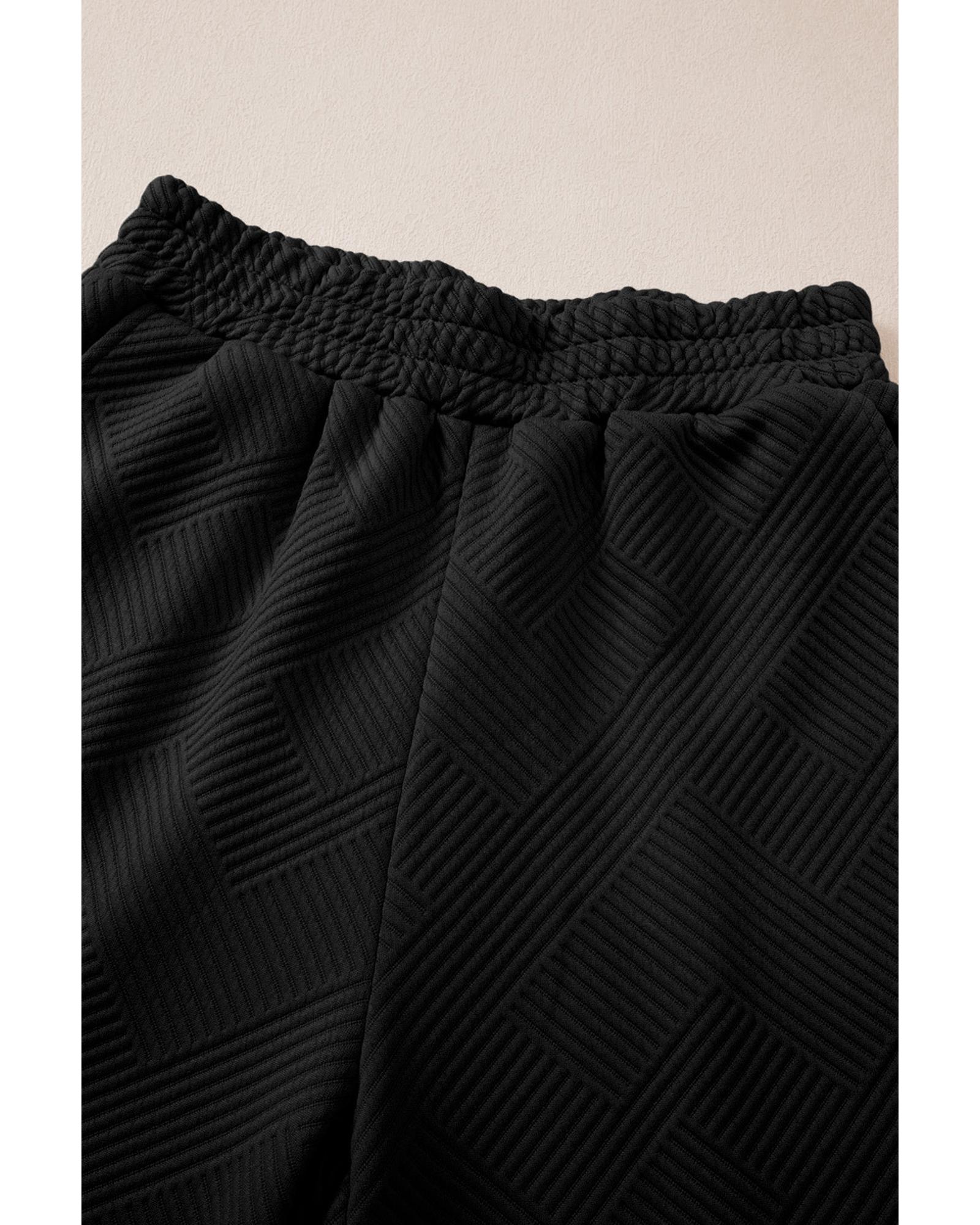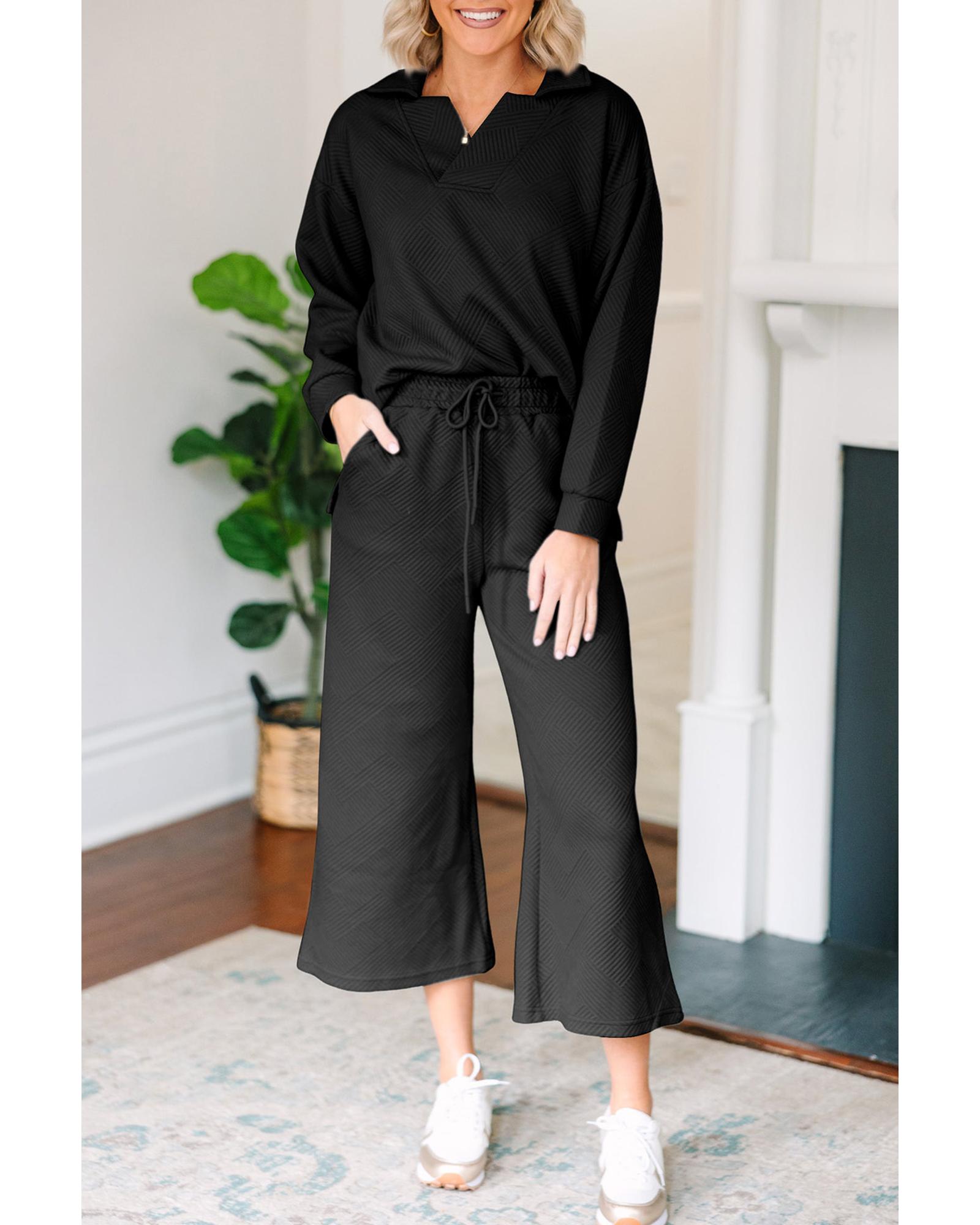 Black Solid Textured Collared V Neck Top and Wide Leg Pants Set – 2XL