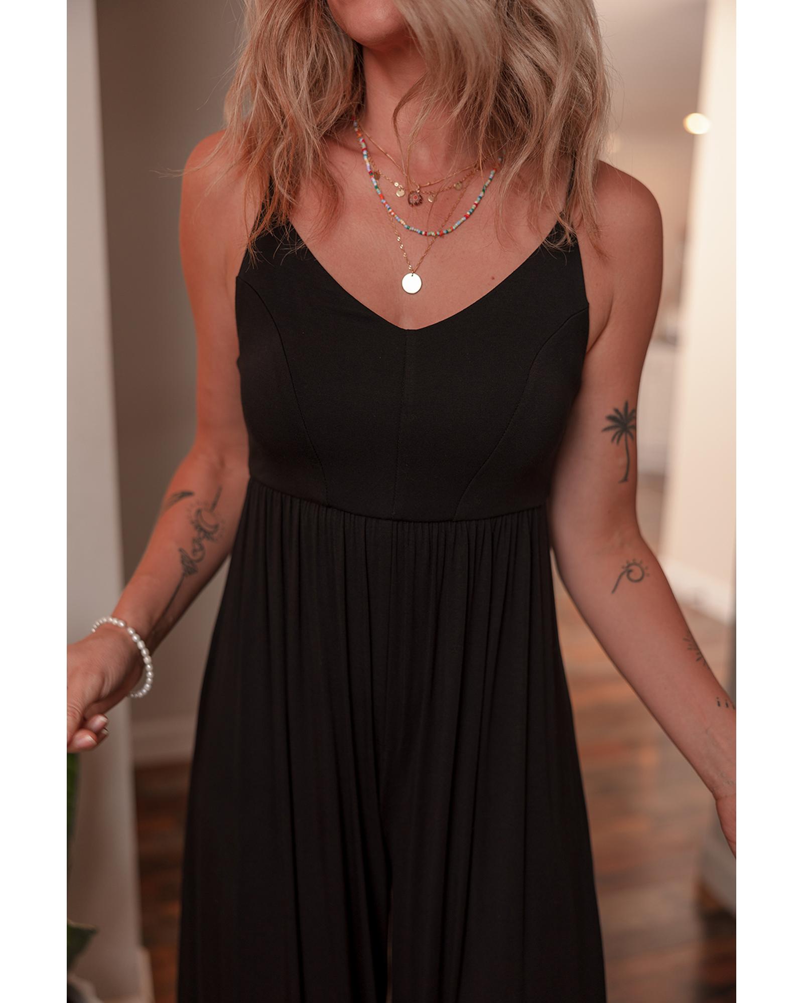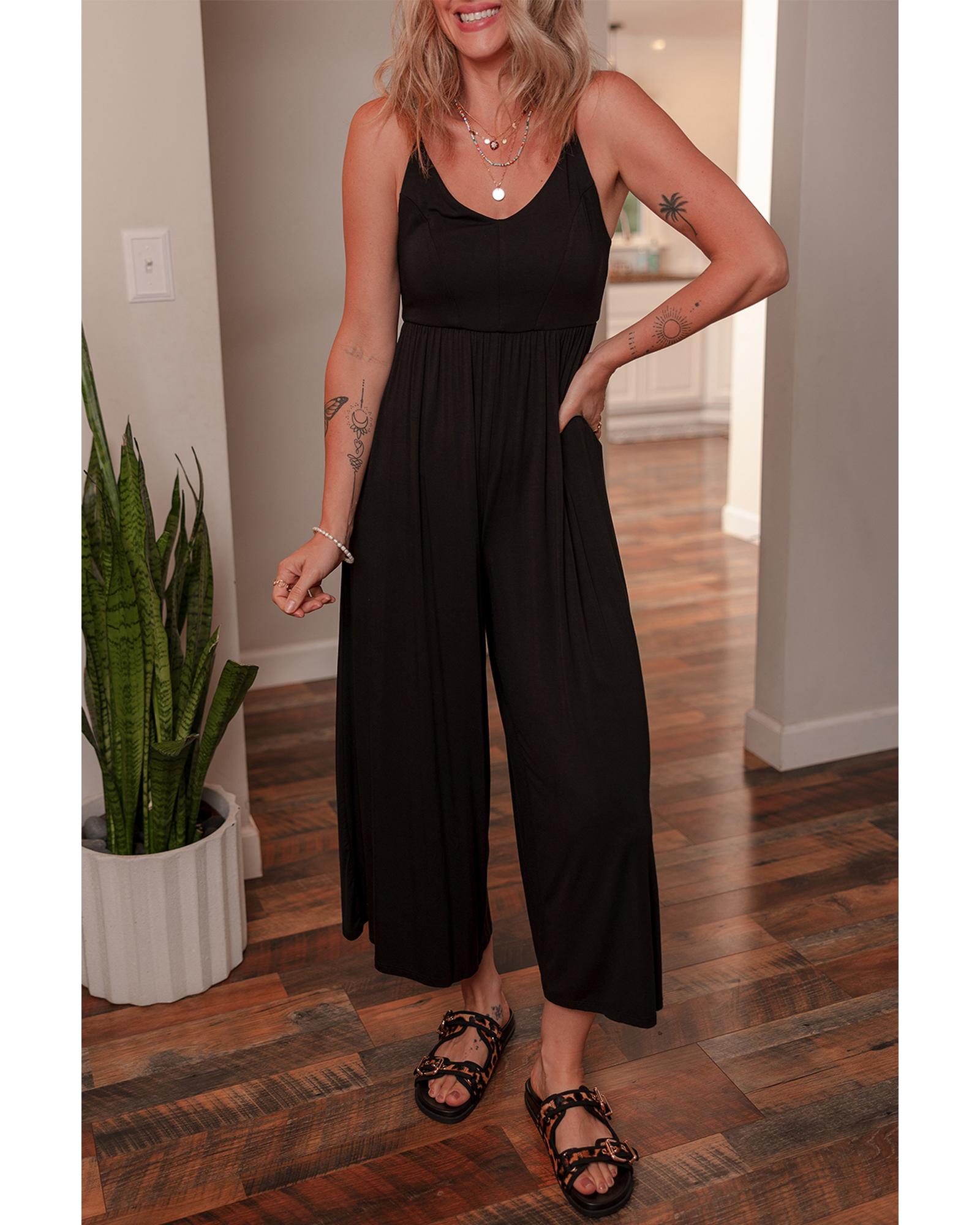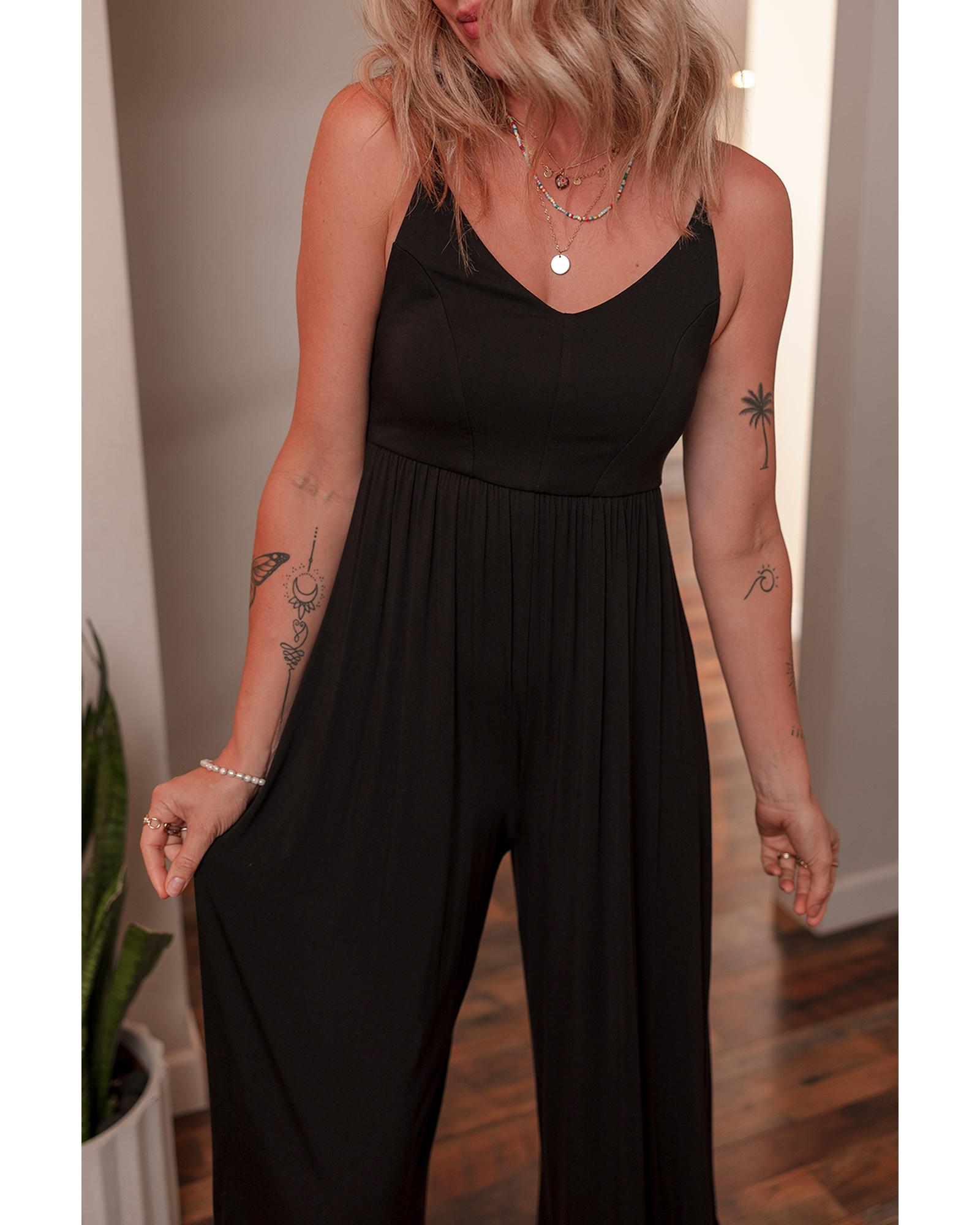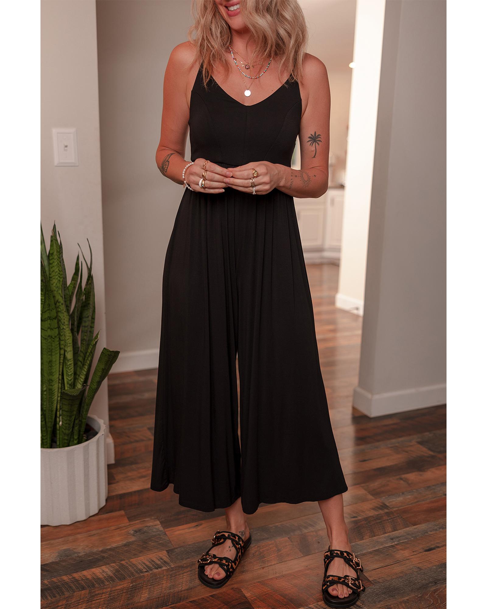 Black Spaghetti Straps Open Back Pleated Wide Leg Jumpsuit – L