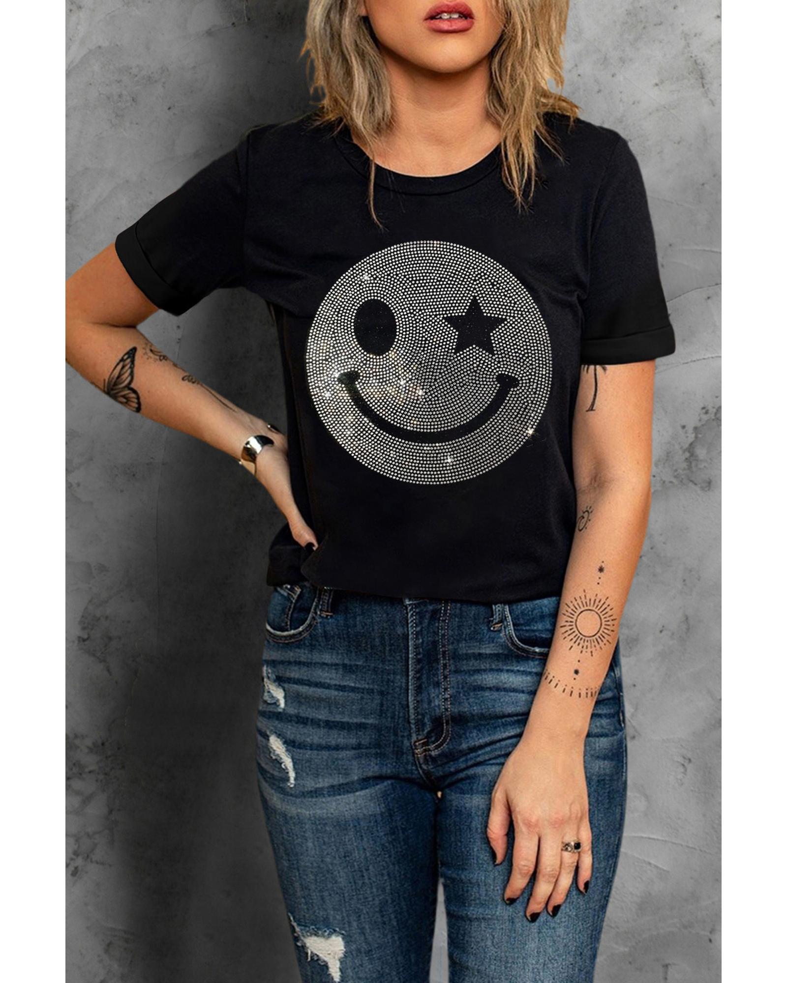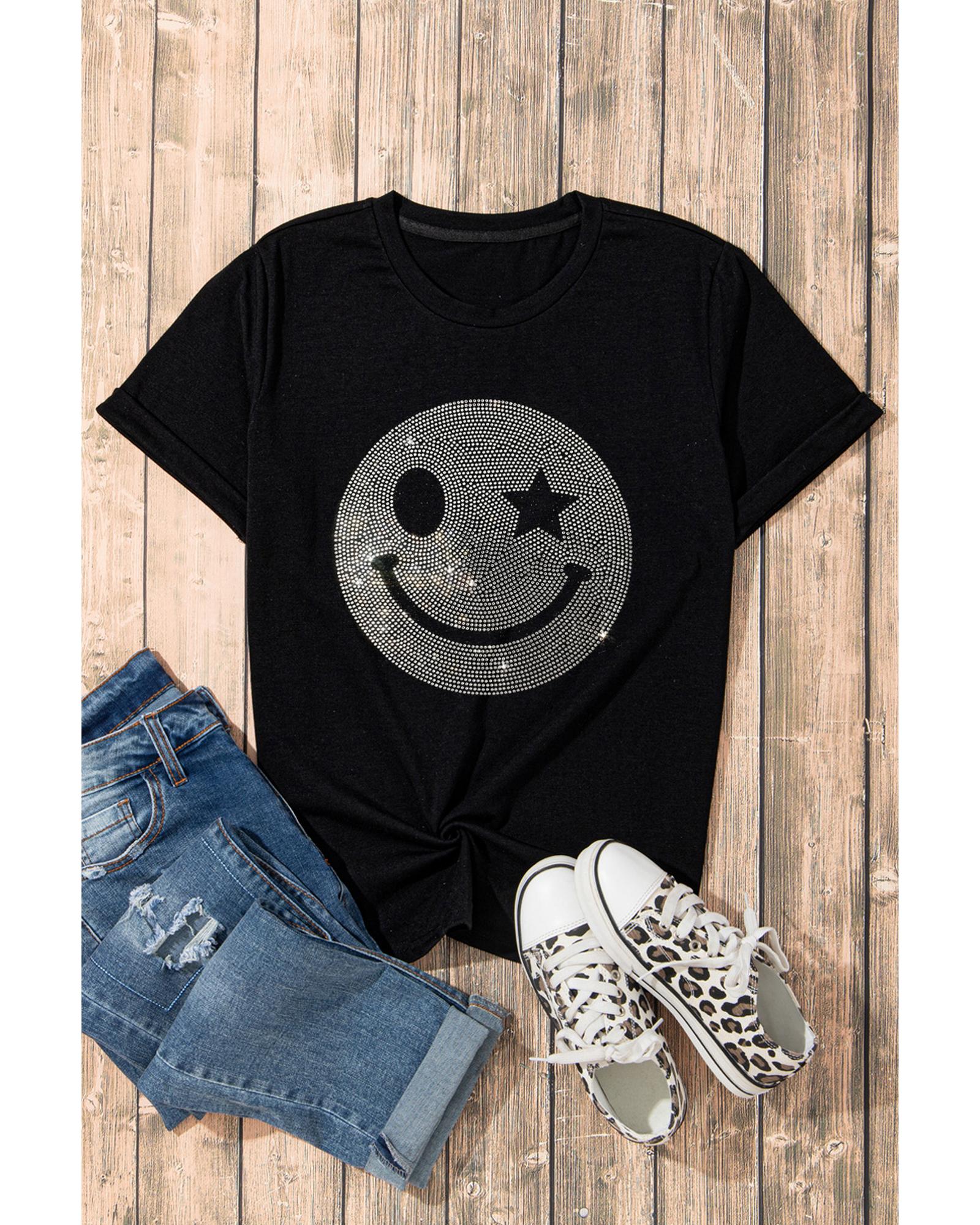 - Black Sparkle Rhinestone Smile Face Graphic T Shirt