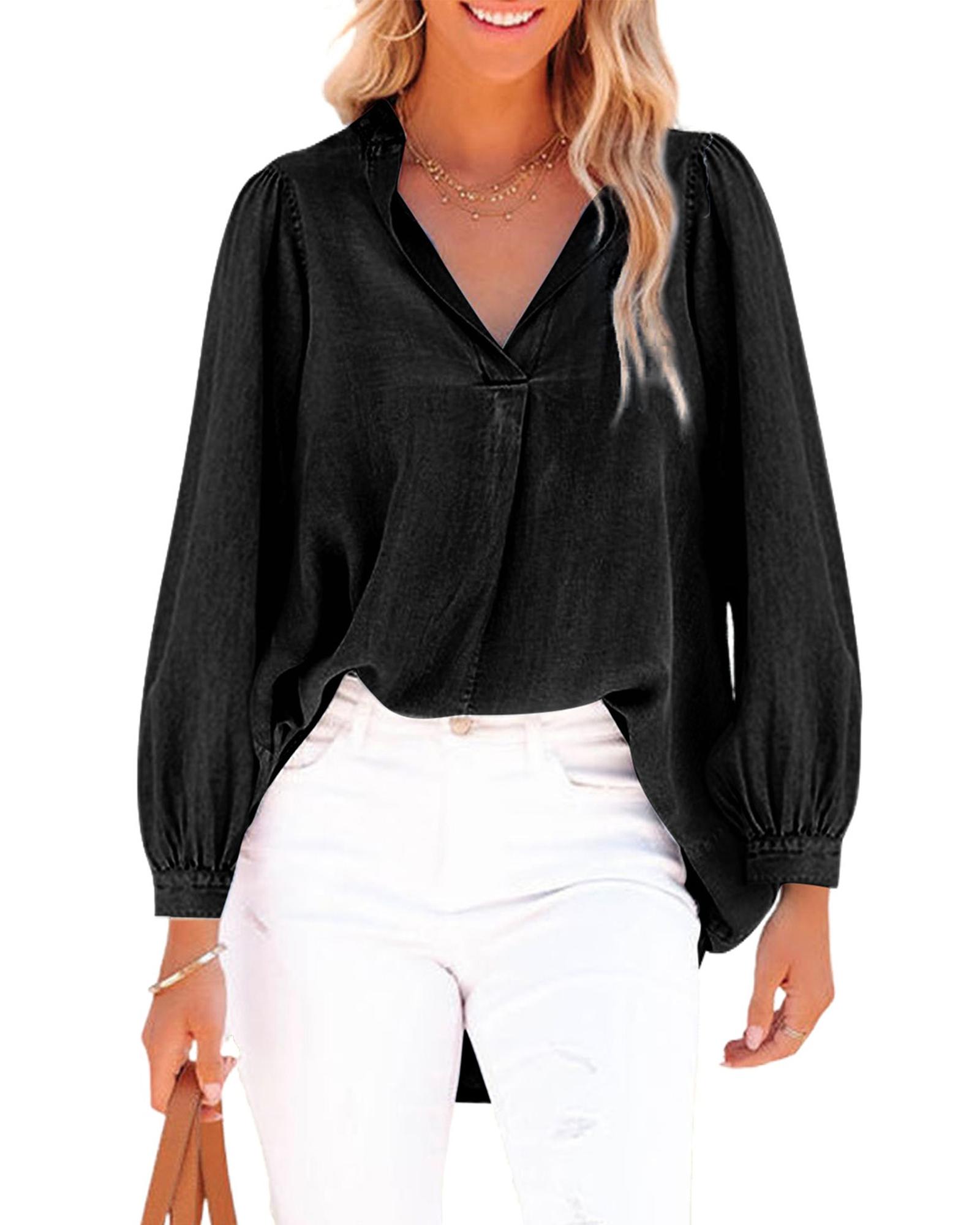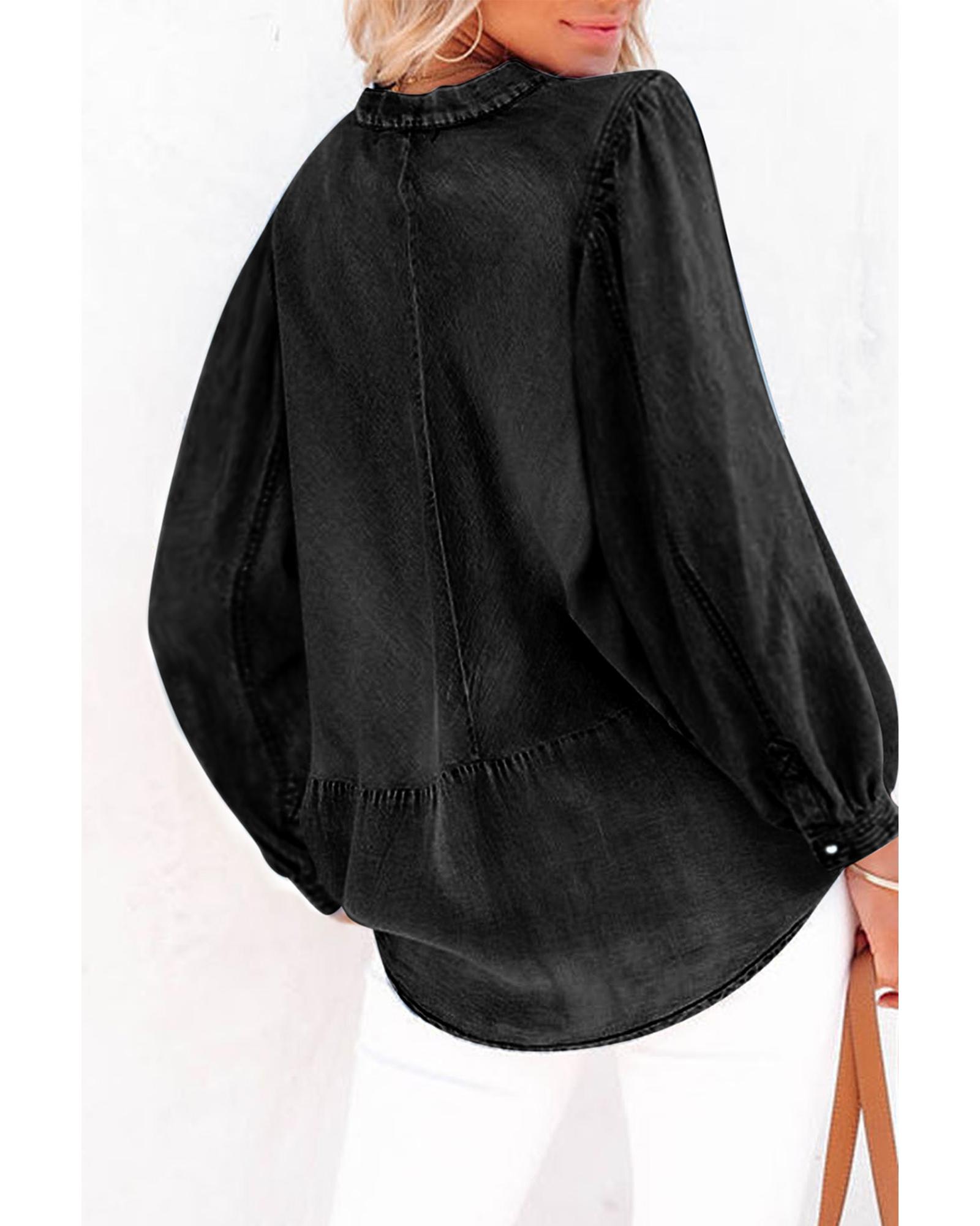 Black Split V-Neck Balloon Sleeve Ruched Denim Top – S
