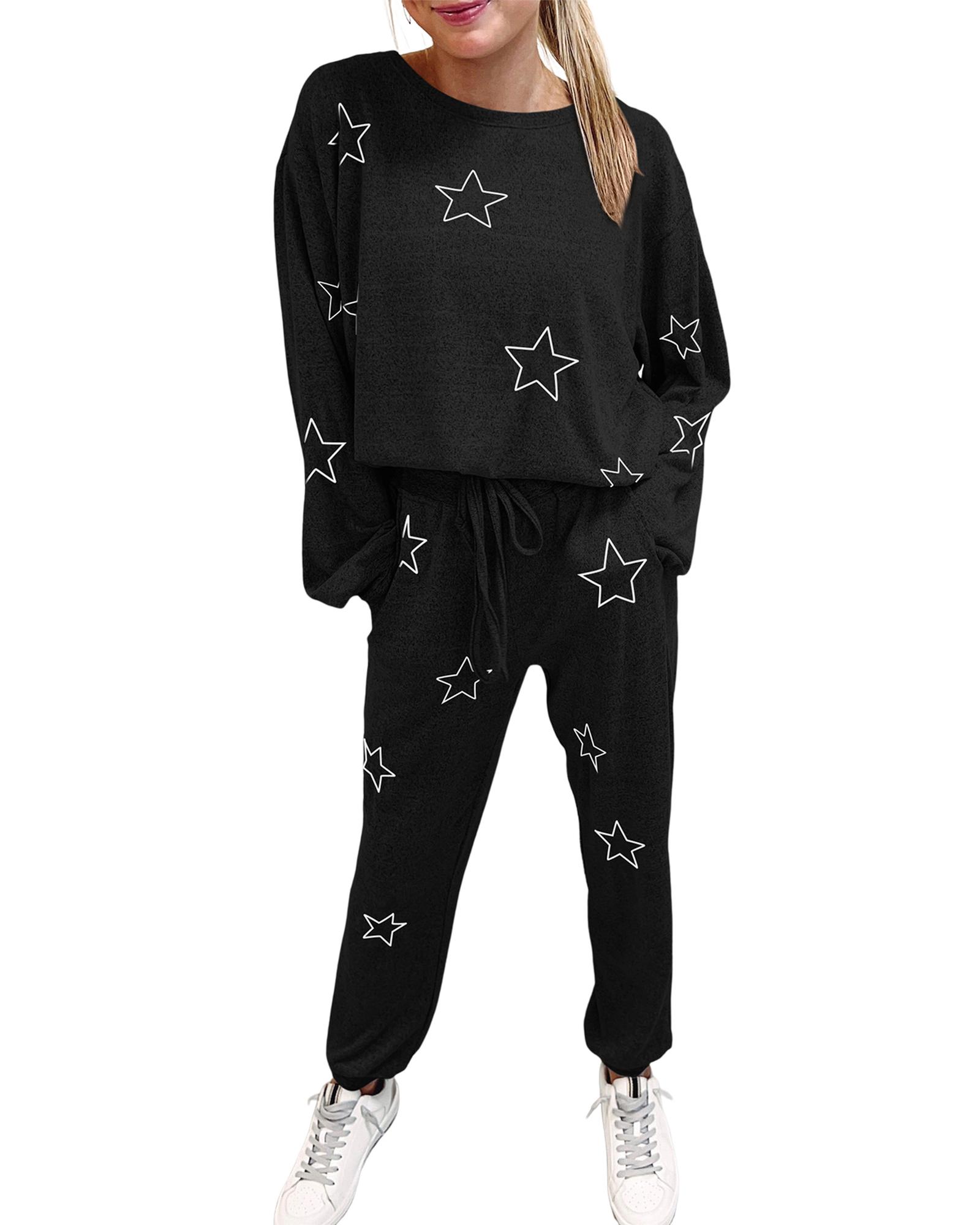 Black Stars Print Long Sleeve Drawstring High Waist Lounge Set – L