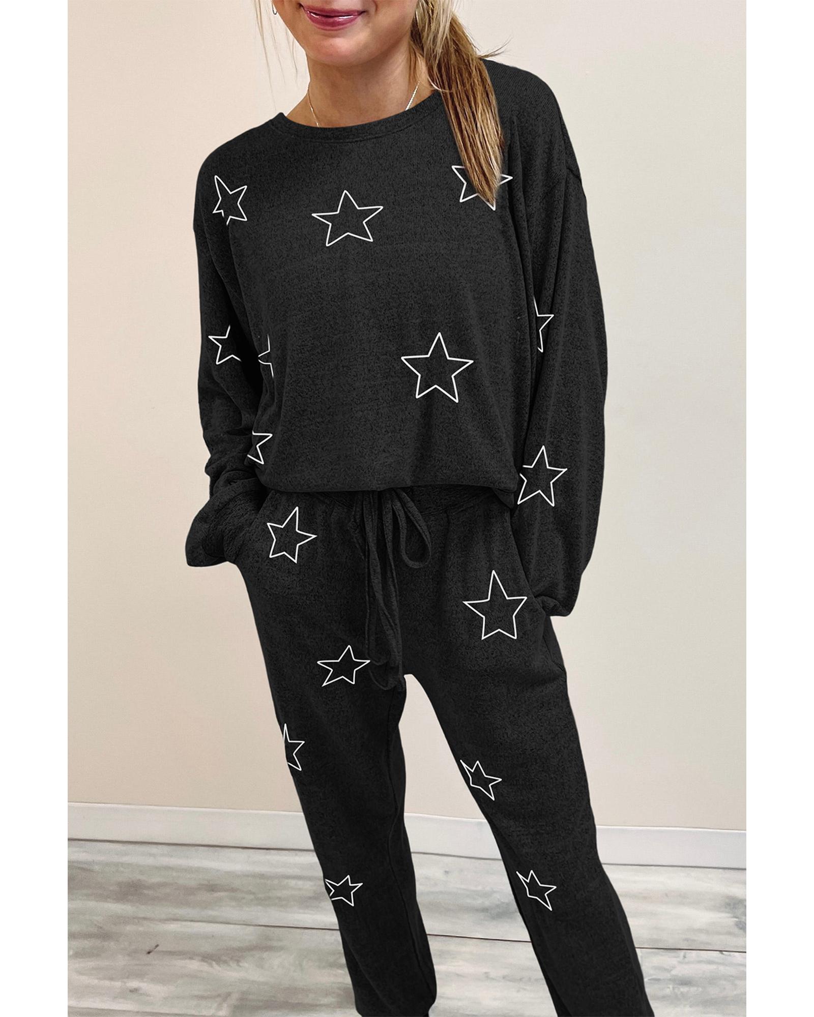 Black Stars Print Long Sleeve Drawstring High Waist Lounge Set – M