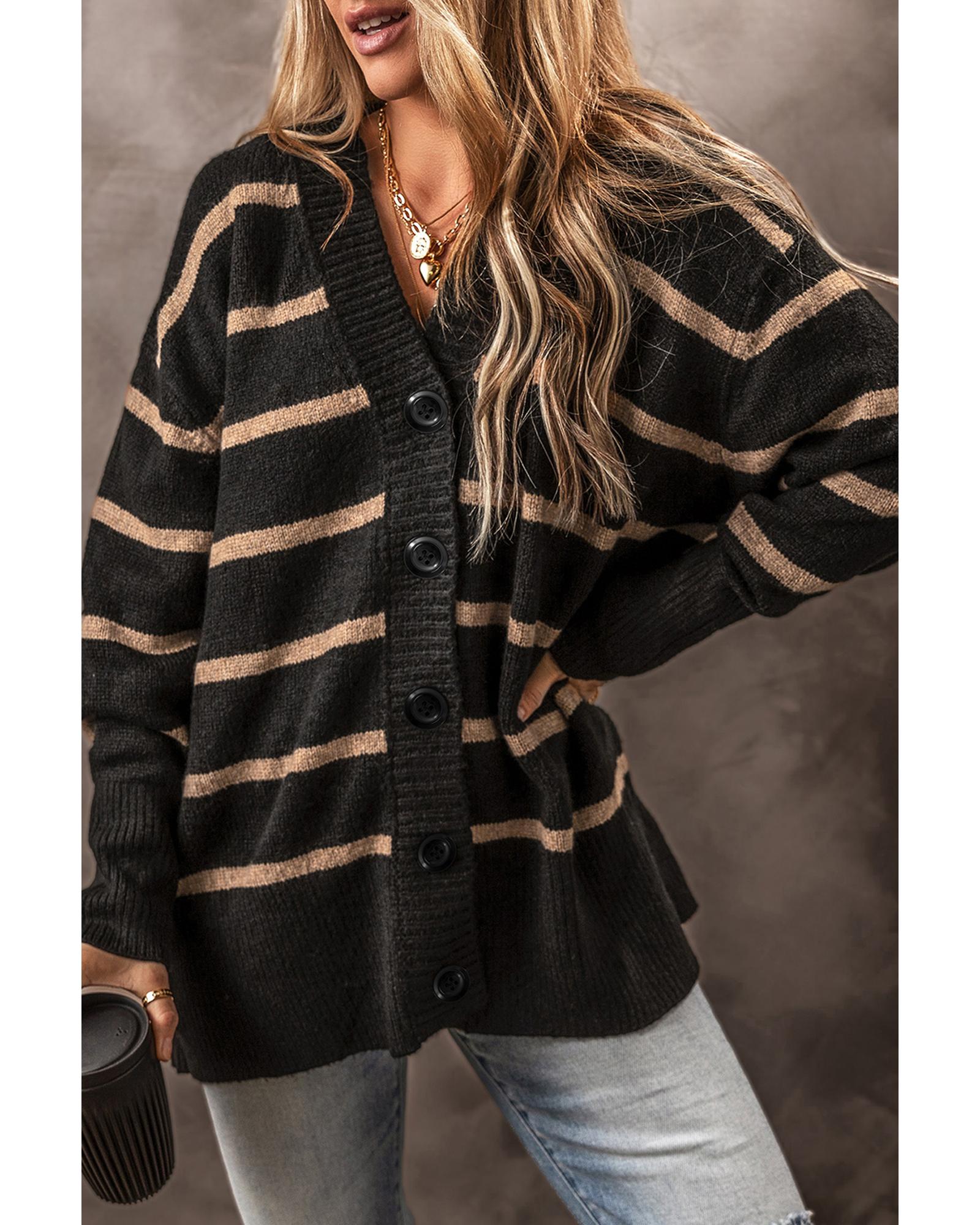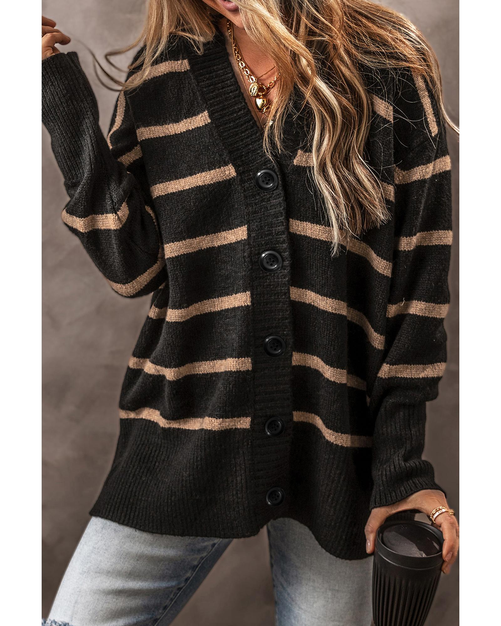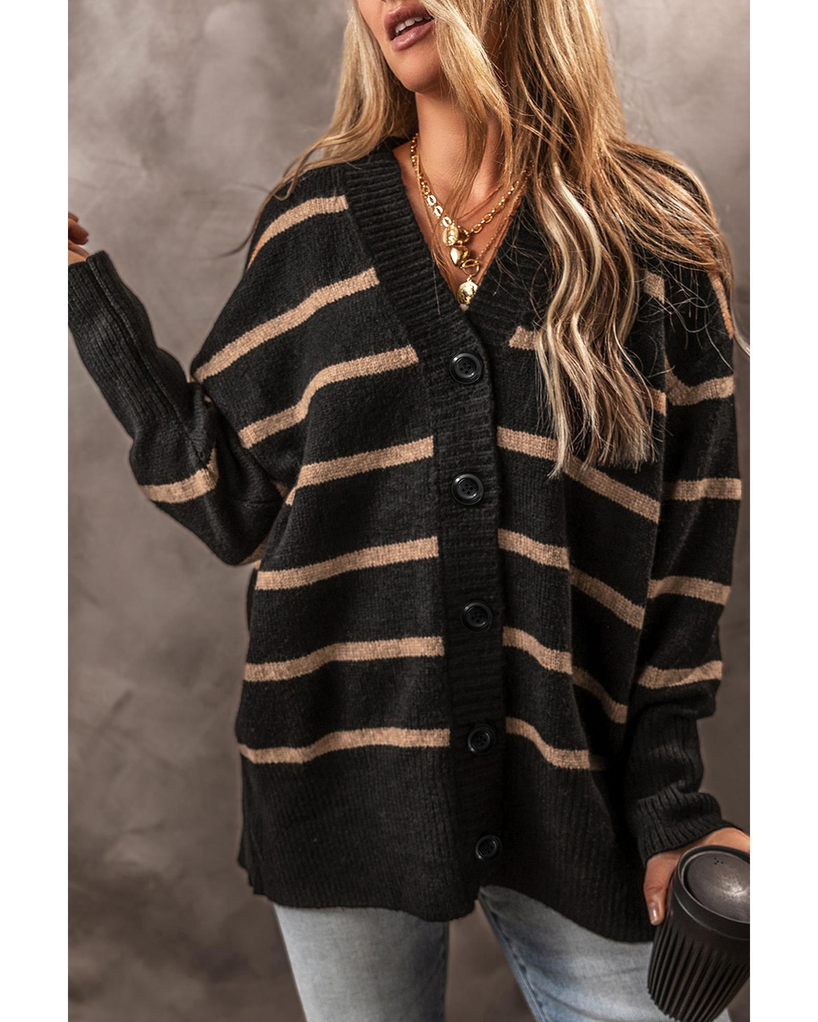Black Stripe Buttoned V Neck Drop Shoulder Loose Cardigan – 2XL