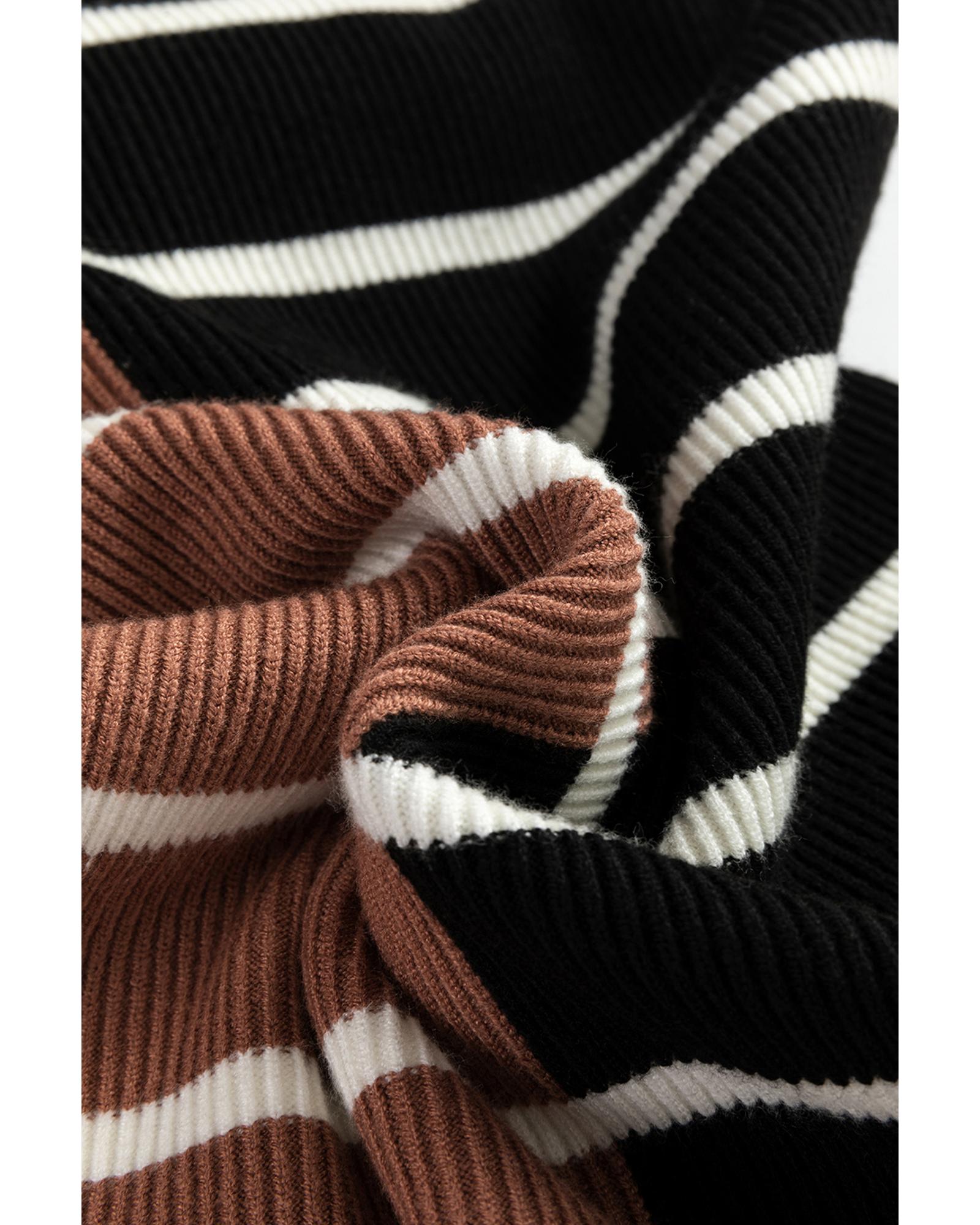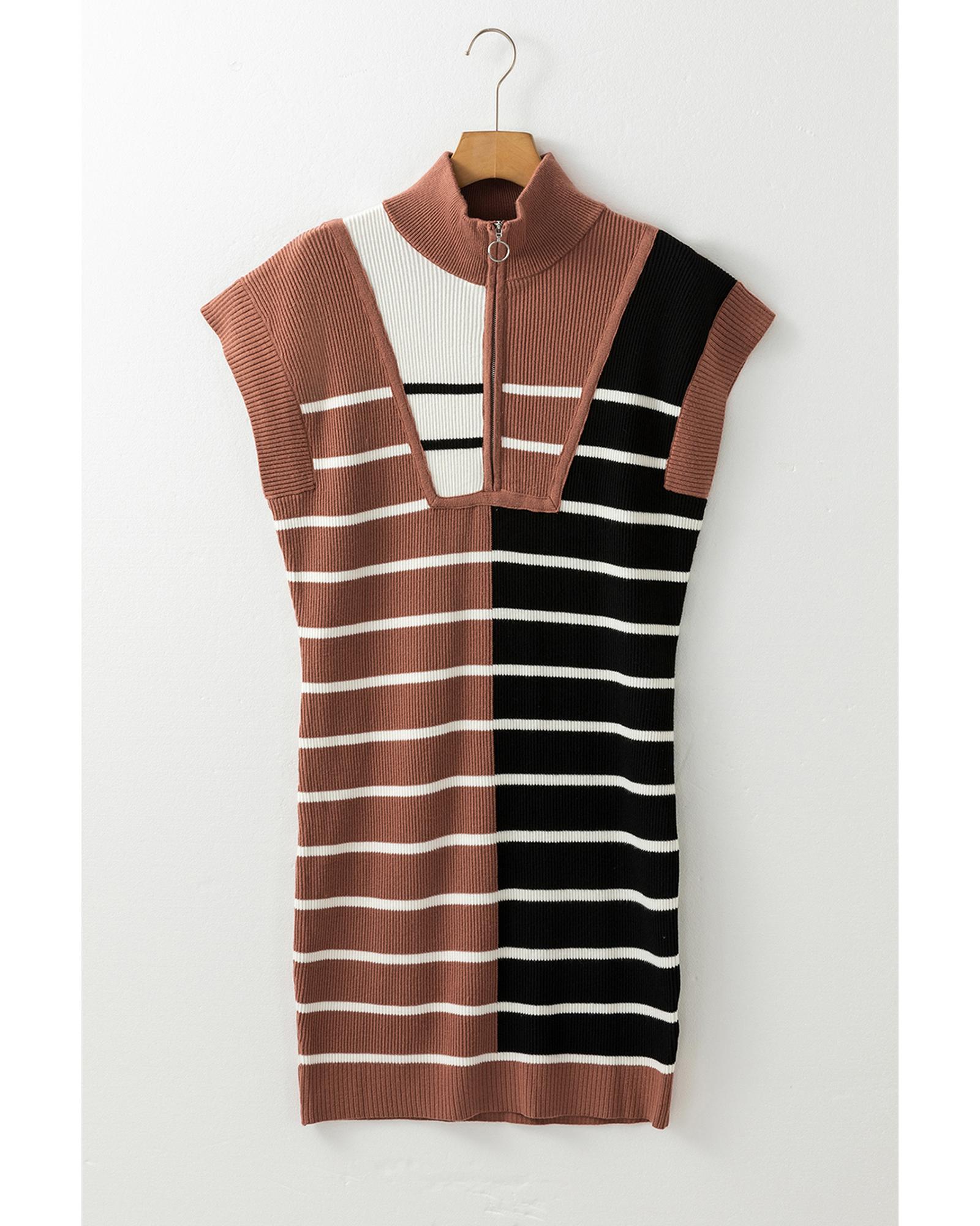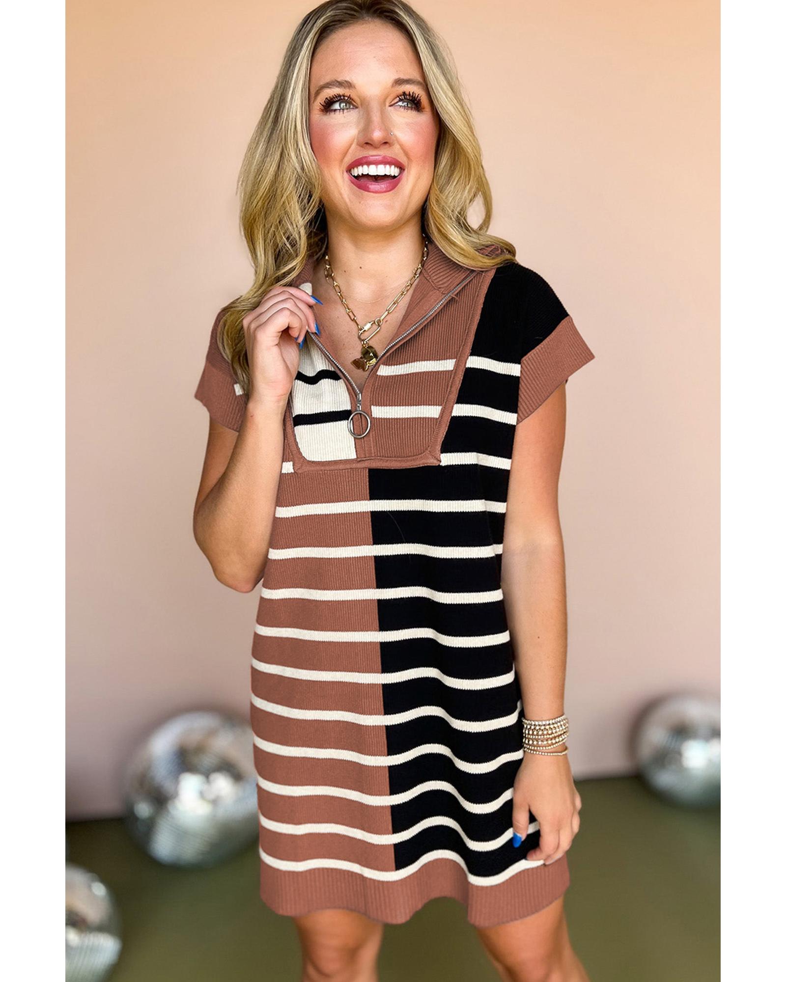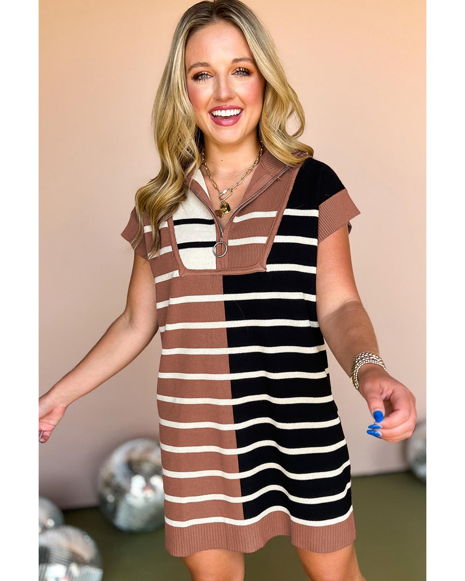 Black Stripe Color Block Quarter Zip Collar Short Sleeve Sweater Dress – XL