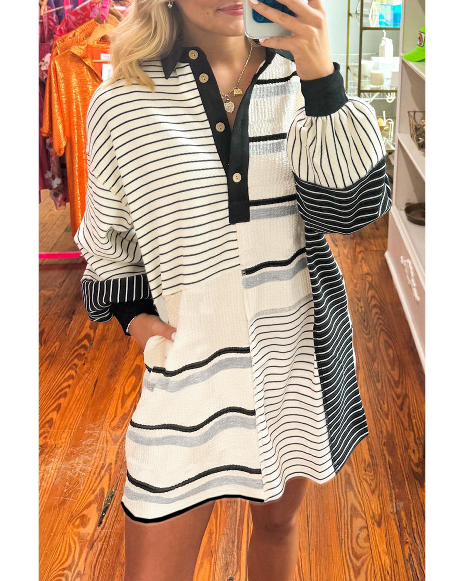 - Black Stripe Colorblock Knit Henley Collar Shift Long Sleeve Mini Dress