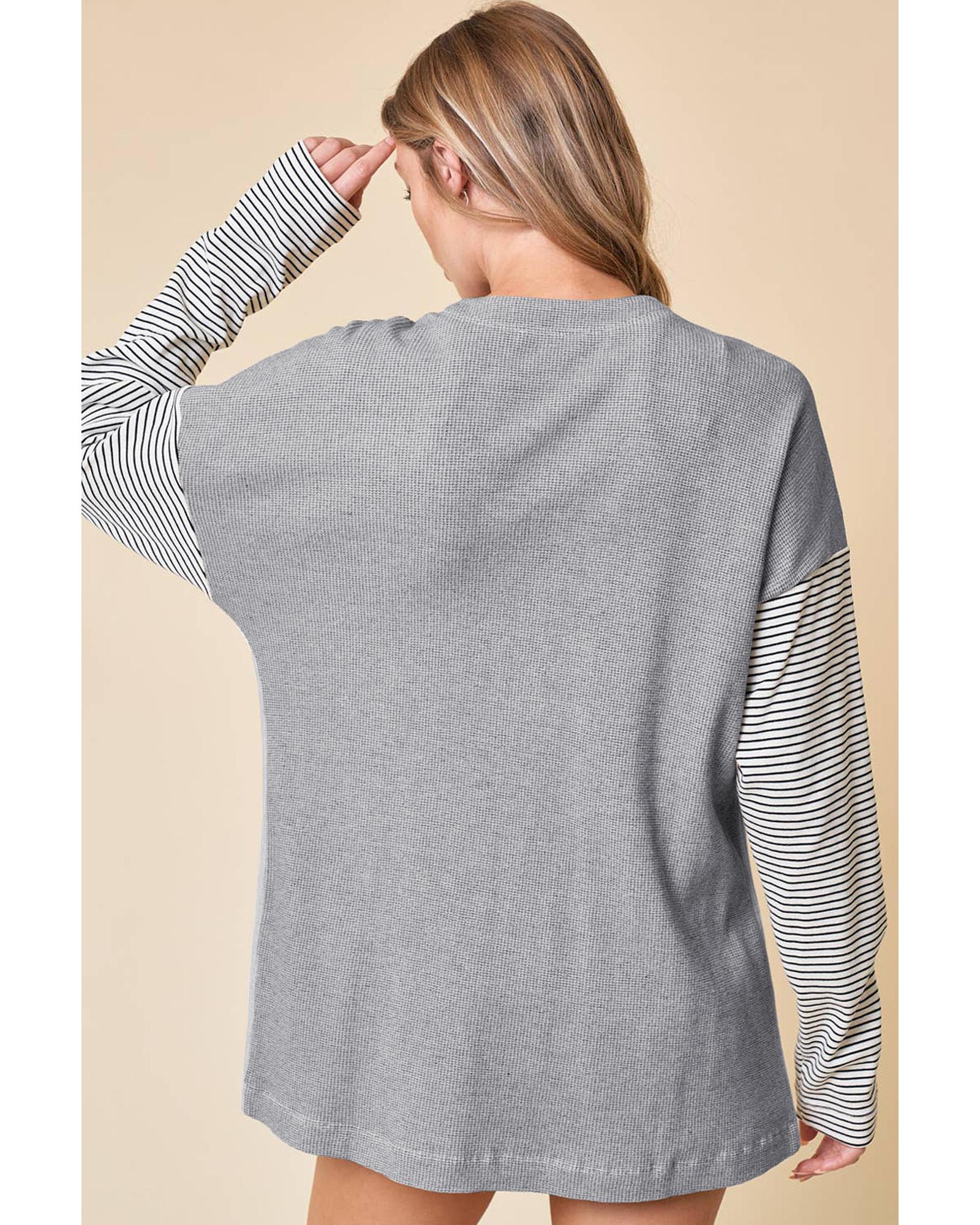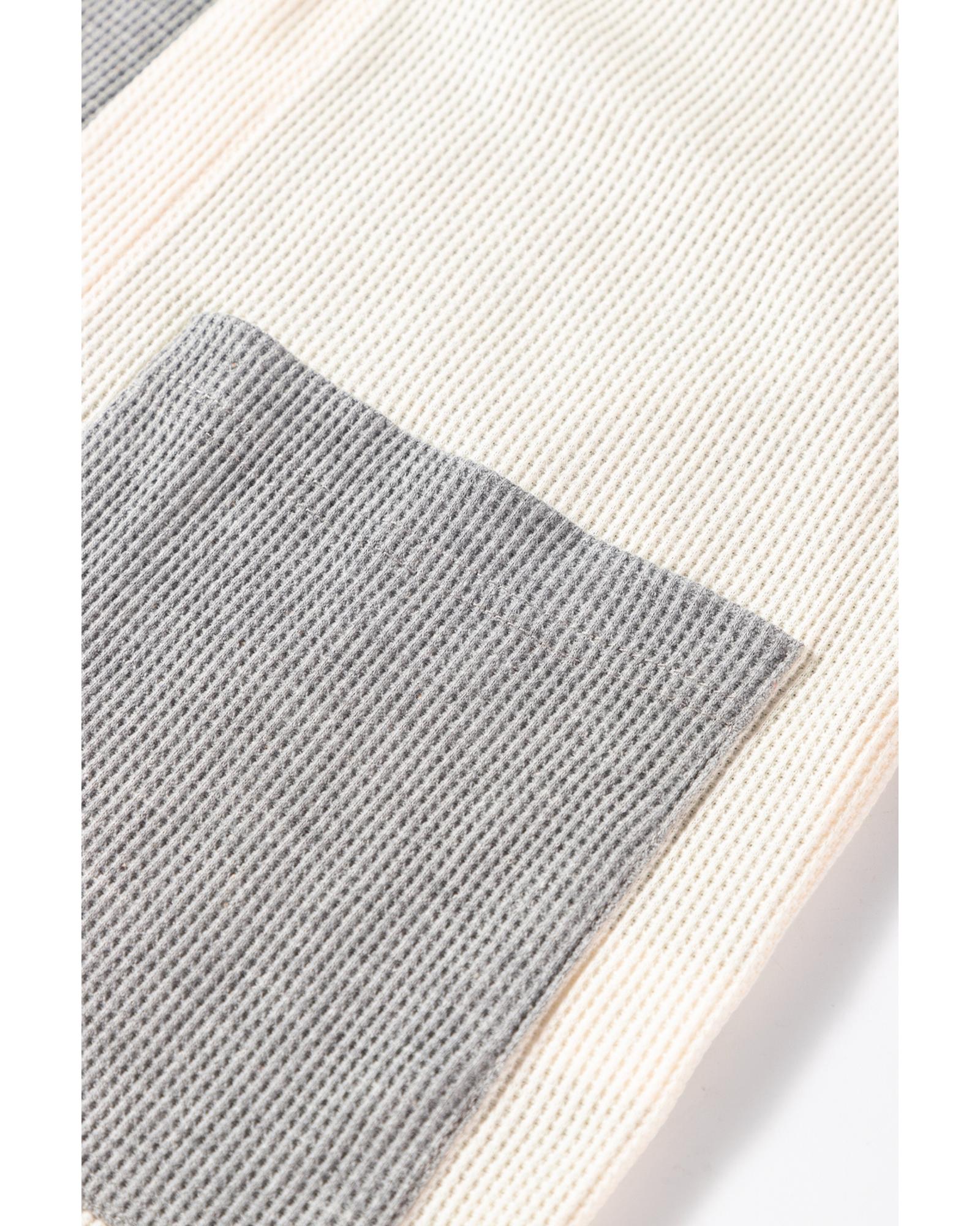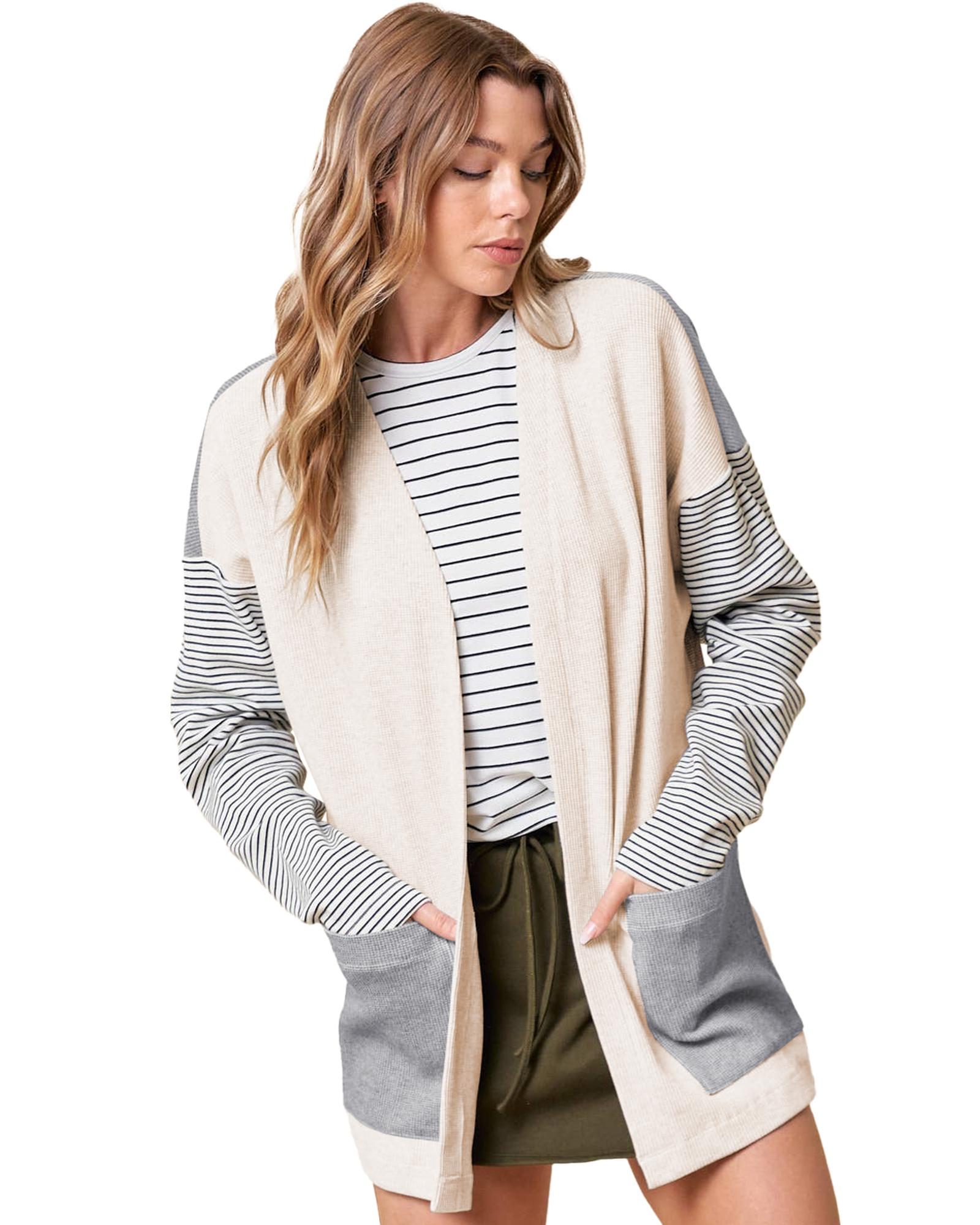Black Stripe Colorblock Patchwork Open Front Cardigan with Pocket – M