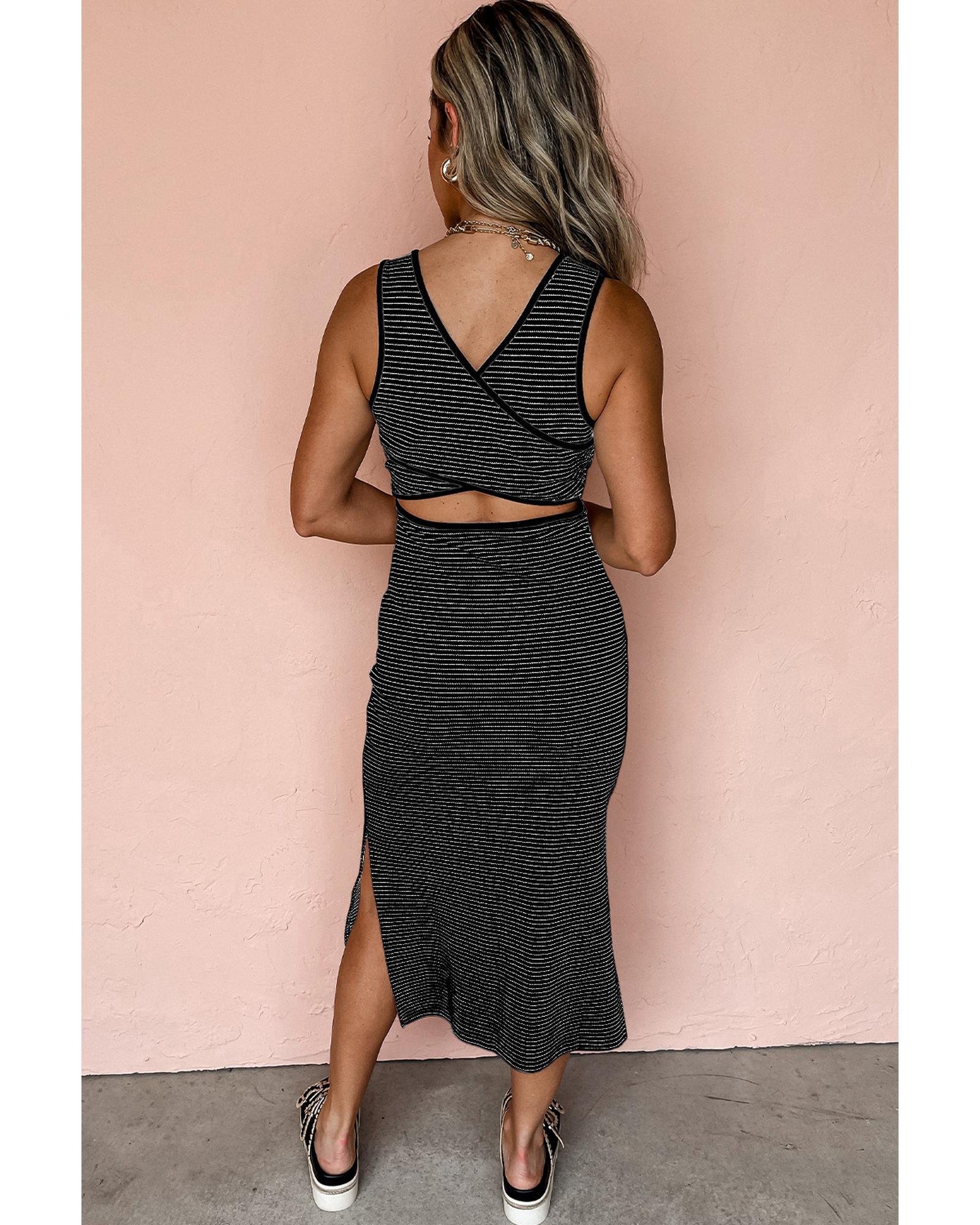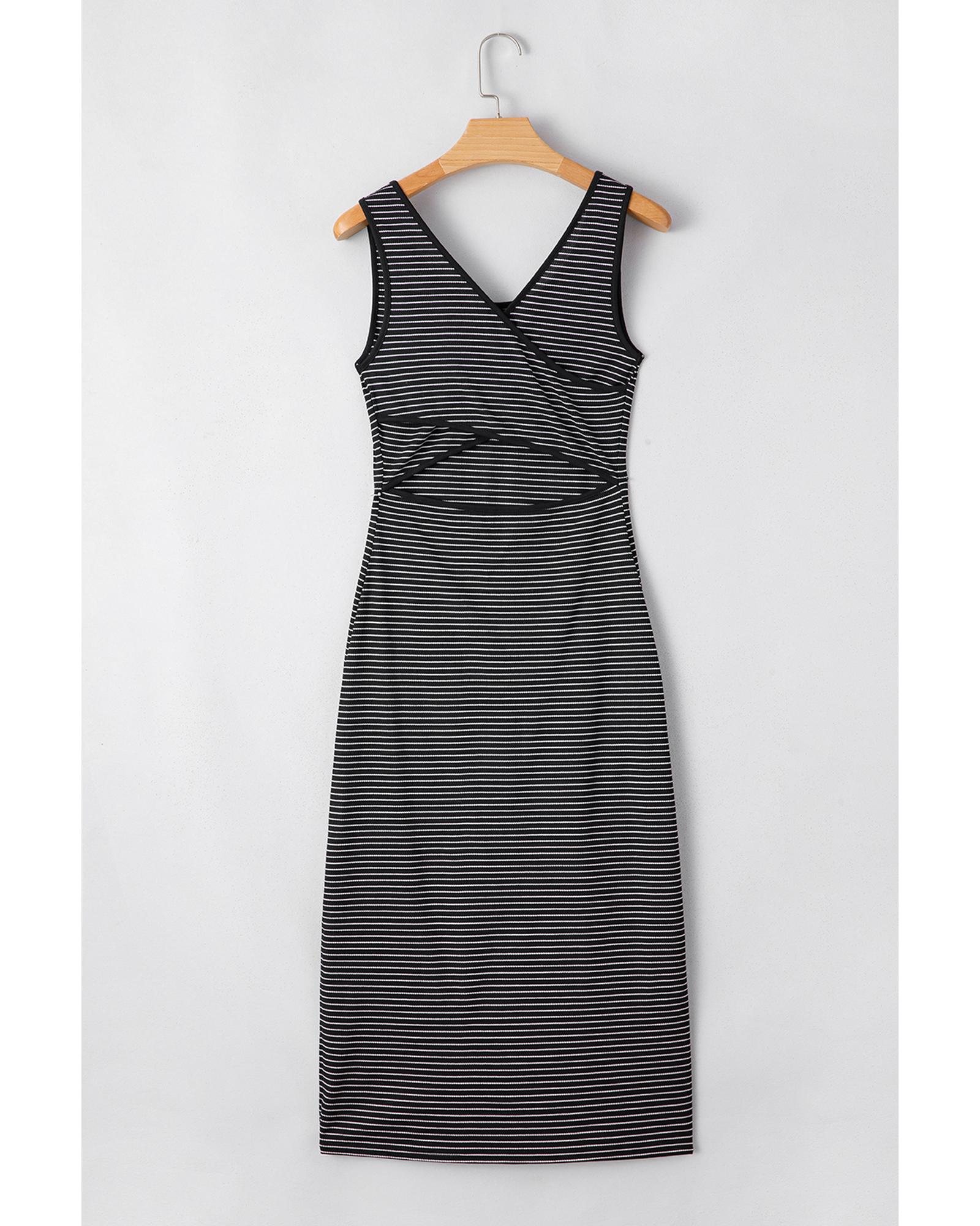 Black Stripe Criss Cross Side Slits Slim Fit Sleeveless Midi Dress – L