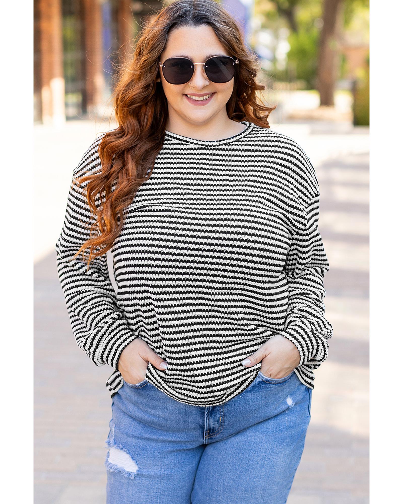 Black Stripe Drop Shoulder Puff Long Sleeve O Neck Plus Size T Shirt – 1X