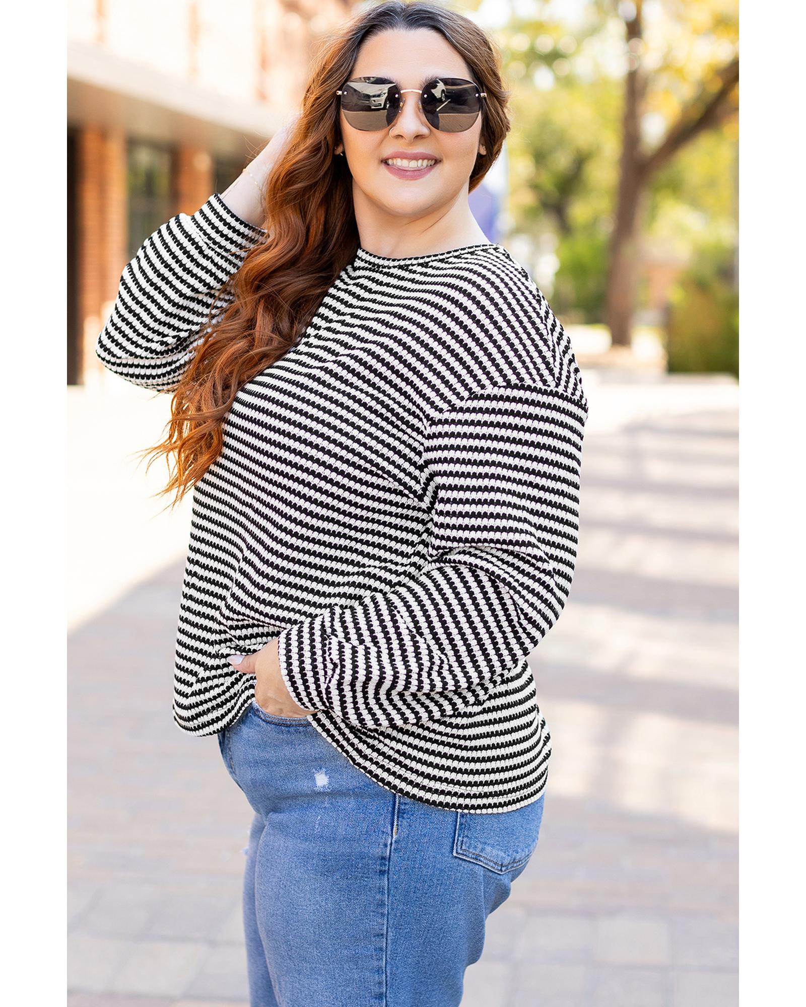 Black Stripe Drop Shoulder Puff Long Sleeve O Neck Plus Size T Shirt – 2X