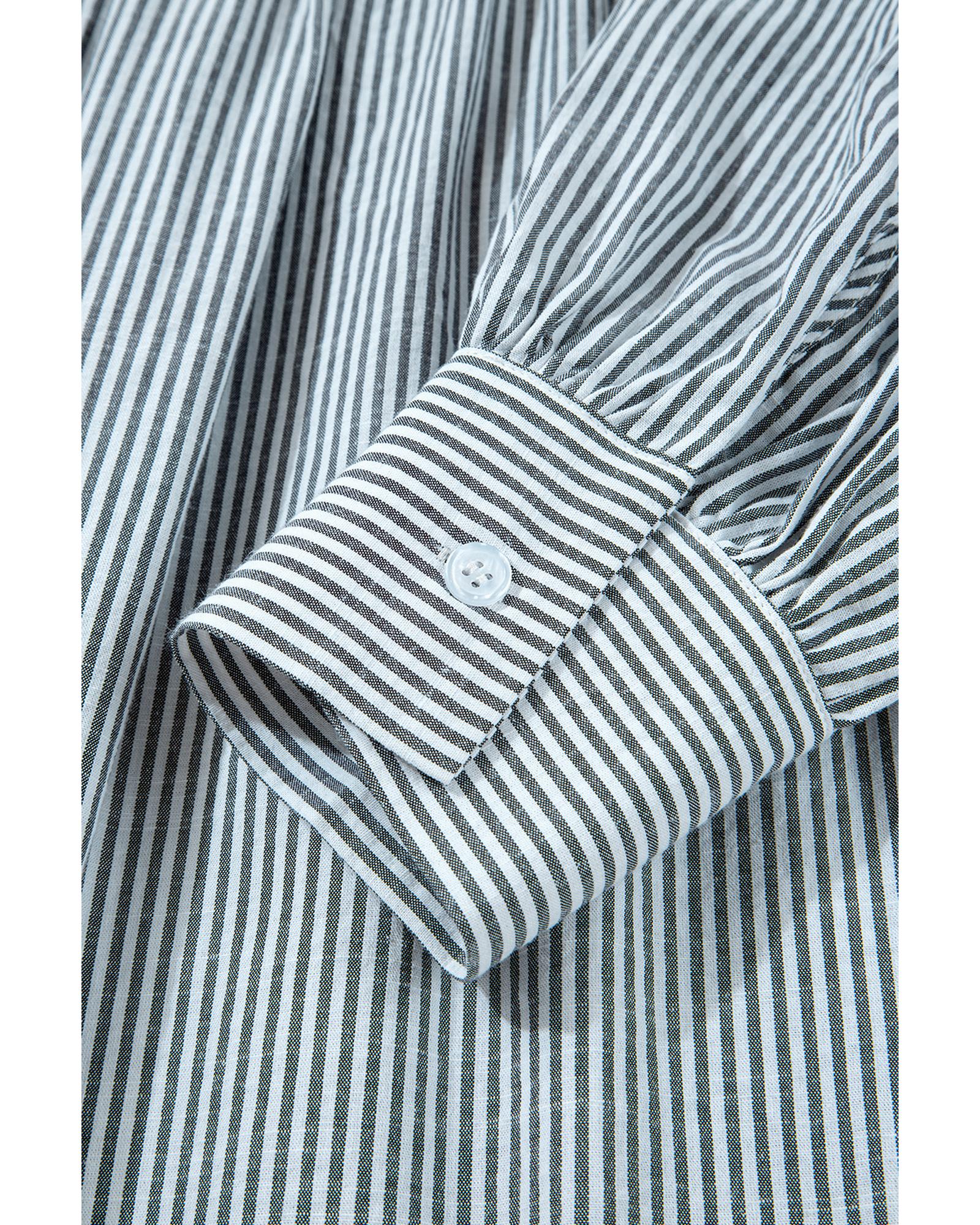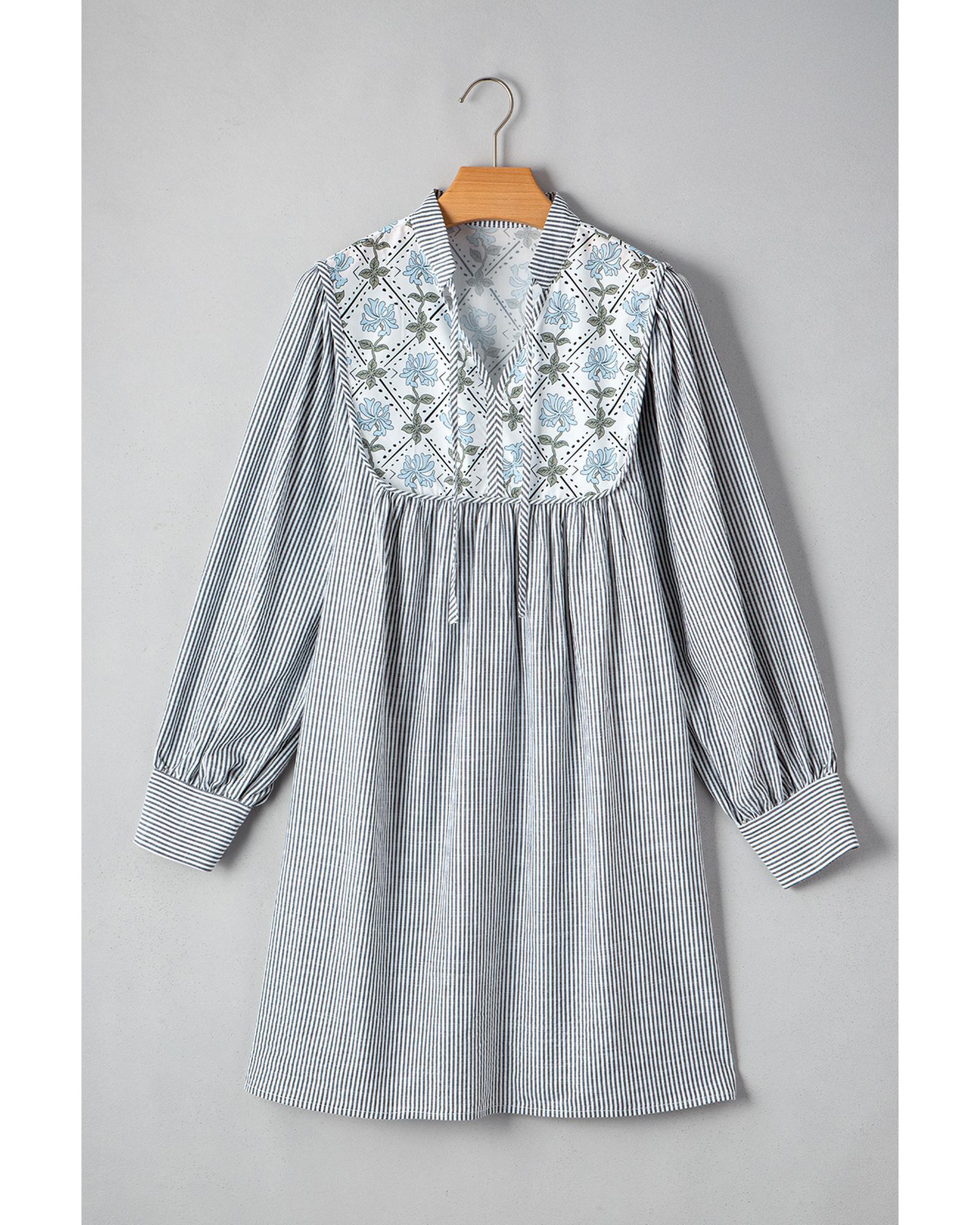 Black Stripe Floral Patchwork Tied V Neck Shift Long Sleeve Mini Dress – L
