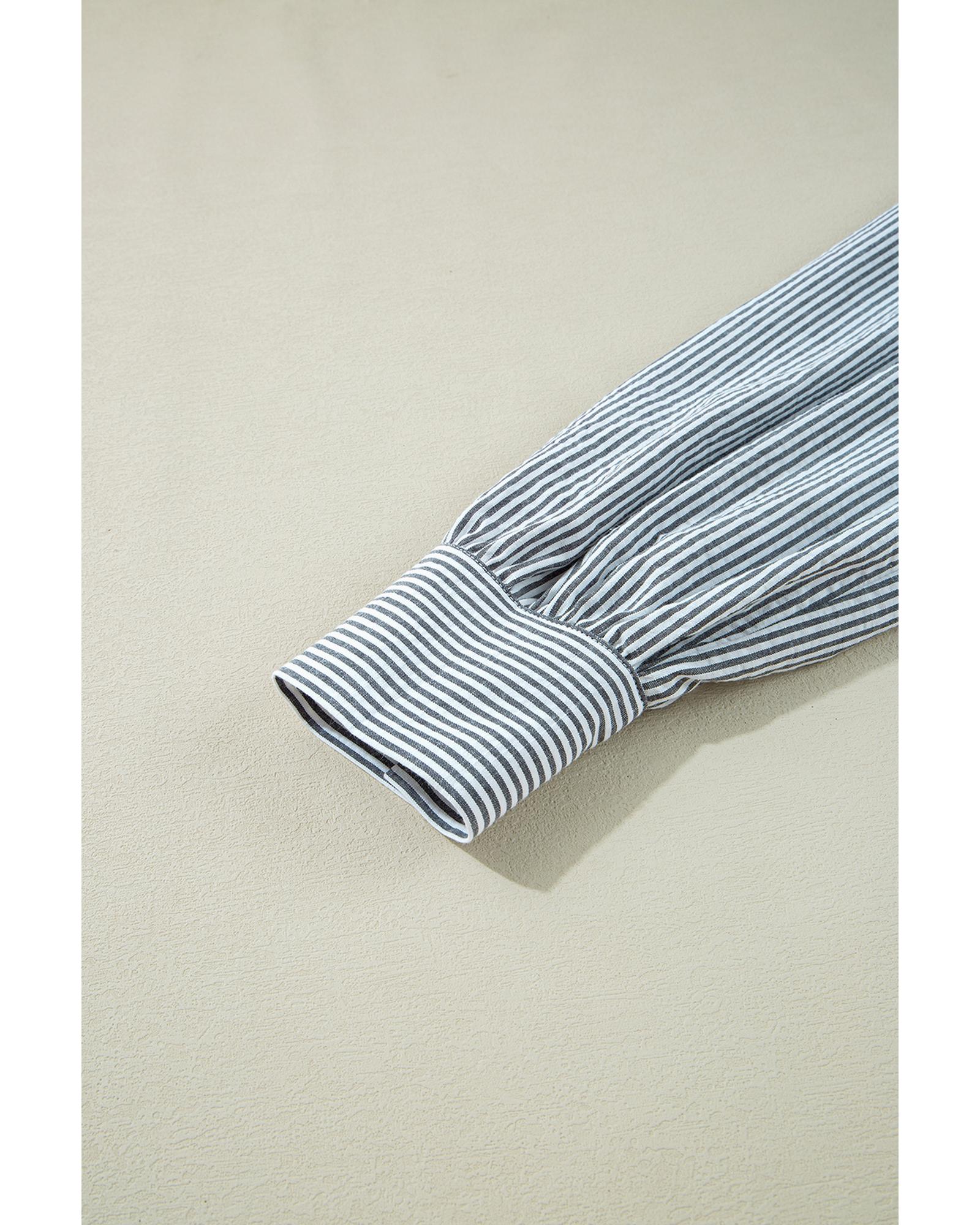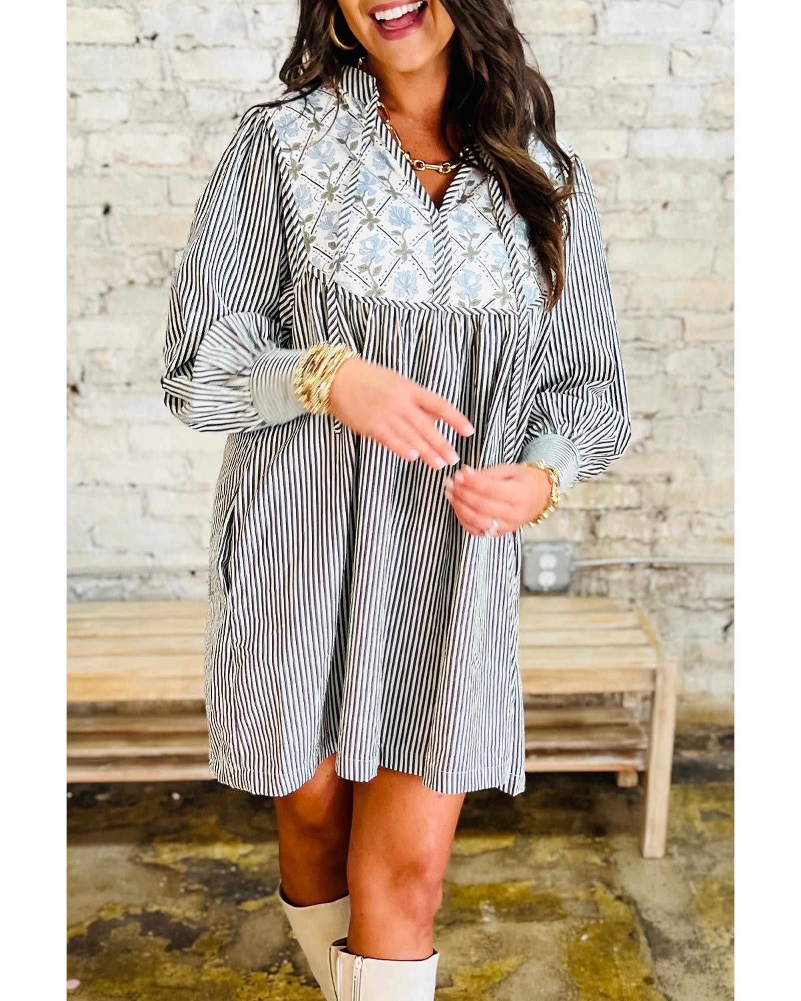 Black Stripe Floral Patchwork Tied V Neck Shift Long Sleeve Mini Dress – M