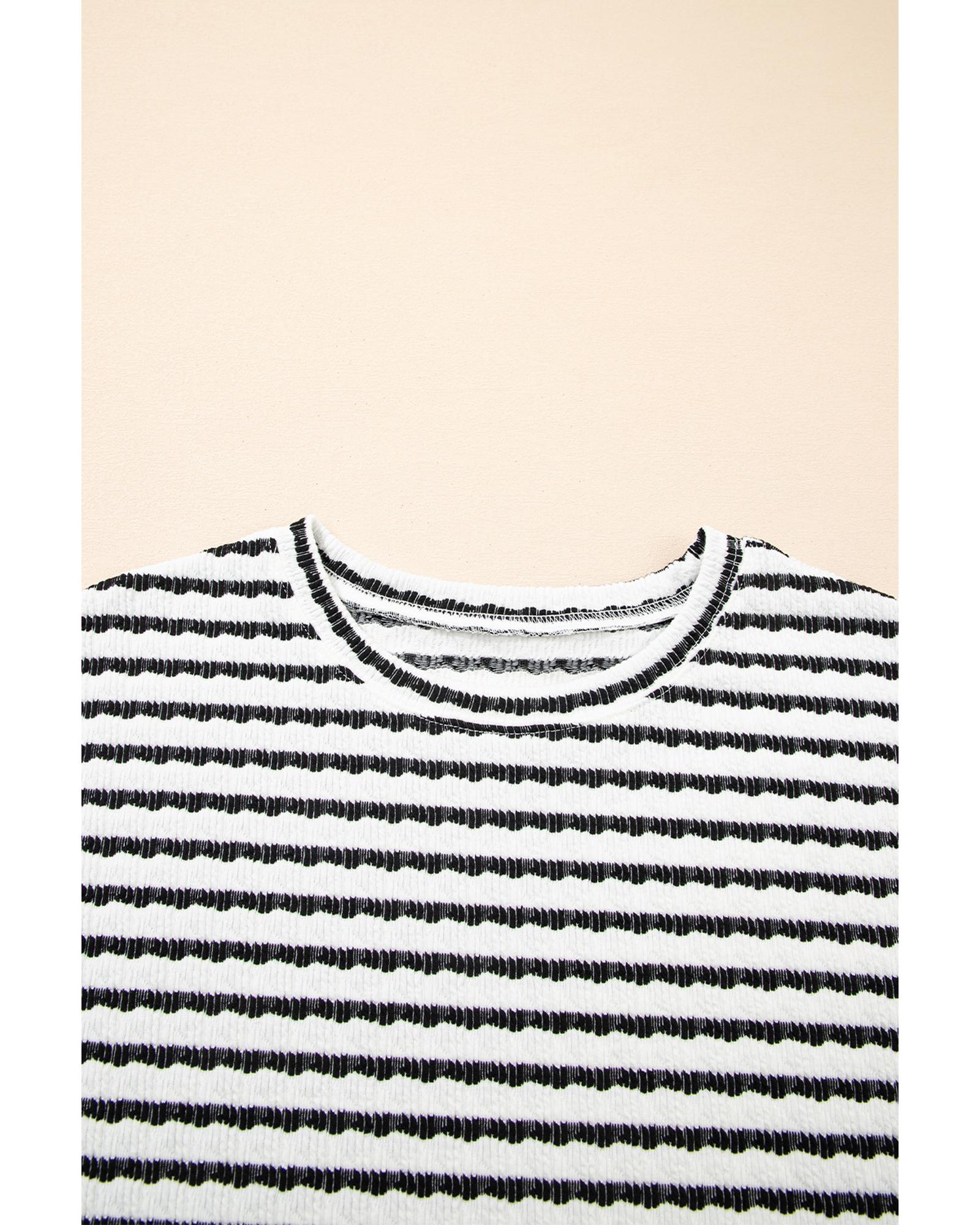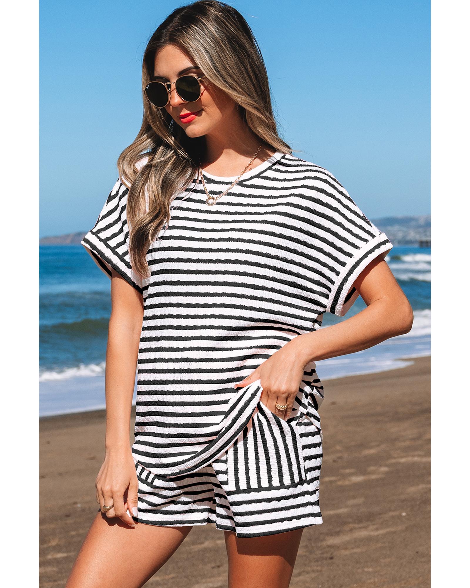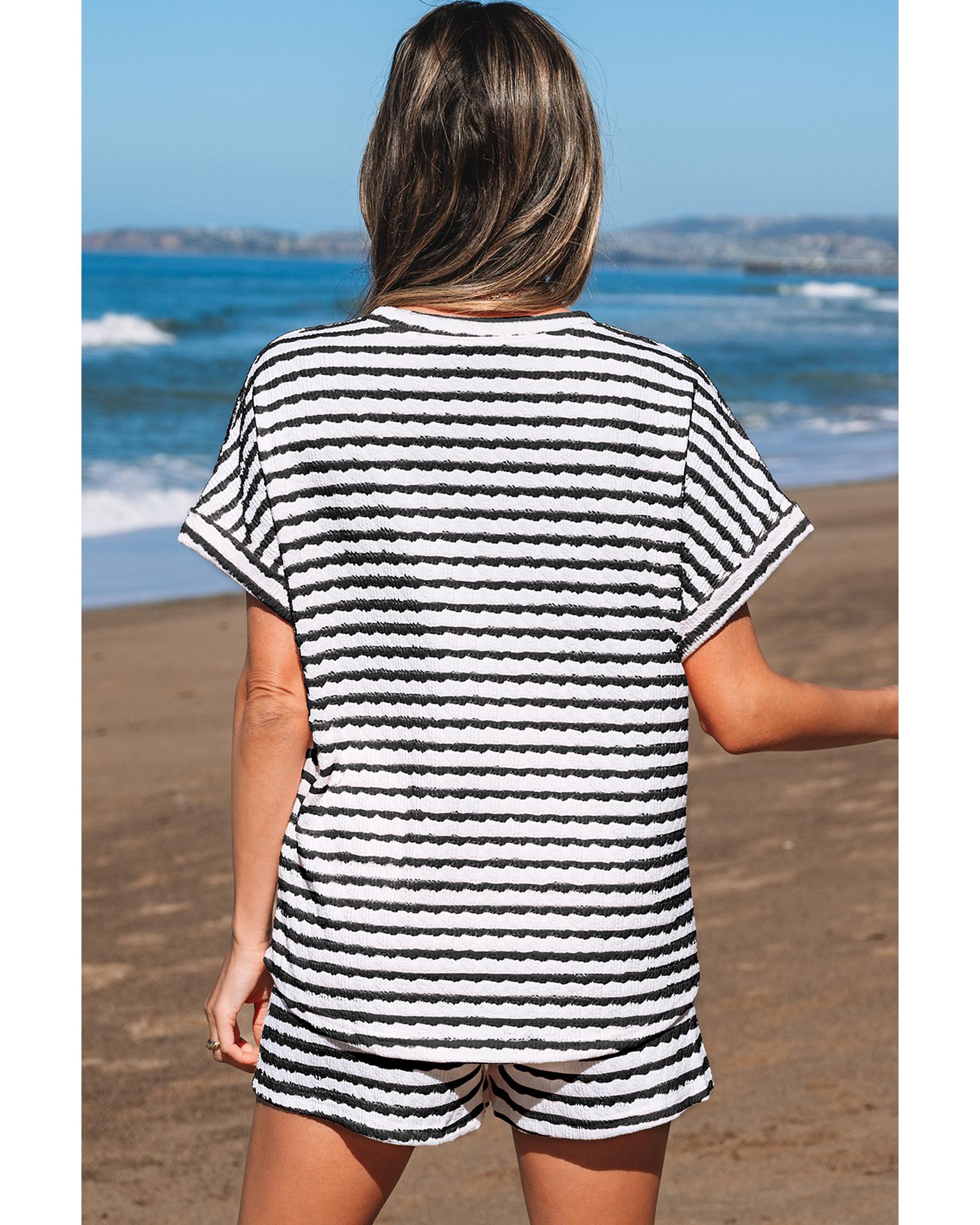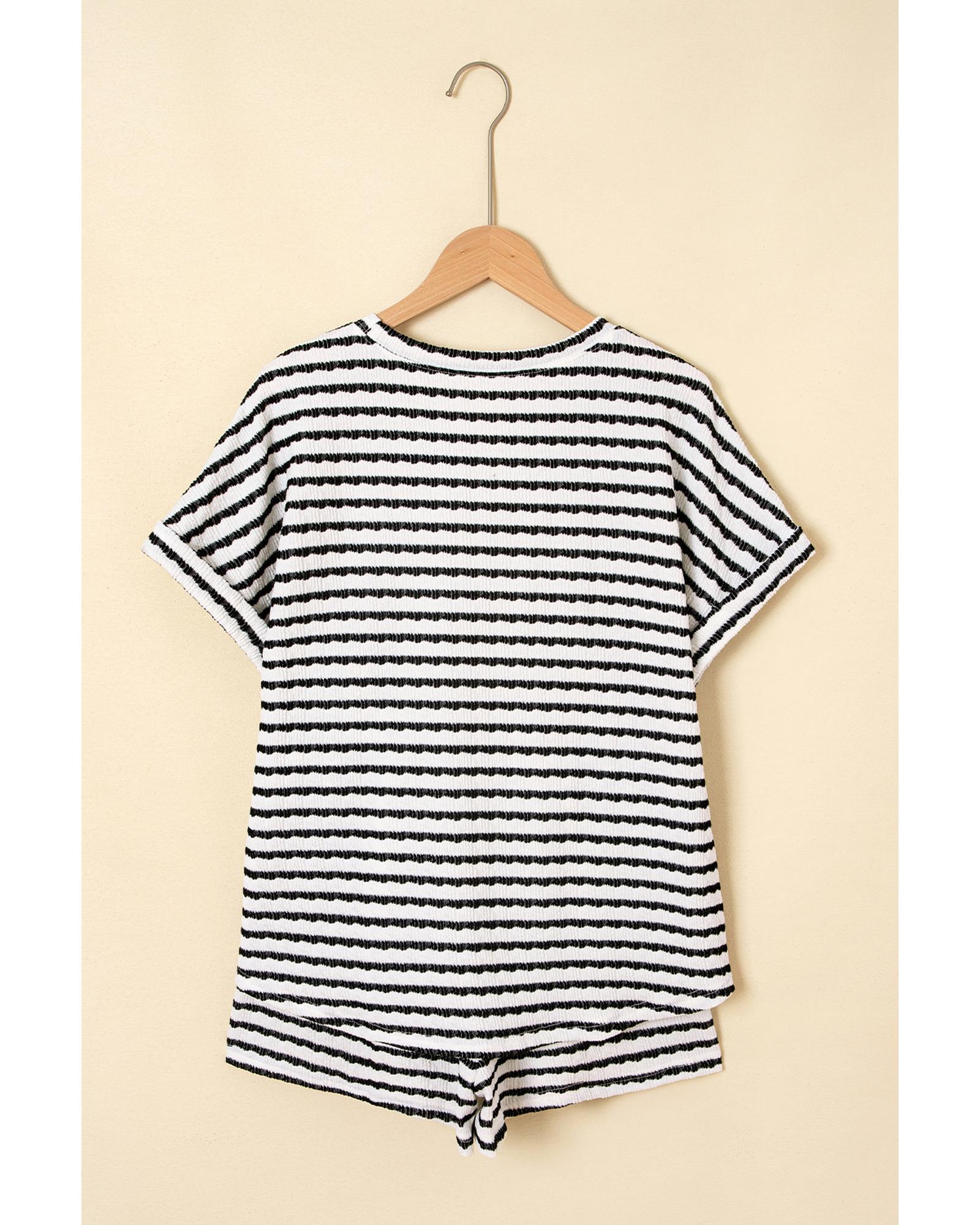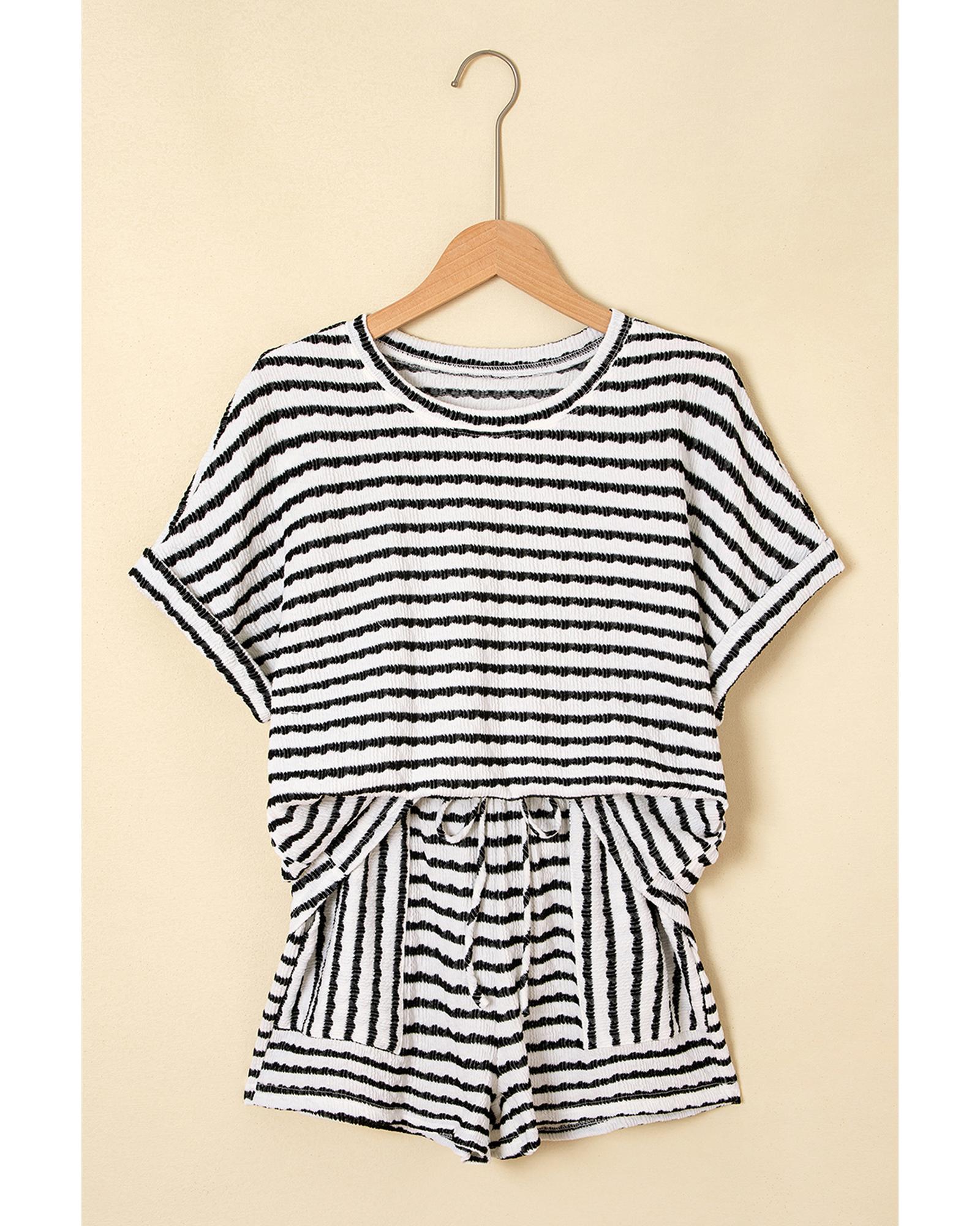 Black Stripe Knitted Short Sleeve Top and Drawstring Shorts Set – L