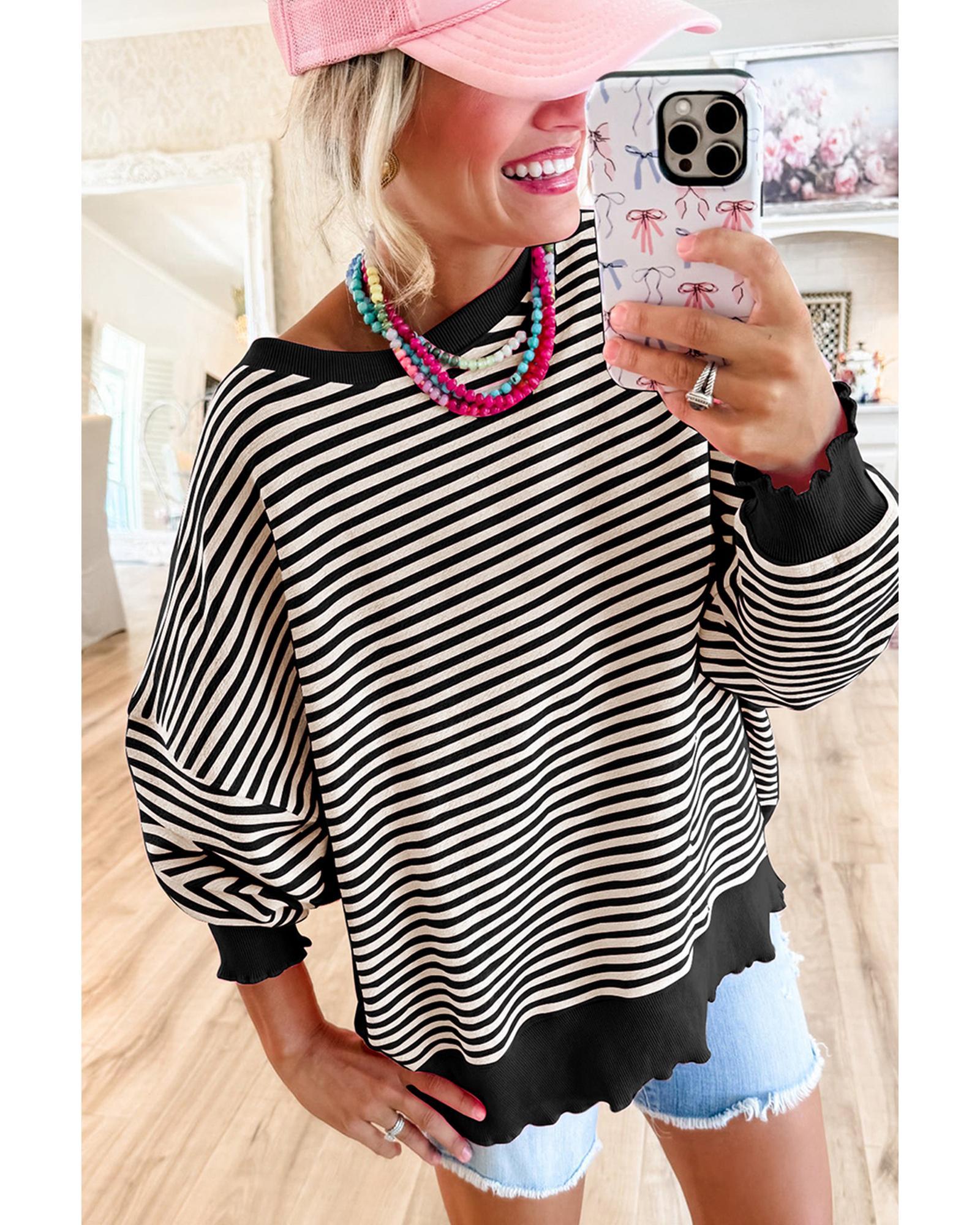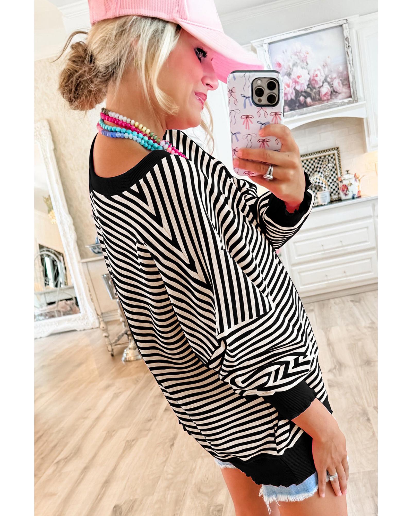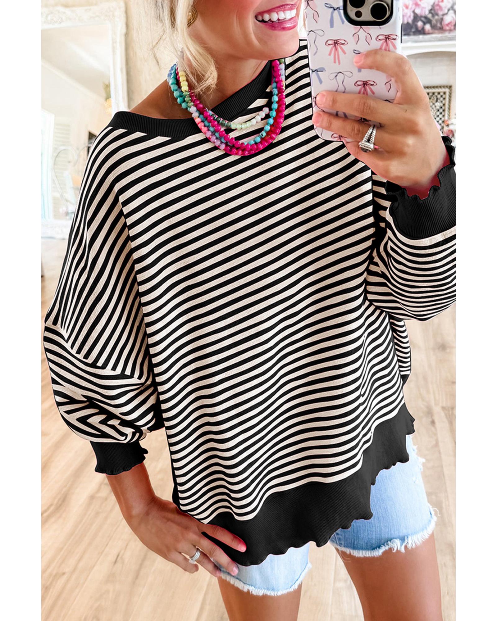 • Black Stripe Loose Drop Shoulder Long Sleeve Top