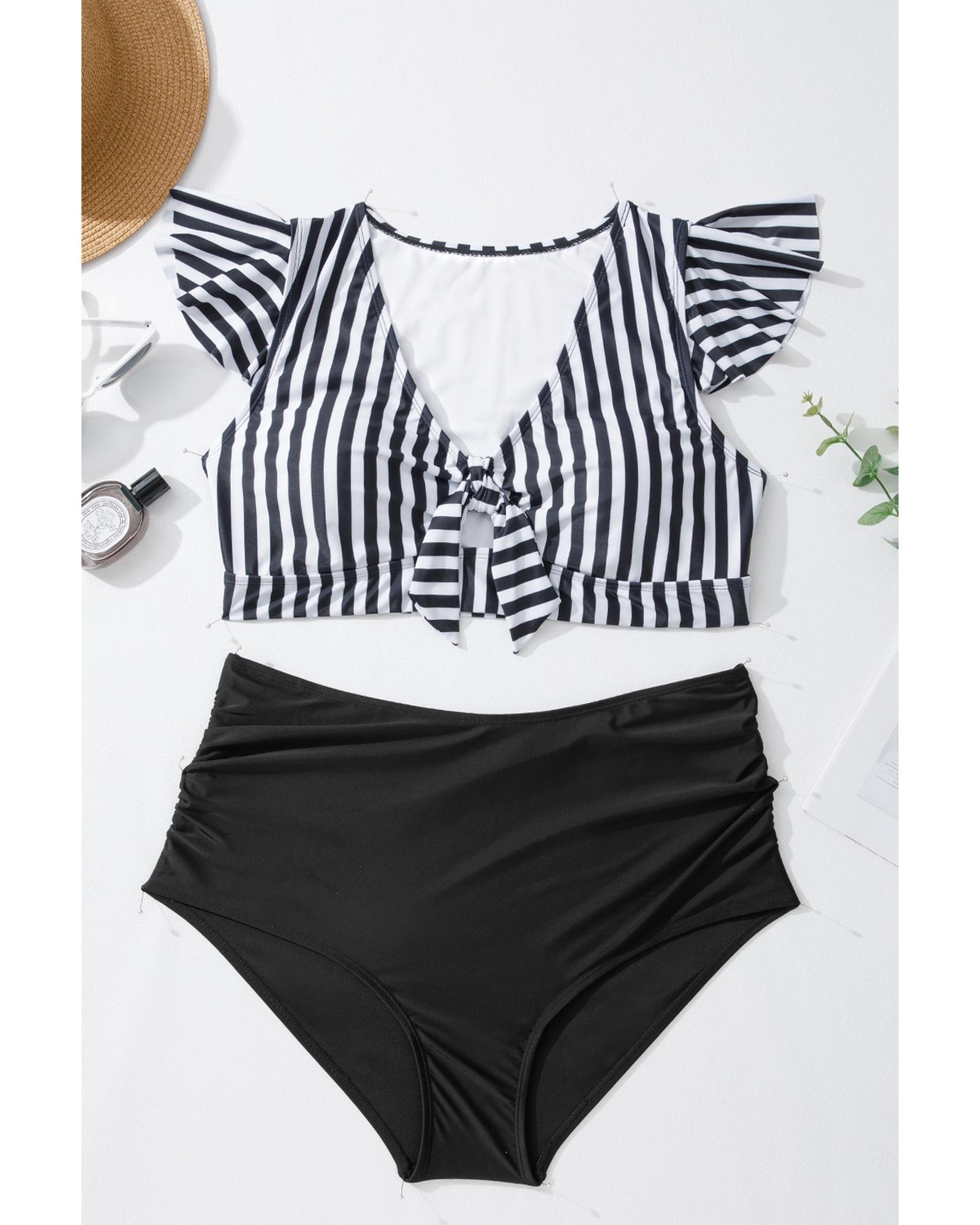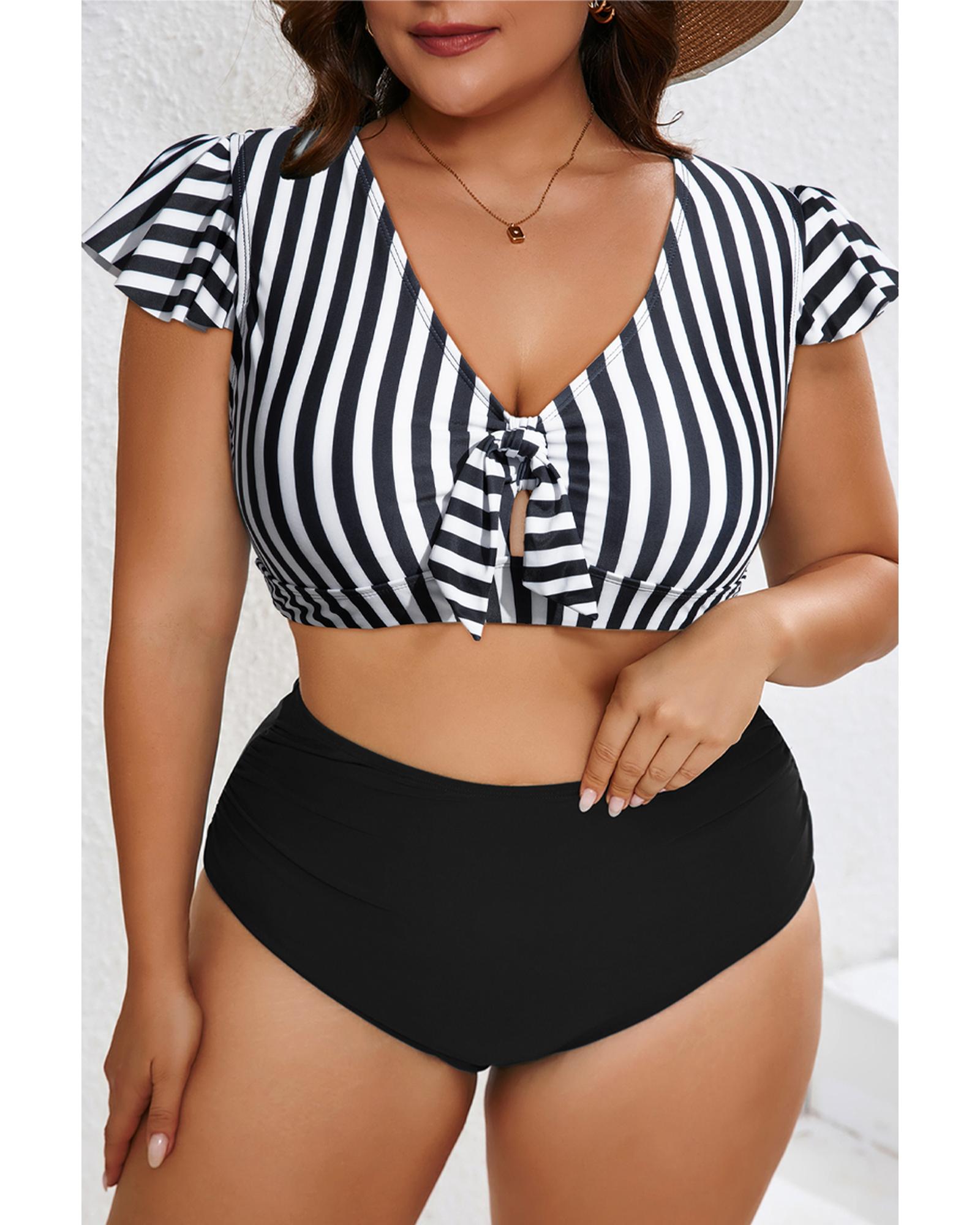Black Stripe Plus Size Knot Cutout Ruffle Sleeve and High Waisted 2pcs Swimsuit – 2X