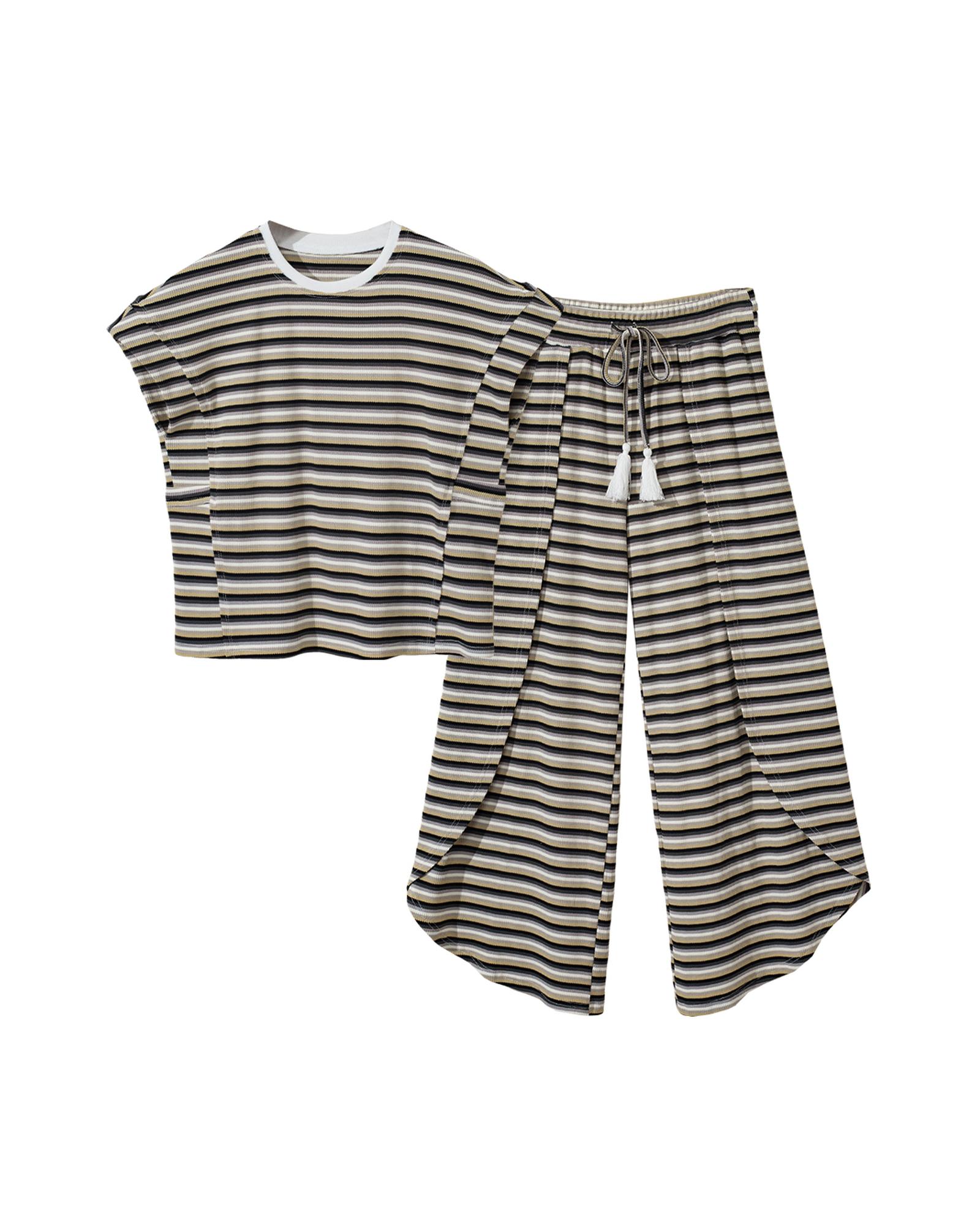 Black Stripe Rainbow Tee Tasseled String Wide Leg Pants Set – L