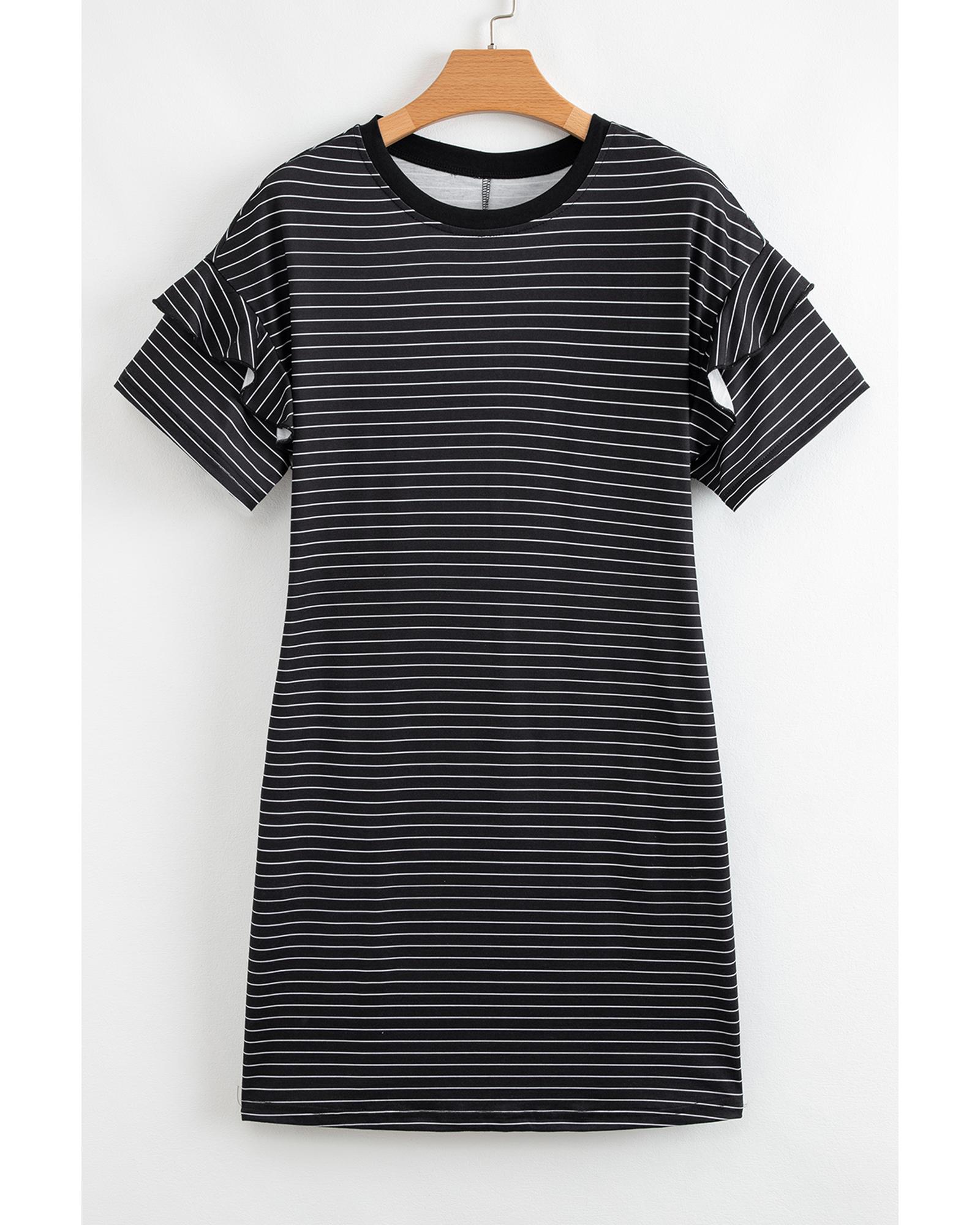 Black Stripe Ruffled Short Sleeve Crew Neck T Shirt Shift Mini Dress – XL