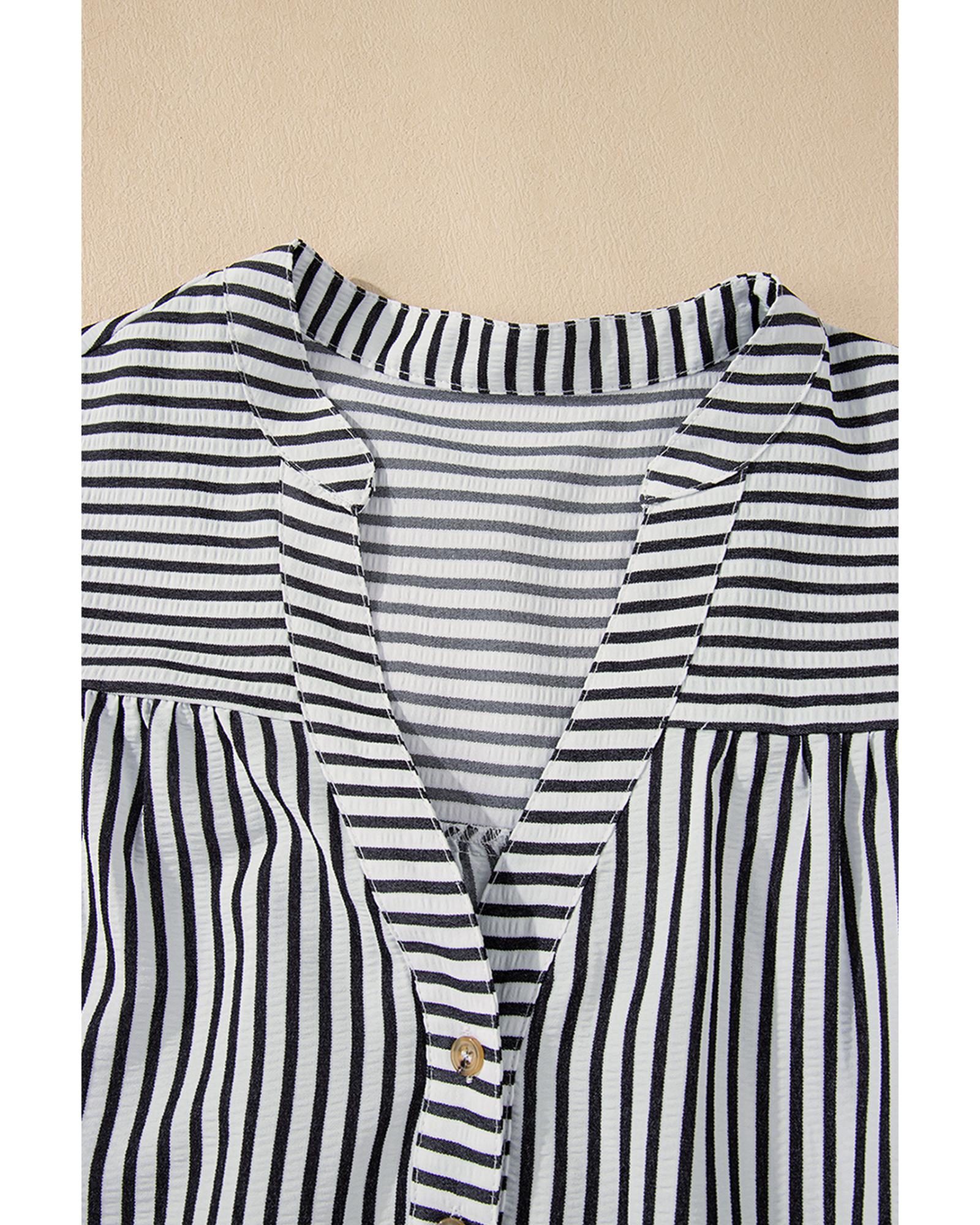 Black Stripe Short Sleeve Buttoned V Neck Pocketed Plus Size Mini Dress – 4X
