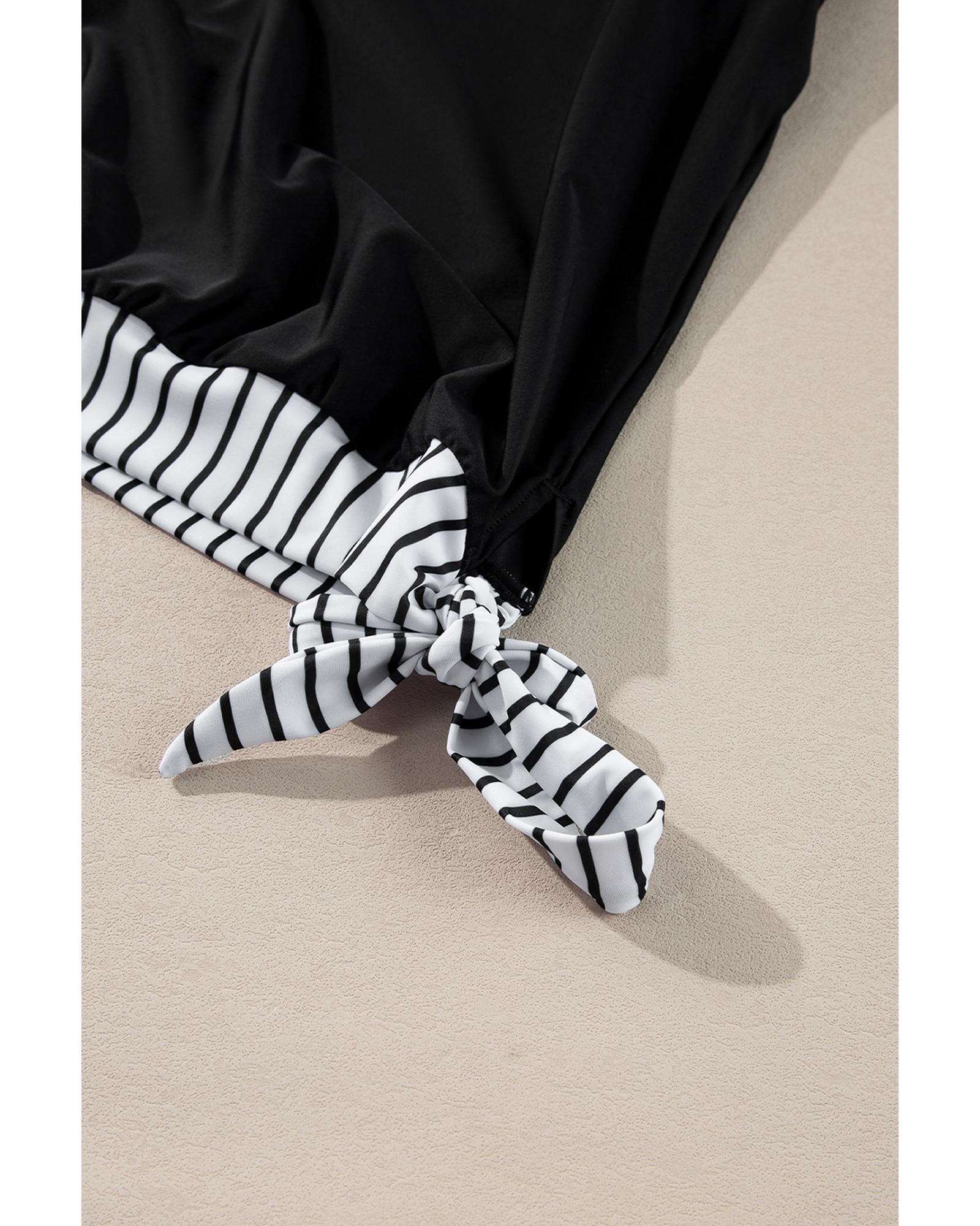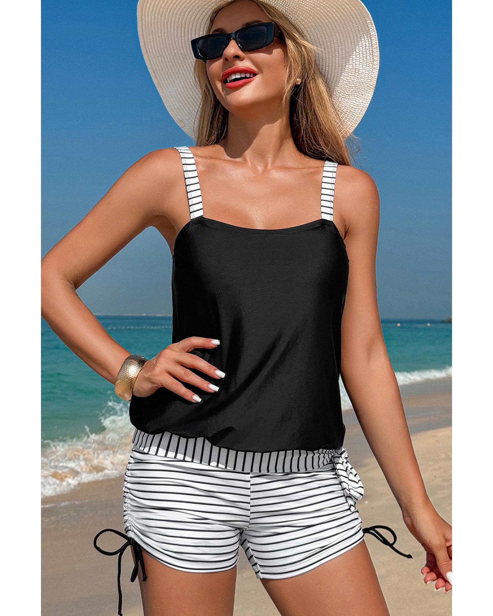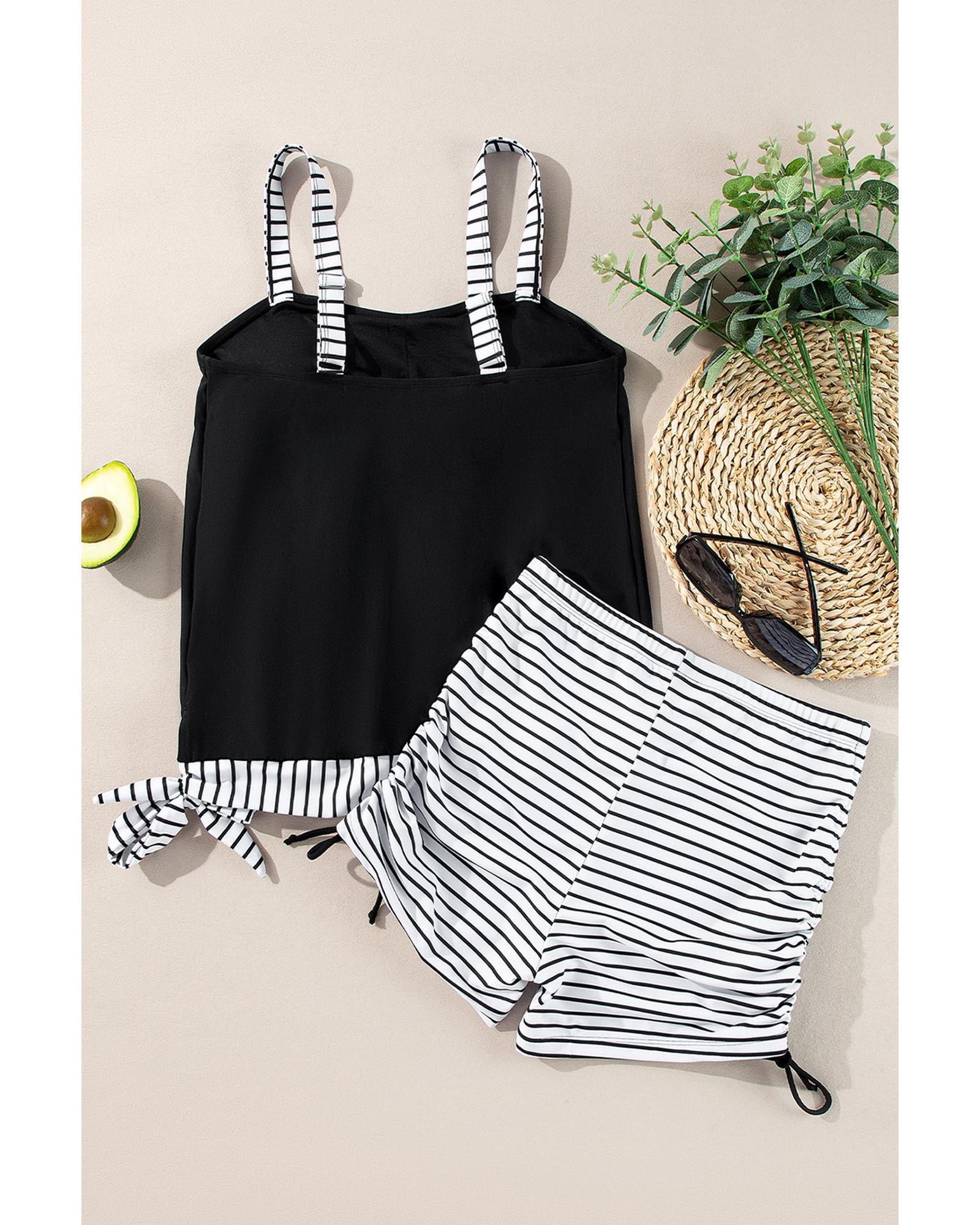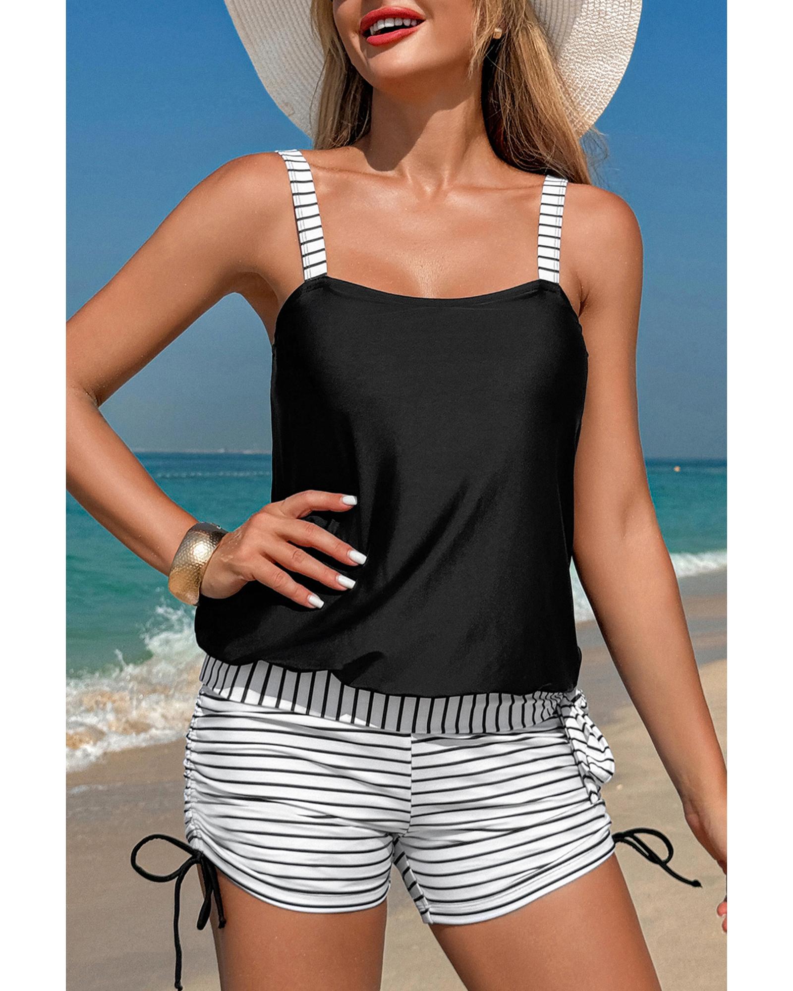 Black Striped Patchwork Side Drawstring Bottoms Tankini Set – S