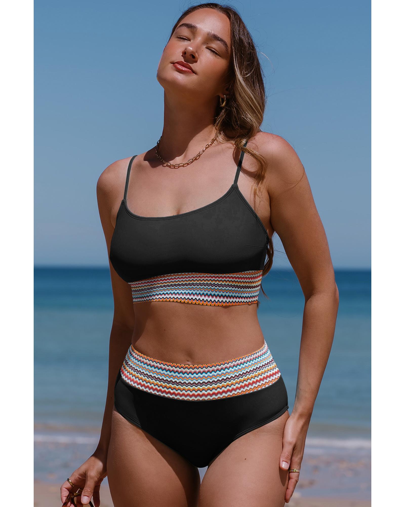 - Black Striped Patchwork Spaghetti Strap High Waist Bikini Swimsuit