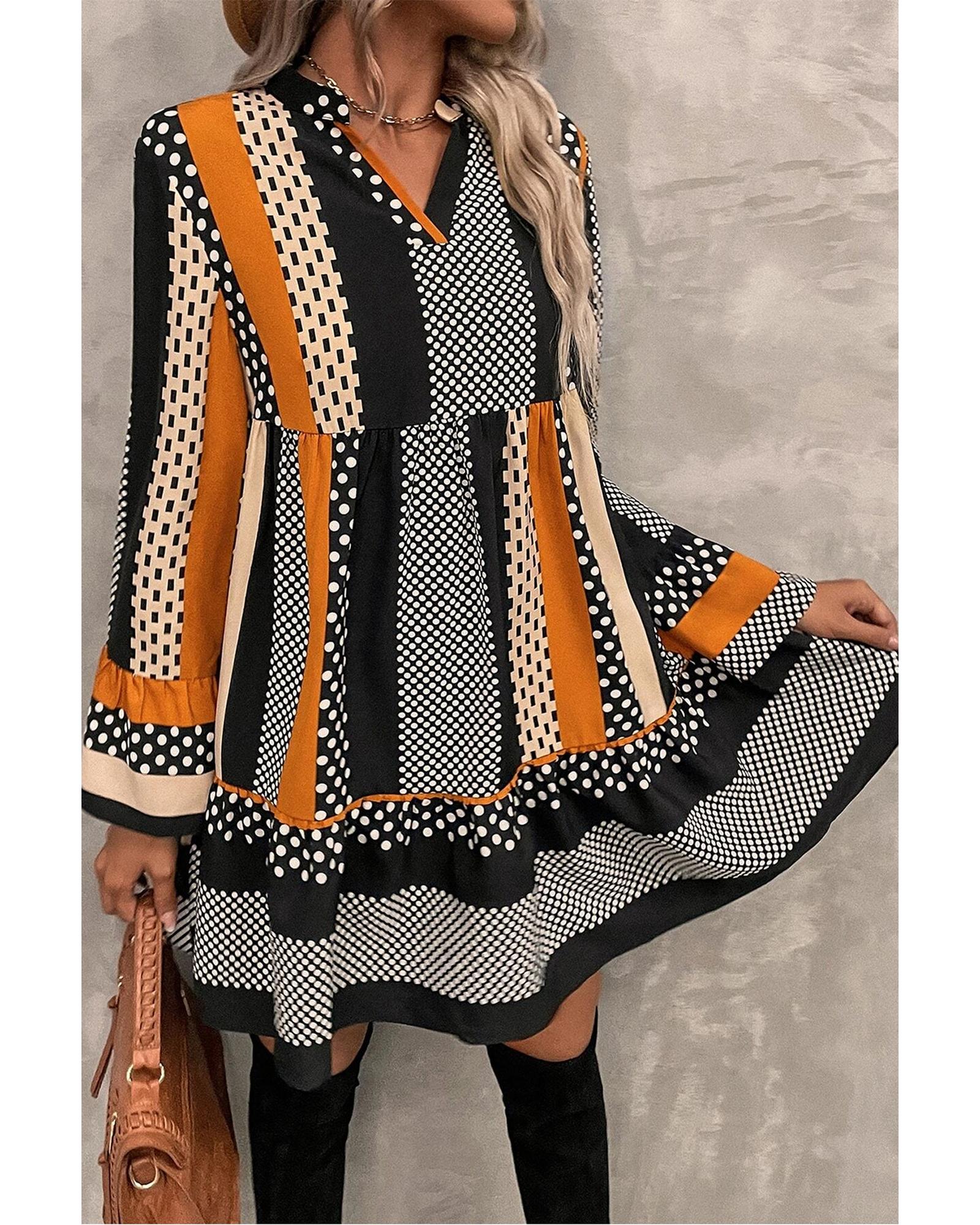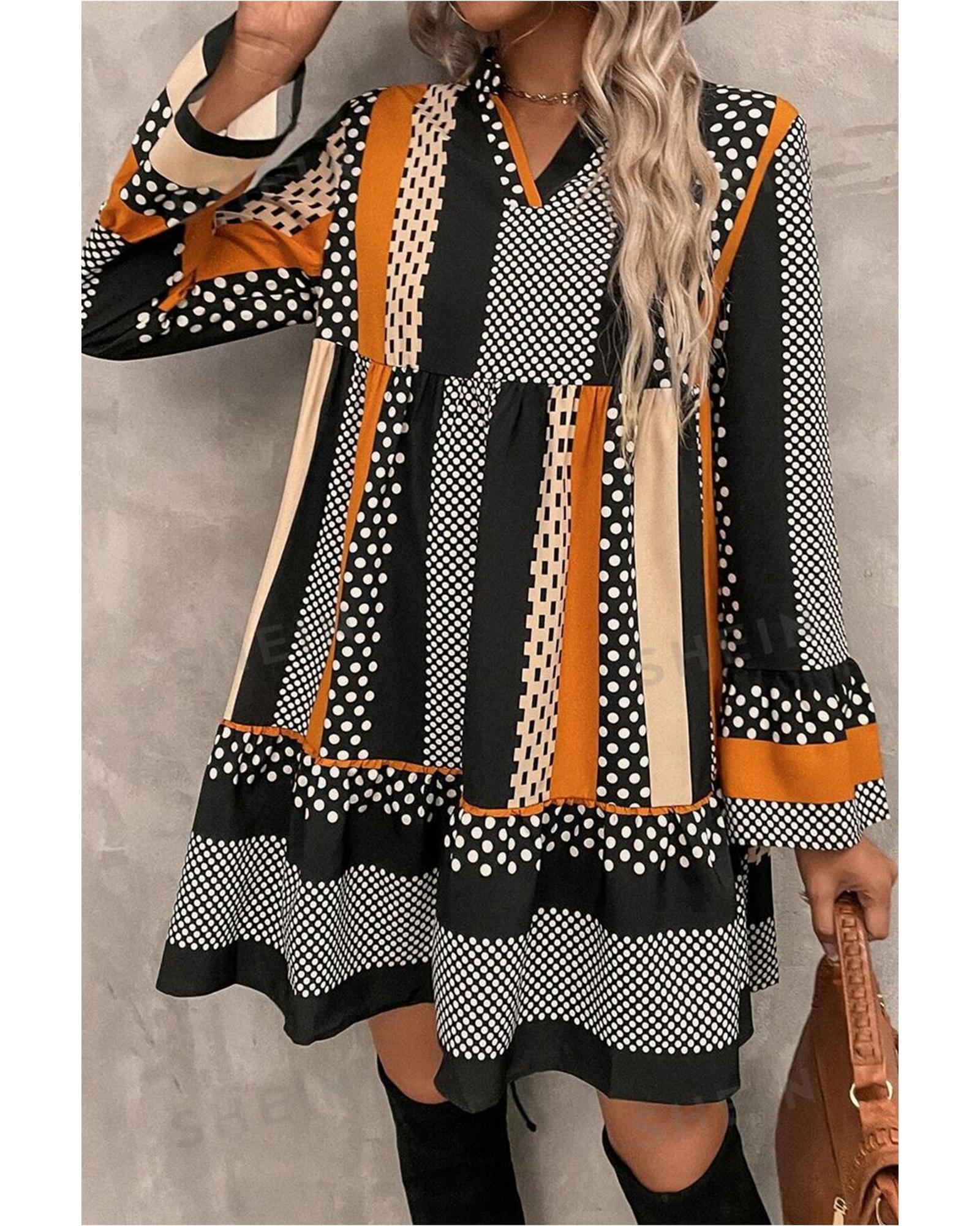 Black Striped Polka Dot Print Ruffled Hem V Neck Mini Dress – S
