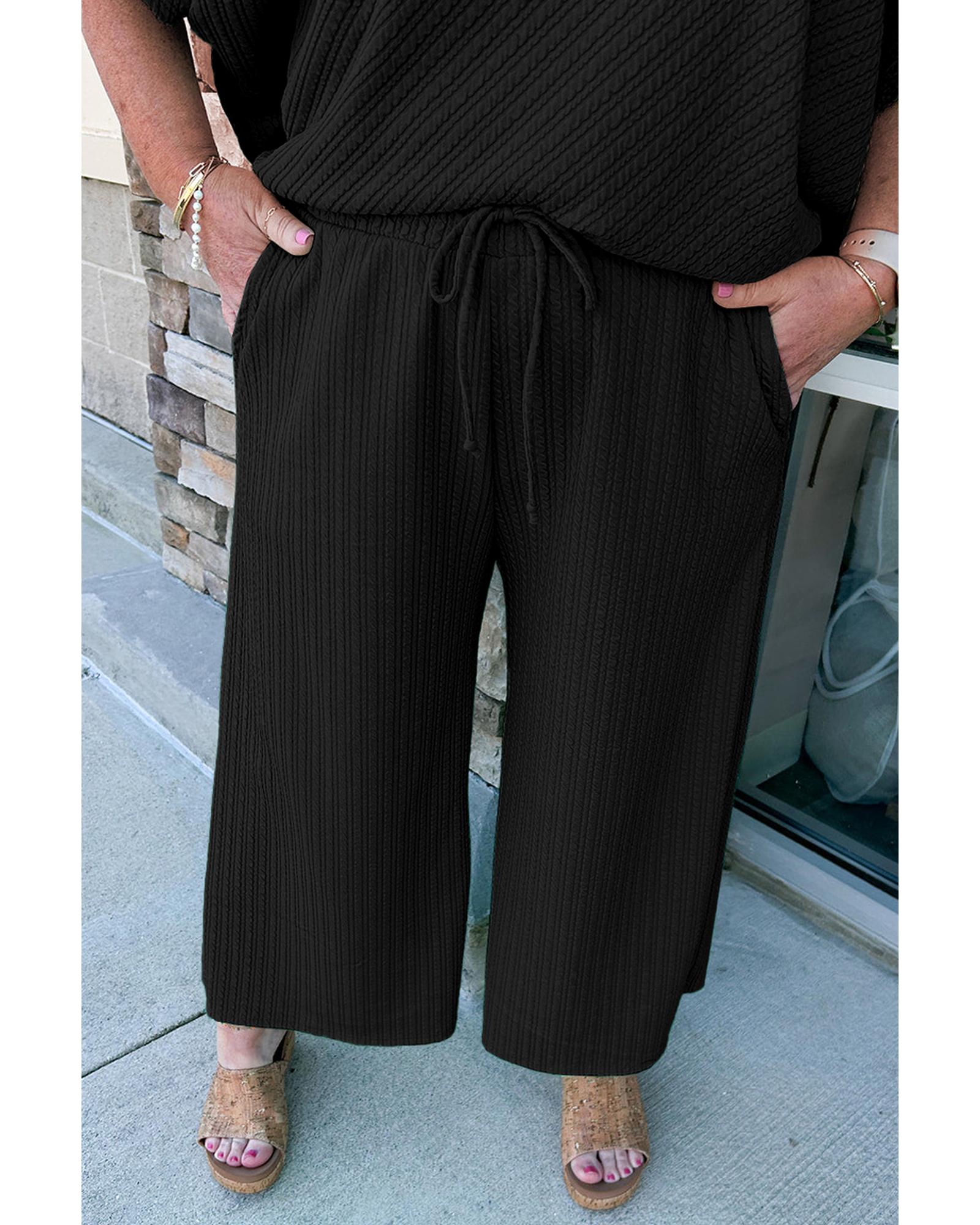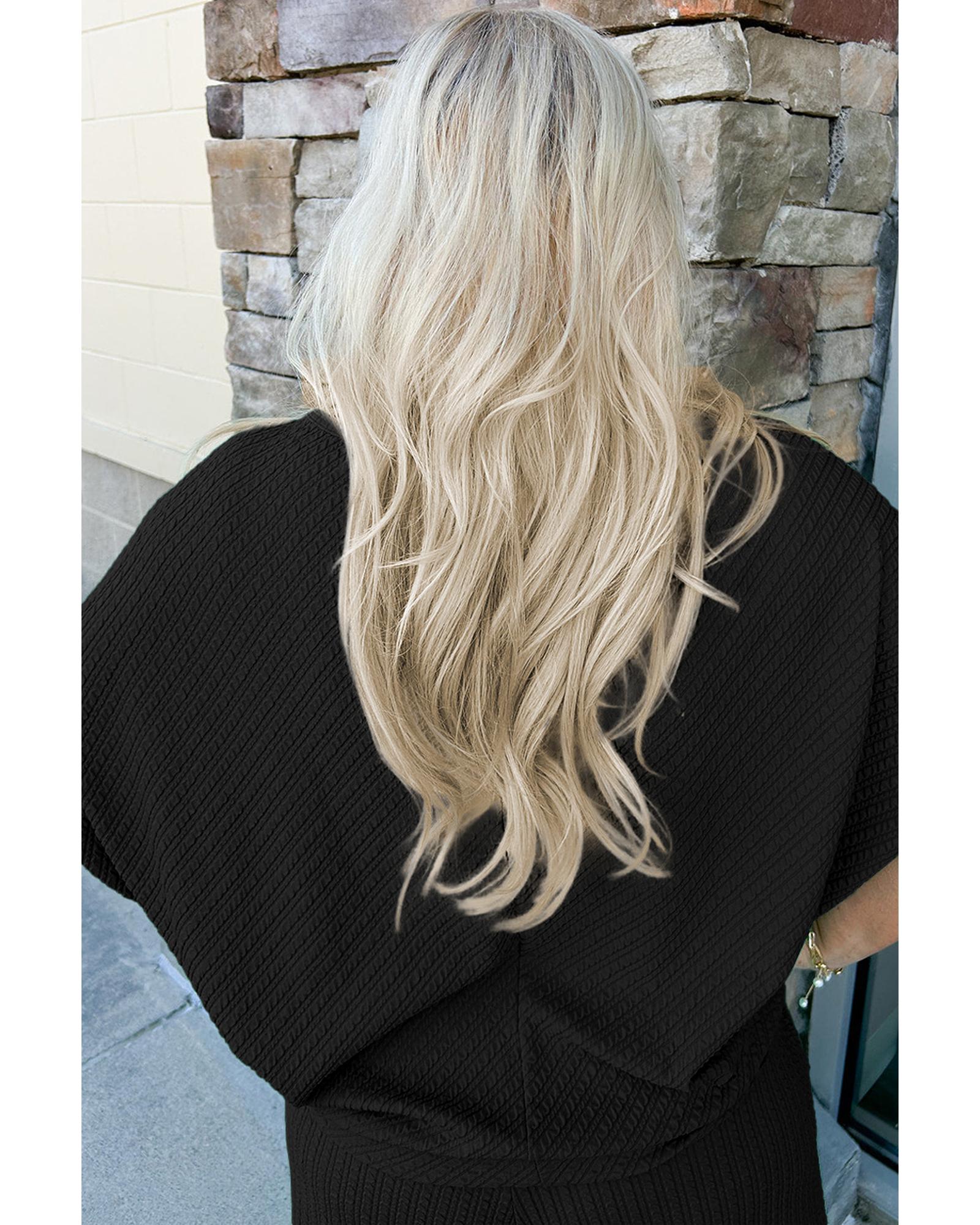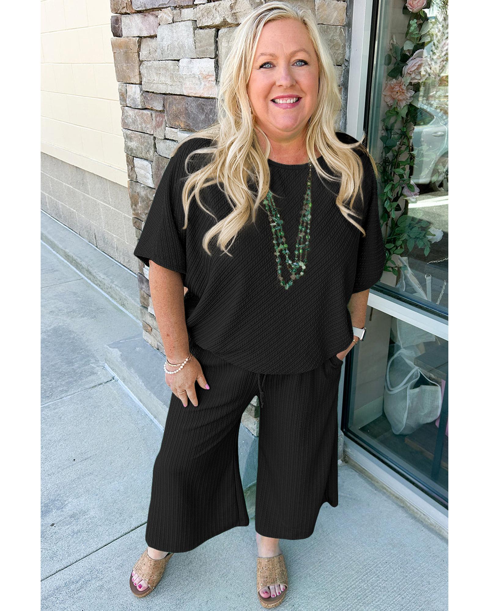 Black Textured Batwing Sleeve Tee Wide Leg Pants Plus Size Set – 4X