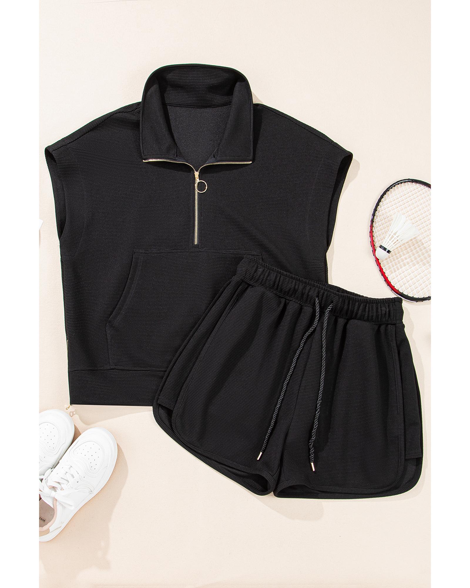 Black Textured Half Zip Kangaroo Pocket Top Drawstring Shorts Set – XL