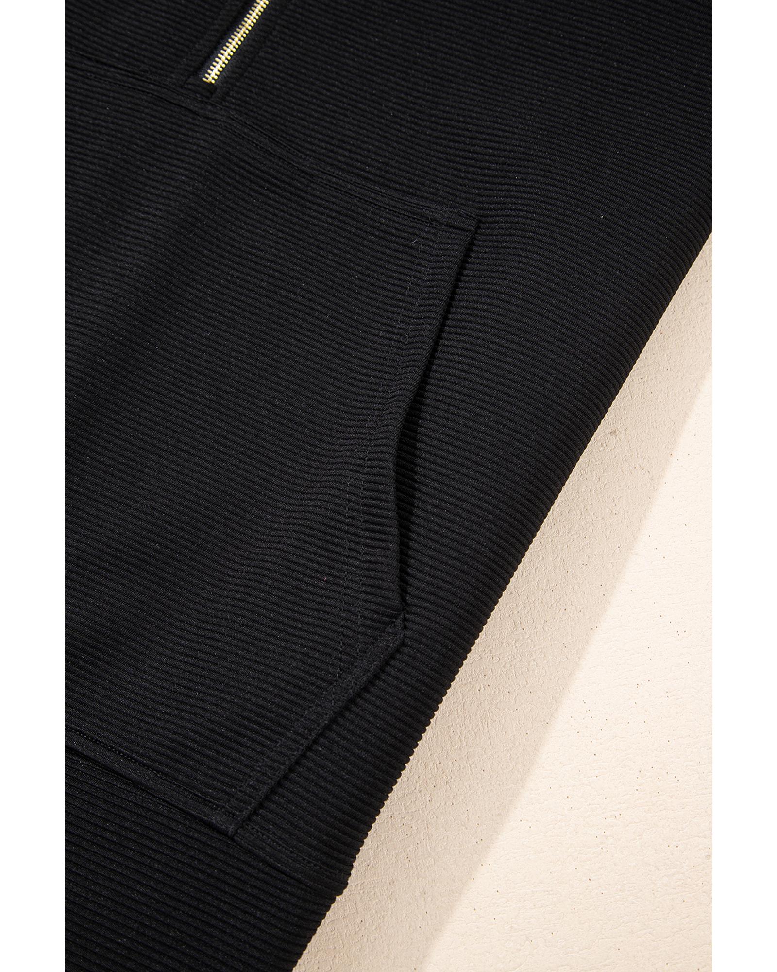 Black Textured Half Zip Kangaroo Pocket Top Drawstring Shorts Set - S