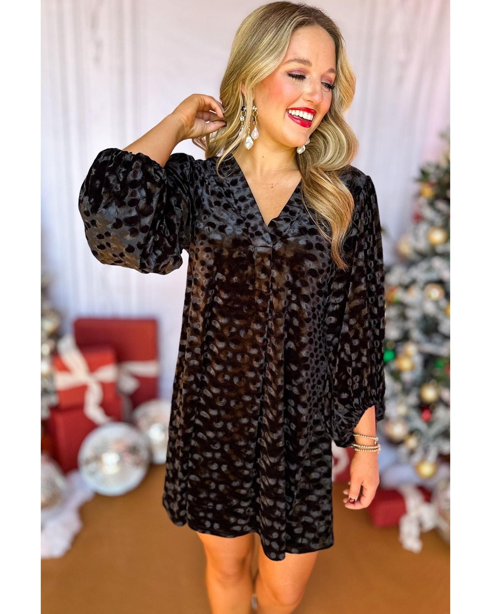 Black Textured V Neck Balloon Sleeve Velvet Mini Dress - M