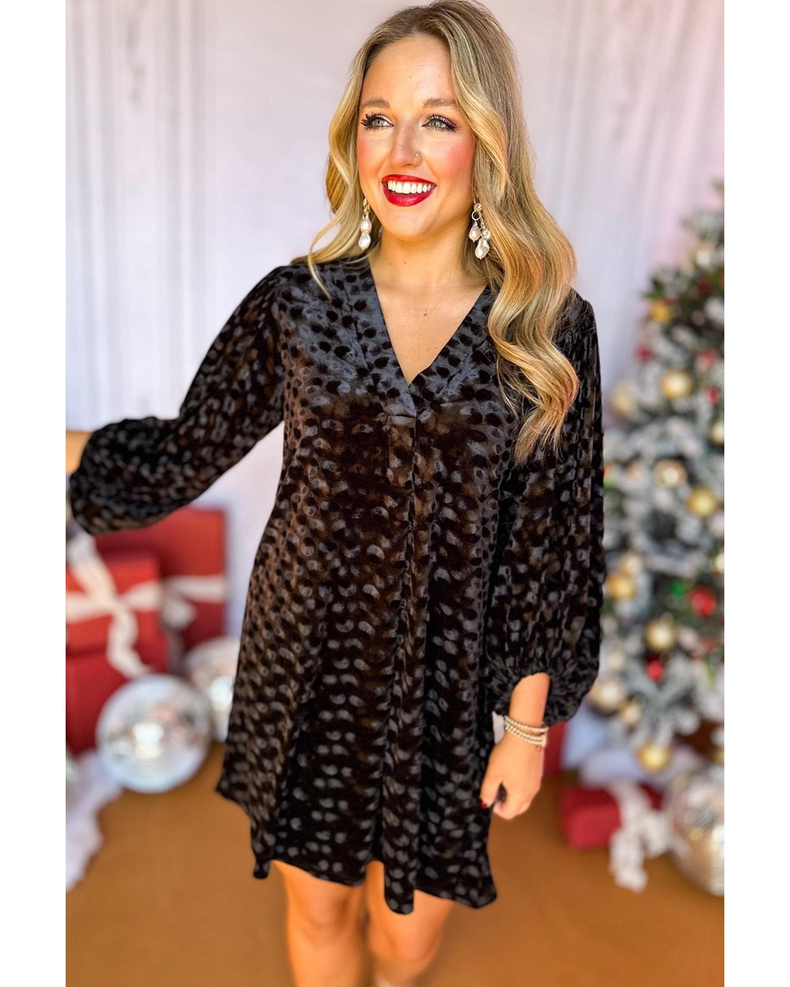 Black Textured V Neck Balloon Sleeve Velvet Mini Dress – L