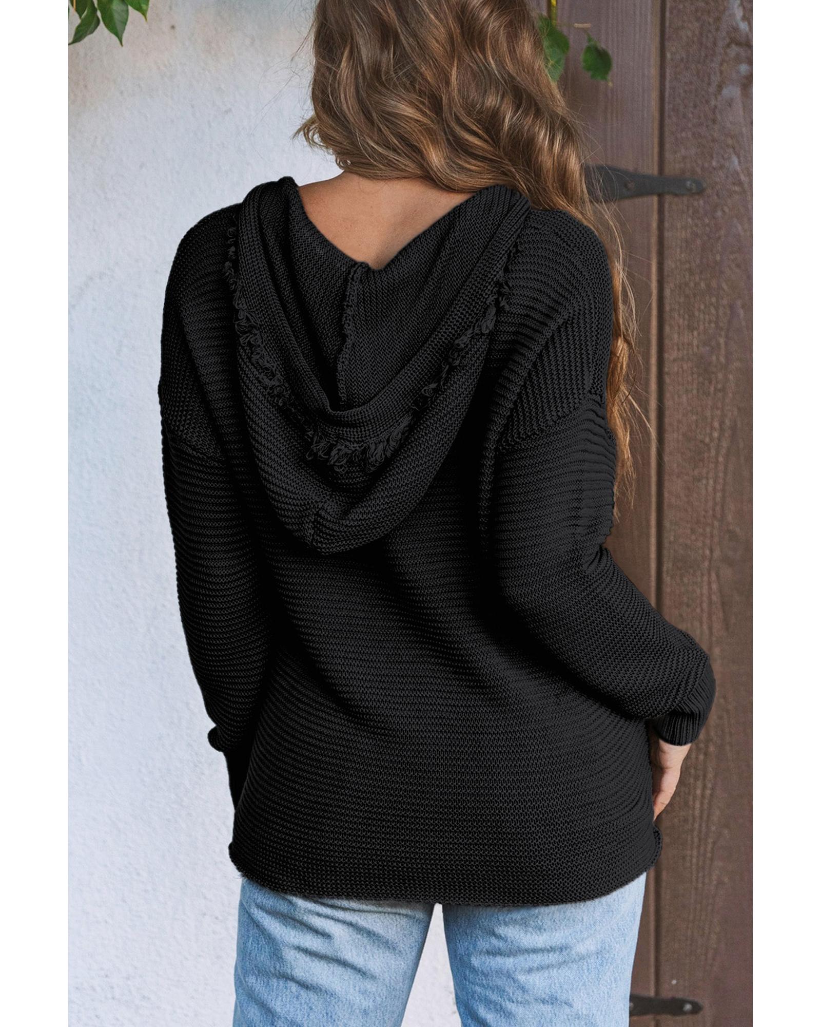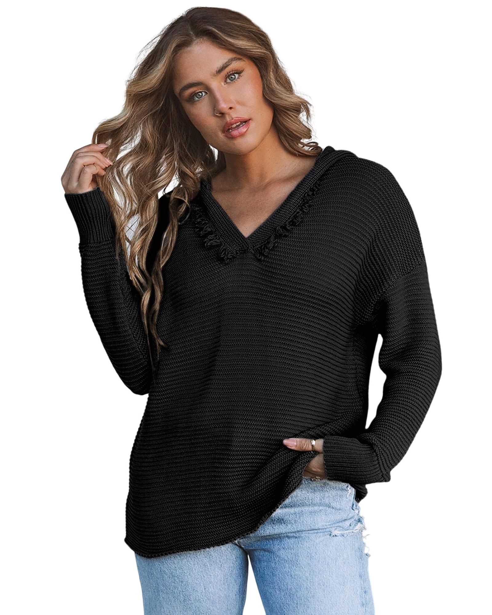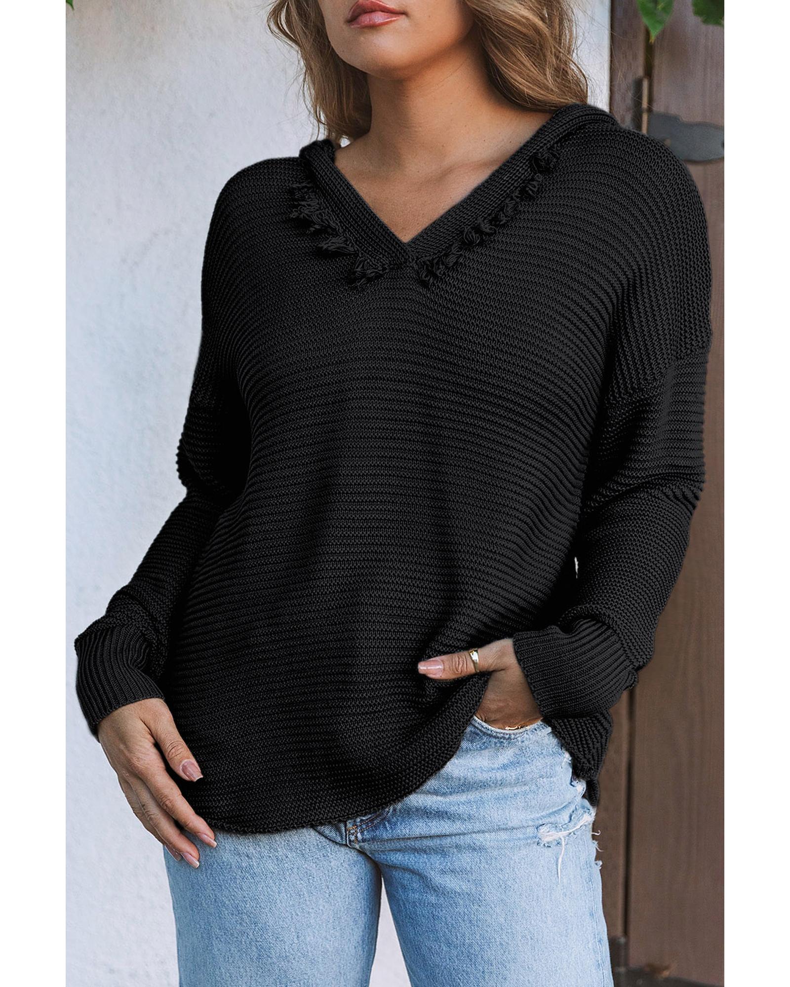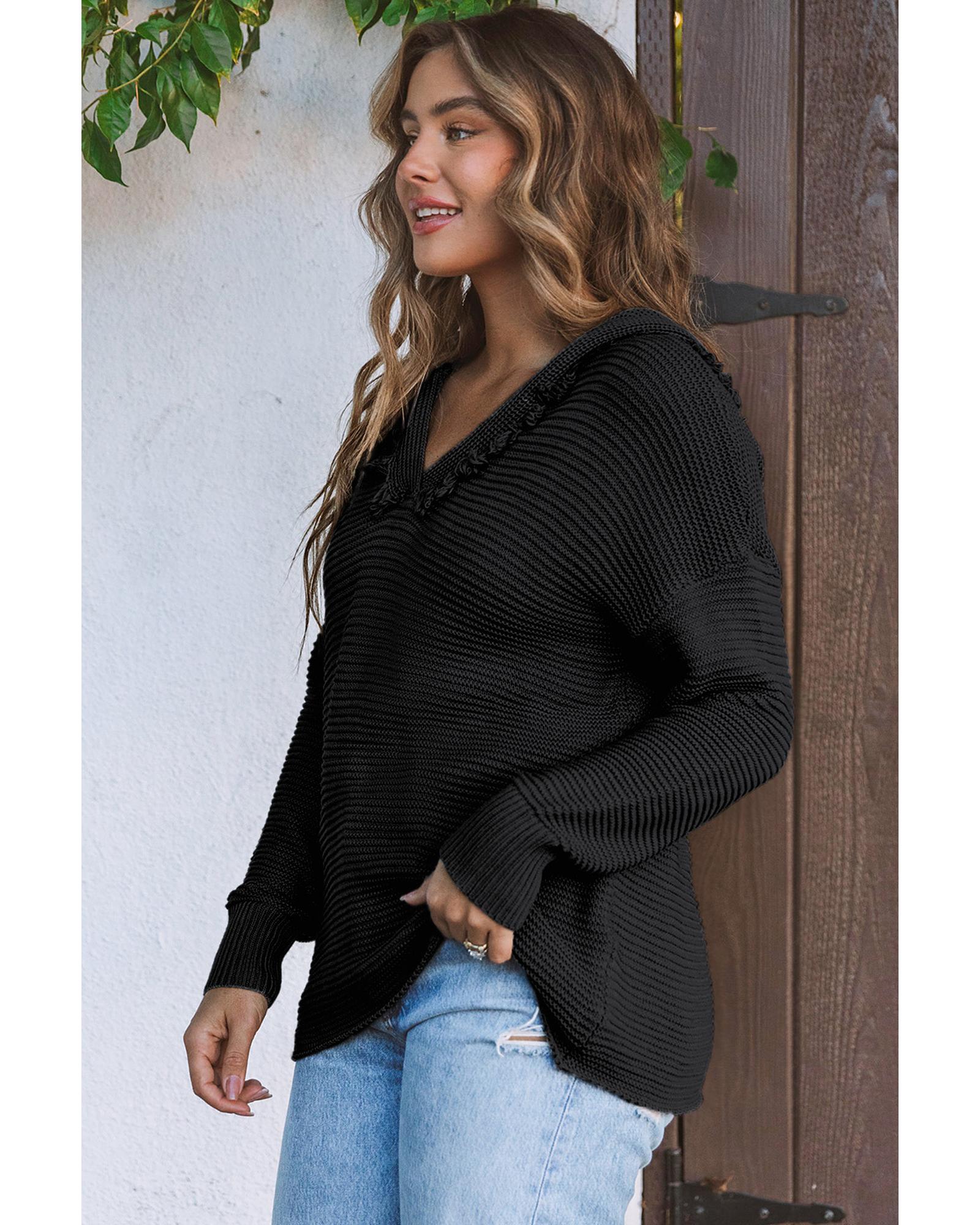 Black V Neck Ribbed Drop Shoulder Hooded Sweater – S