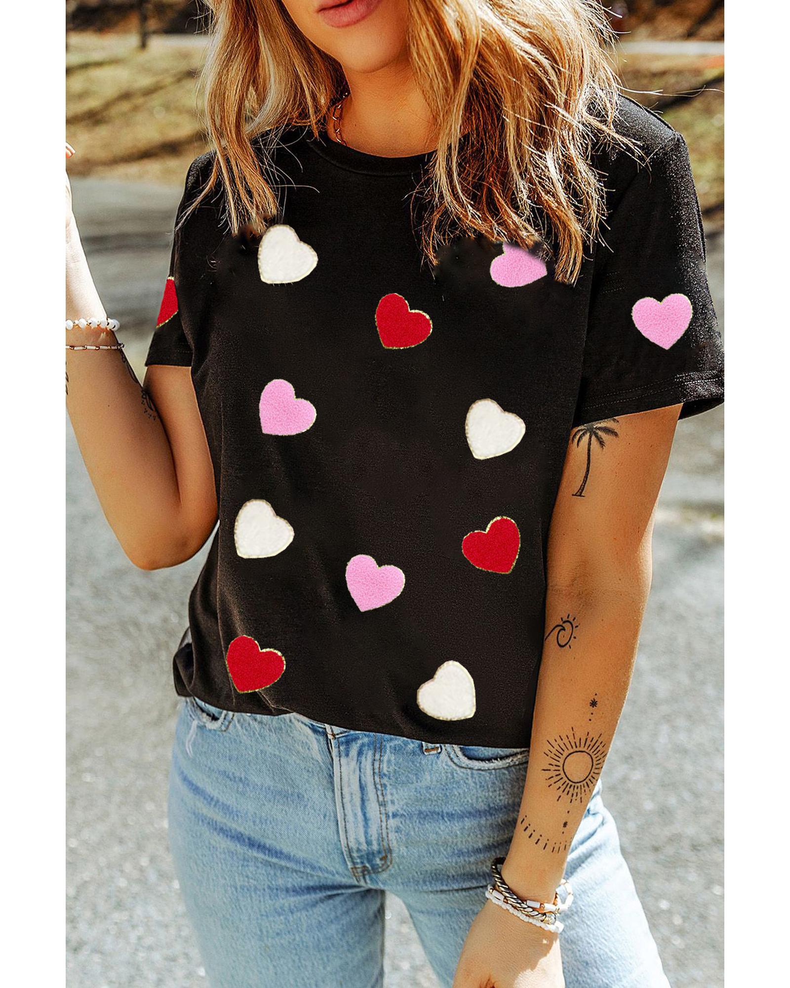 Black Valentines Chenille Heart Patched Pattern Crewneck Tee – L