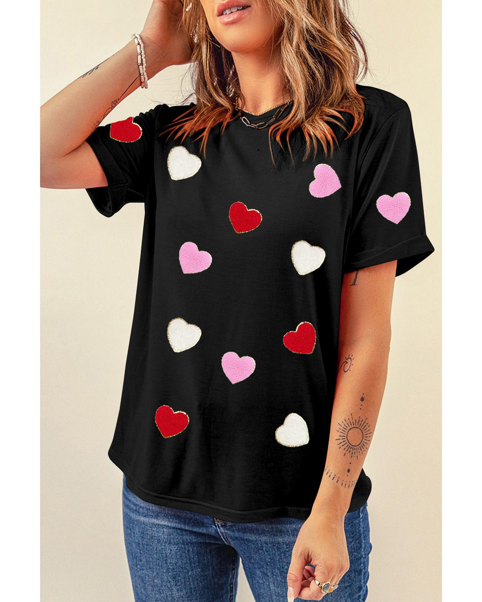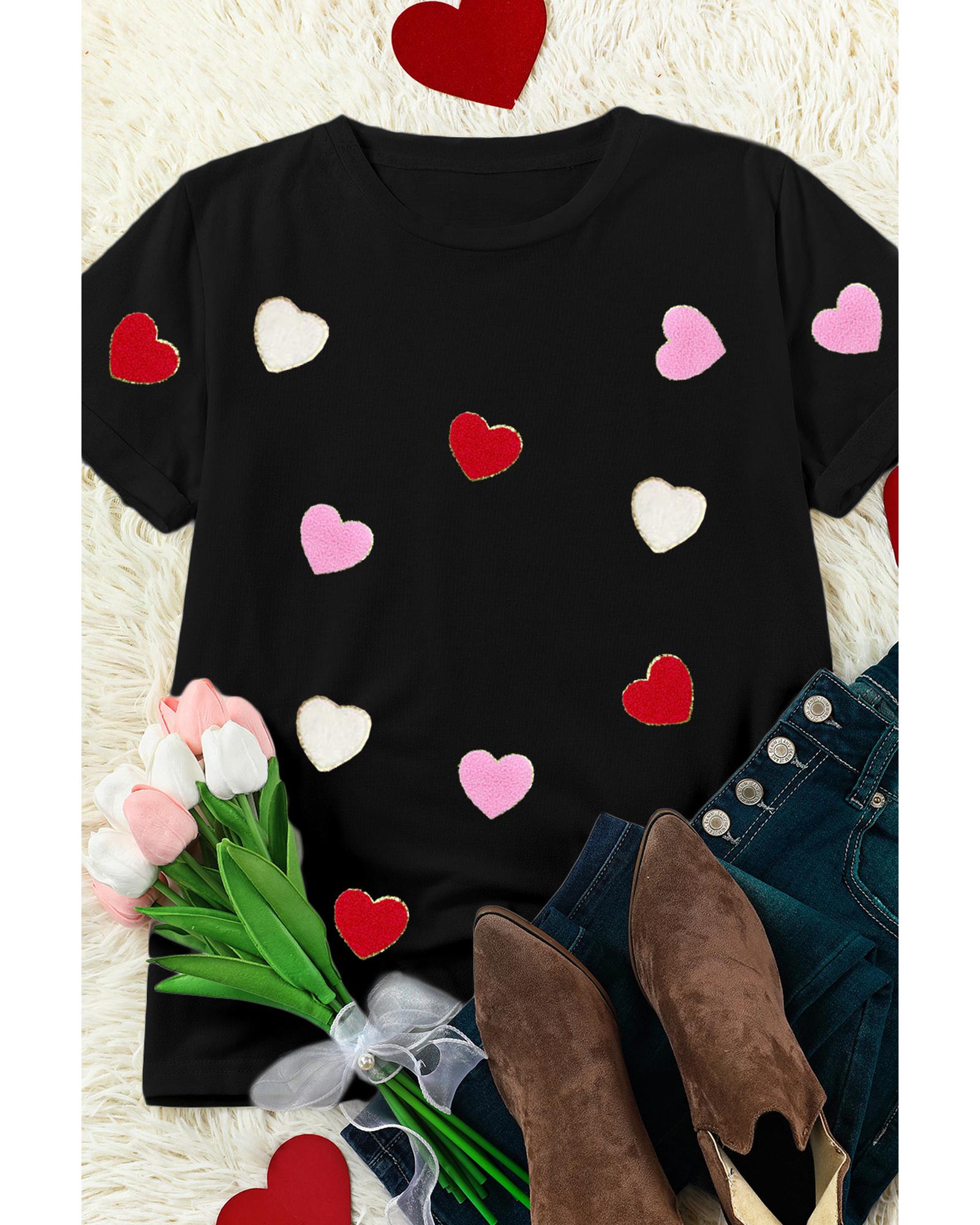 Black Valentines Chenille Heart Patched Pattern Crewneck Tee – S