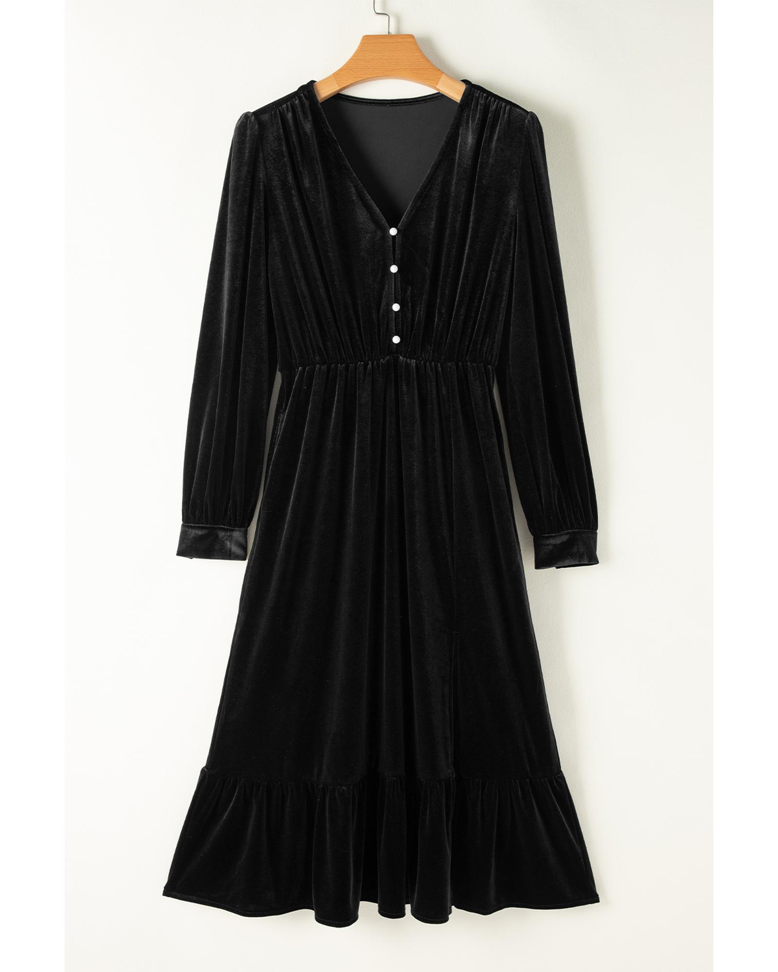 Black Velvet Buttoned Puff Sleeve V Neck Split Midi Dress – L