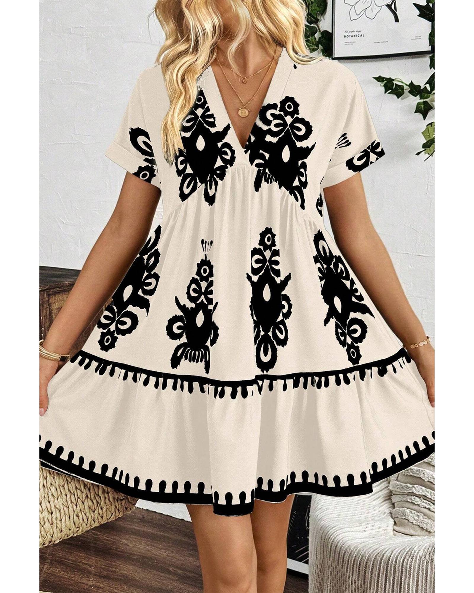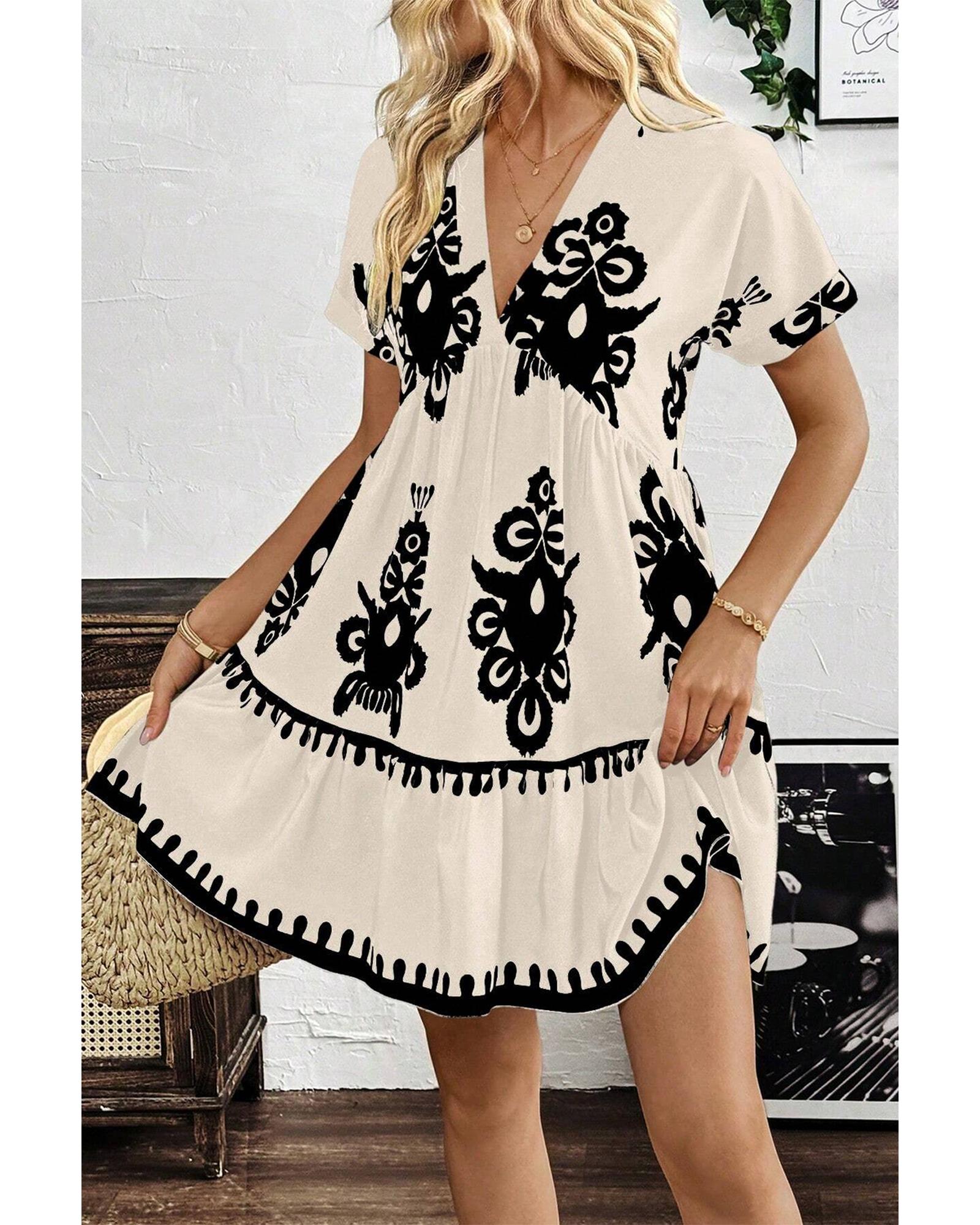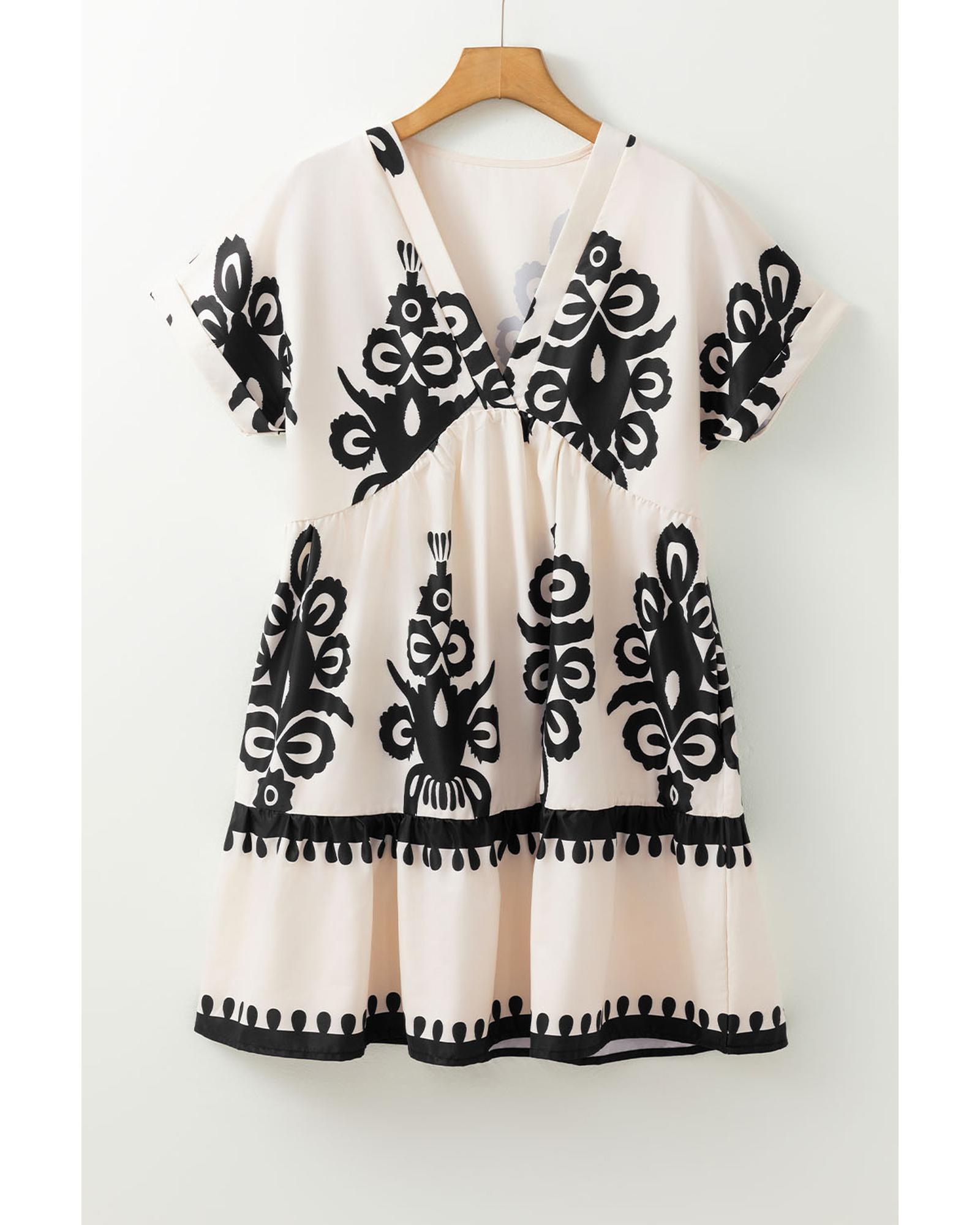 Black Vintage Print V Neck High Waist Short Sleeve Dress – L