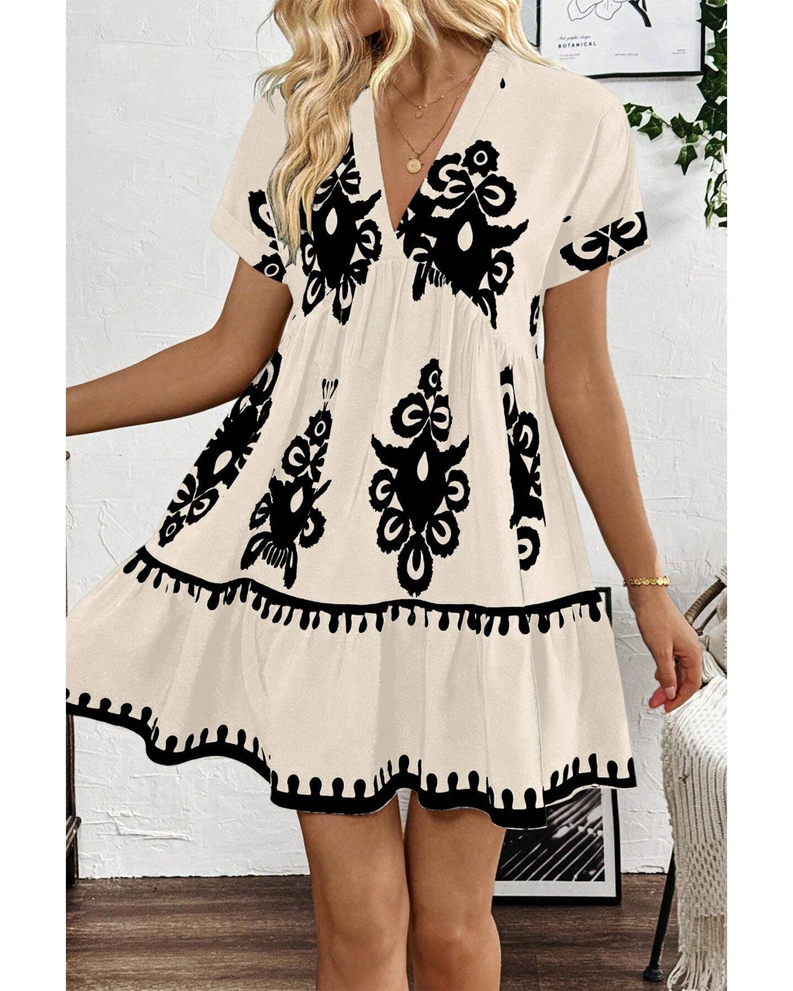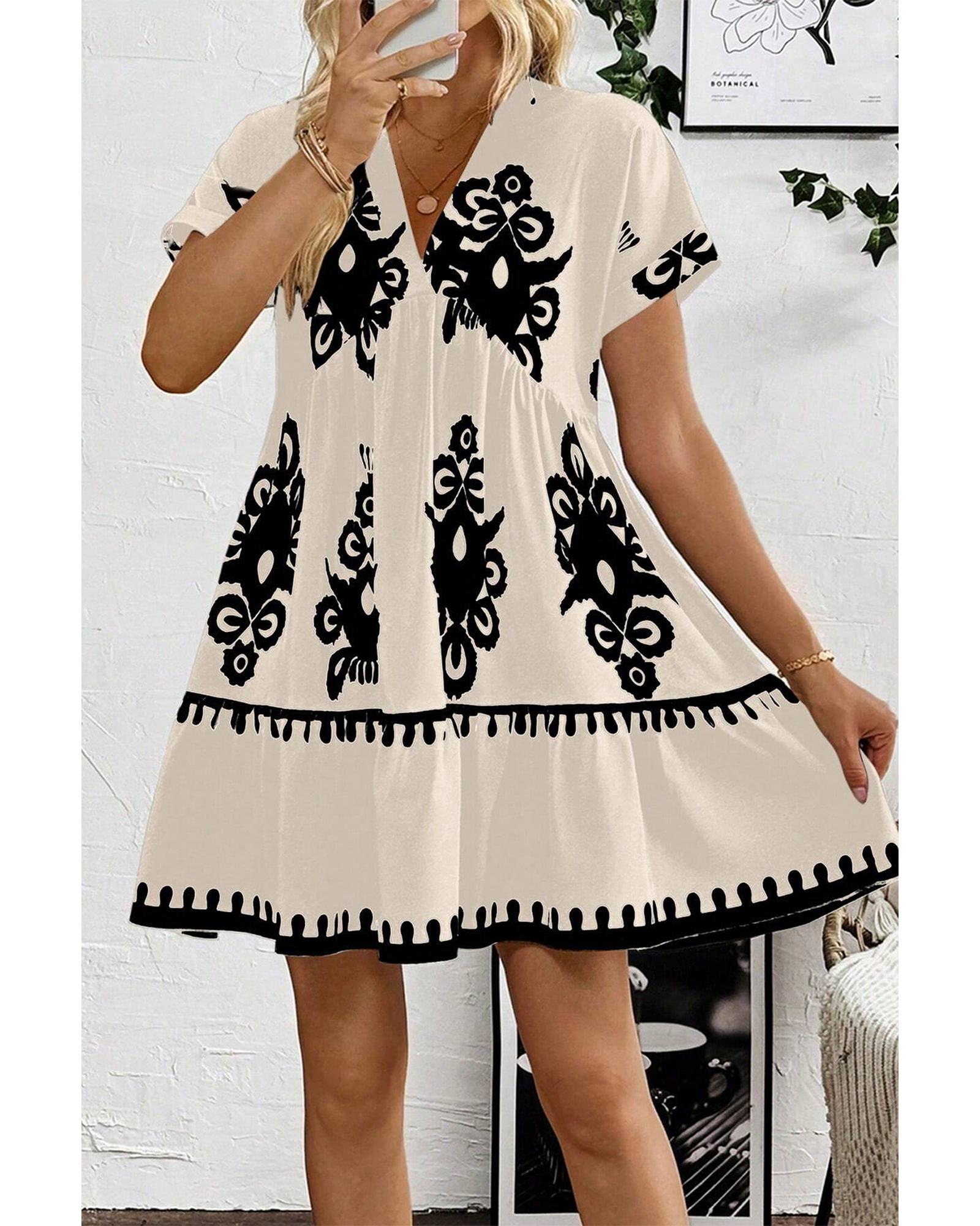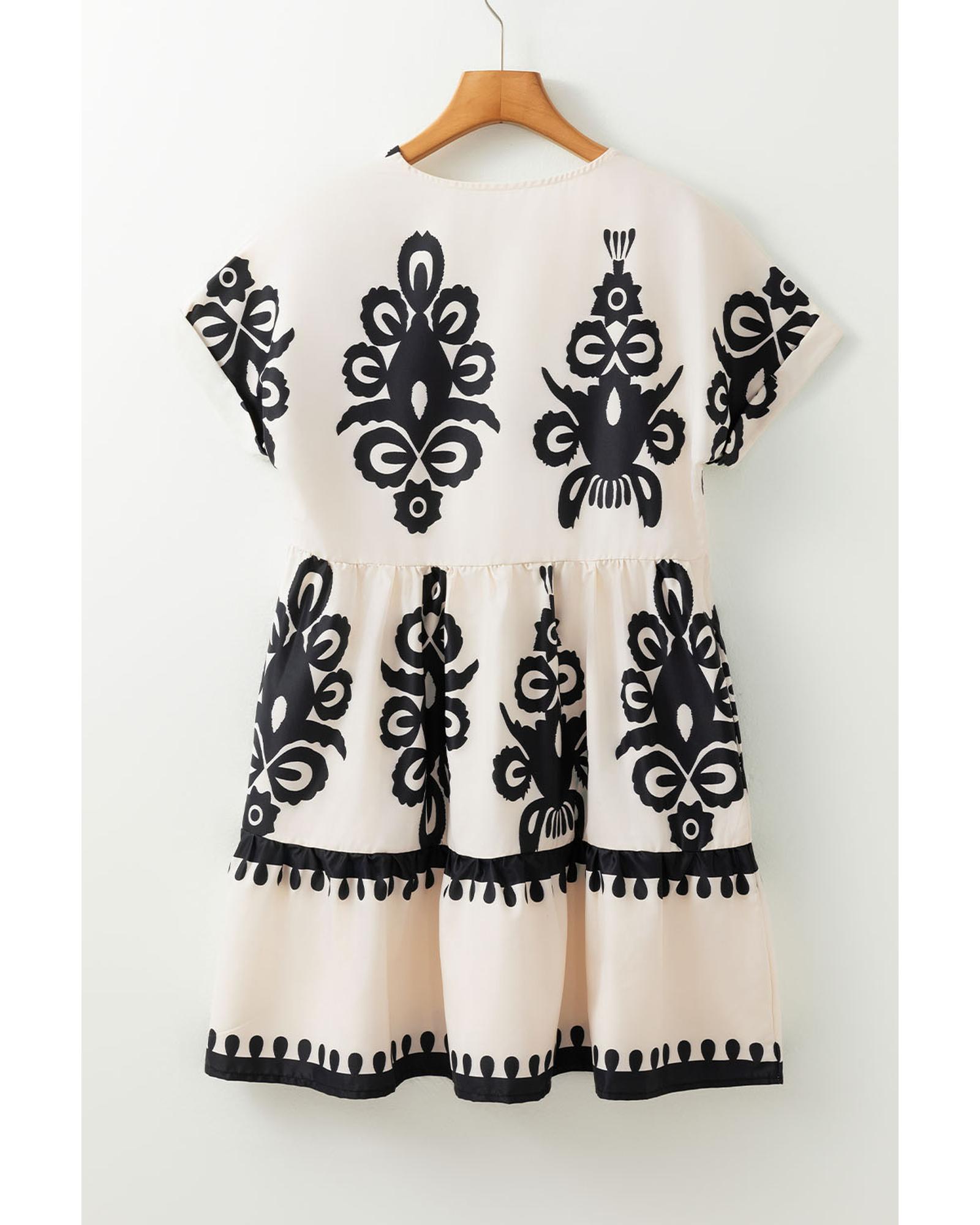 Black Vintage Print V Neck High Waist Short Sleeve Dress – XL