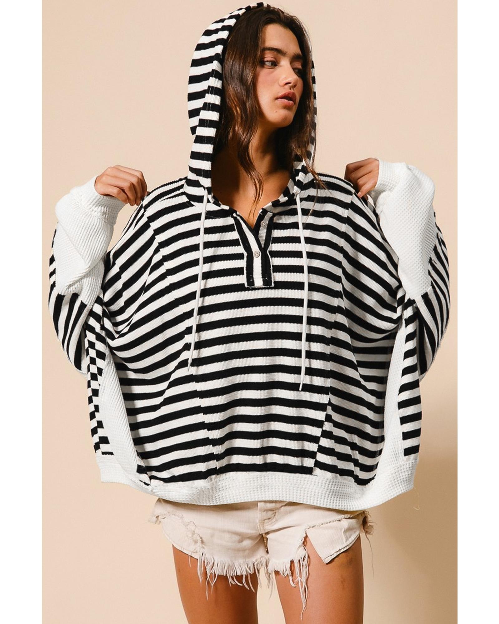 Black white Oversized Striped Henley Buttons Dolman Sleeve Hooded Top – XL
