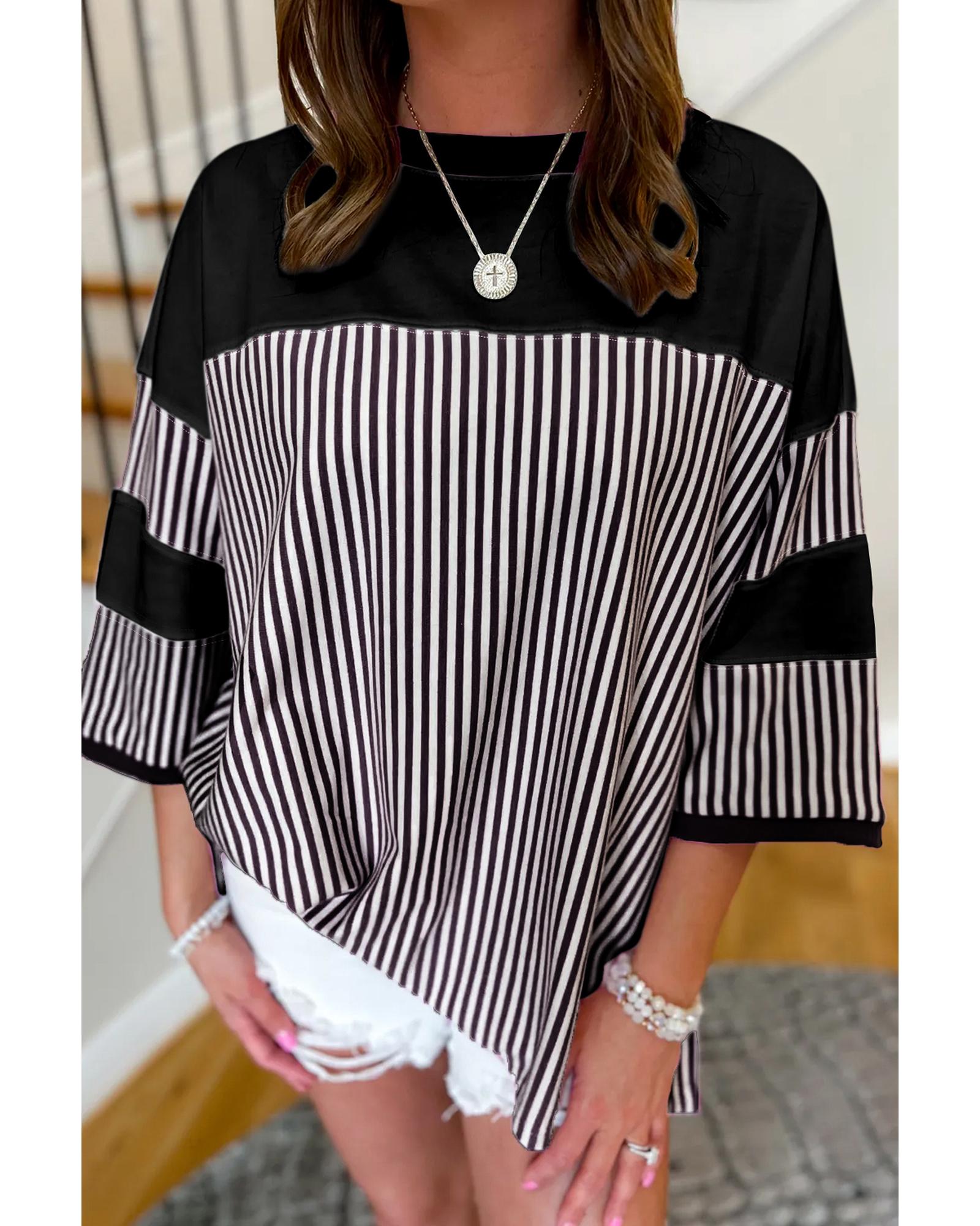 Black White Striped Patchwork 3/4 Sleeve Oversize Top – S