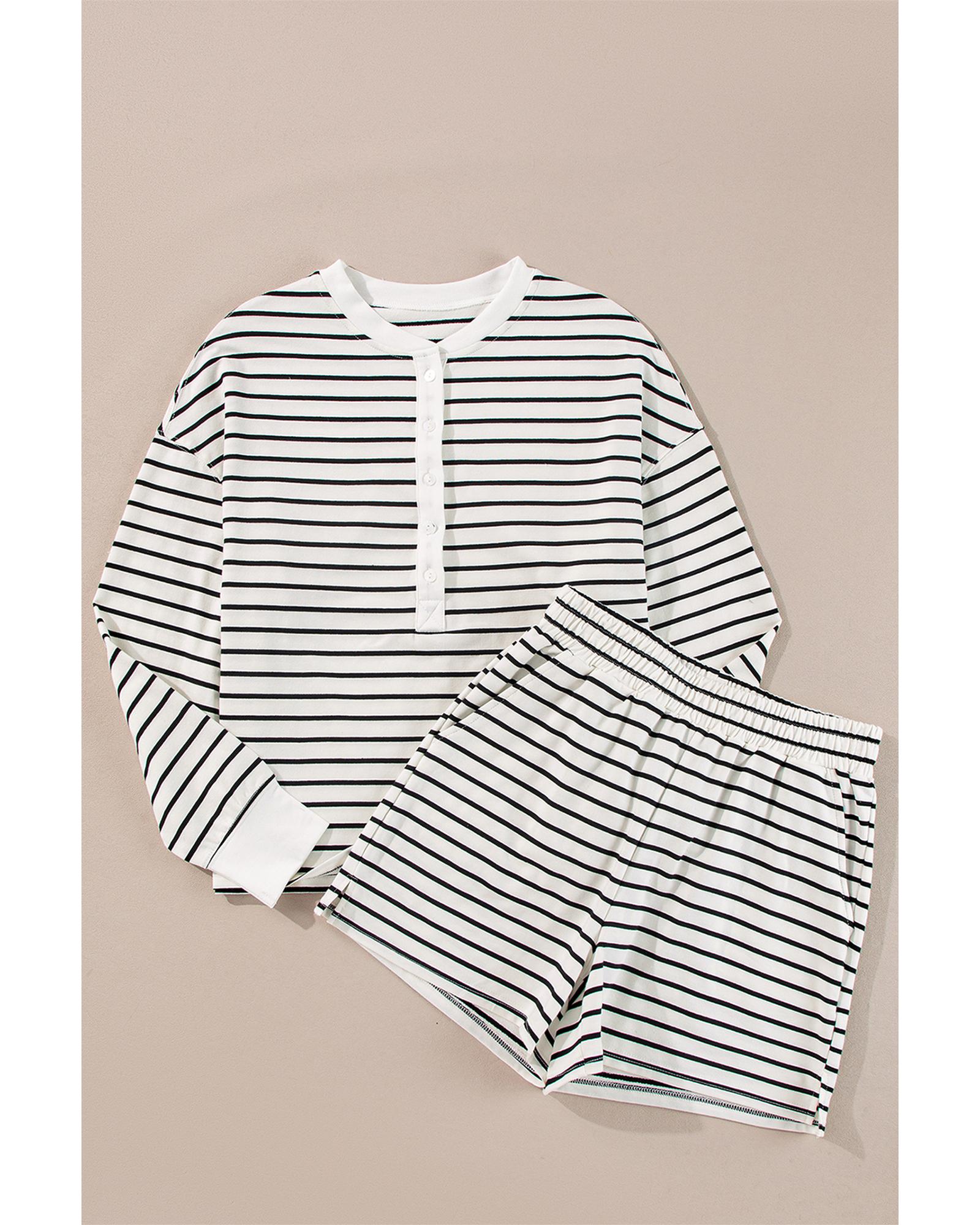 Black white Stripes Printed Half Button Long Sleeve Top and Shorts Set - XL