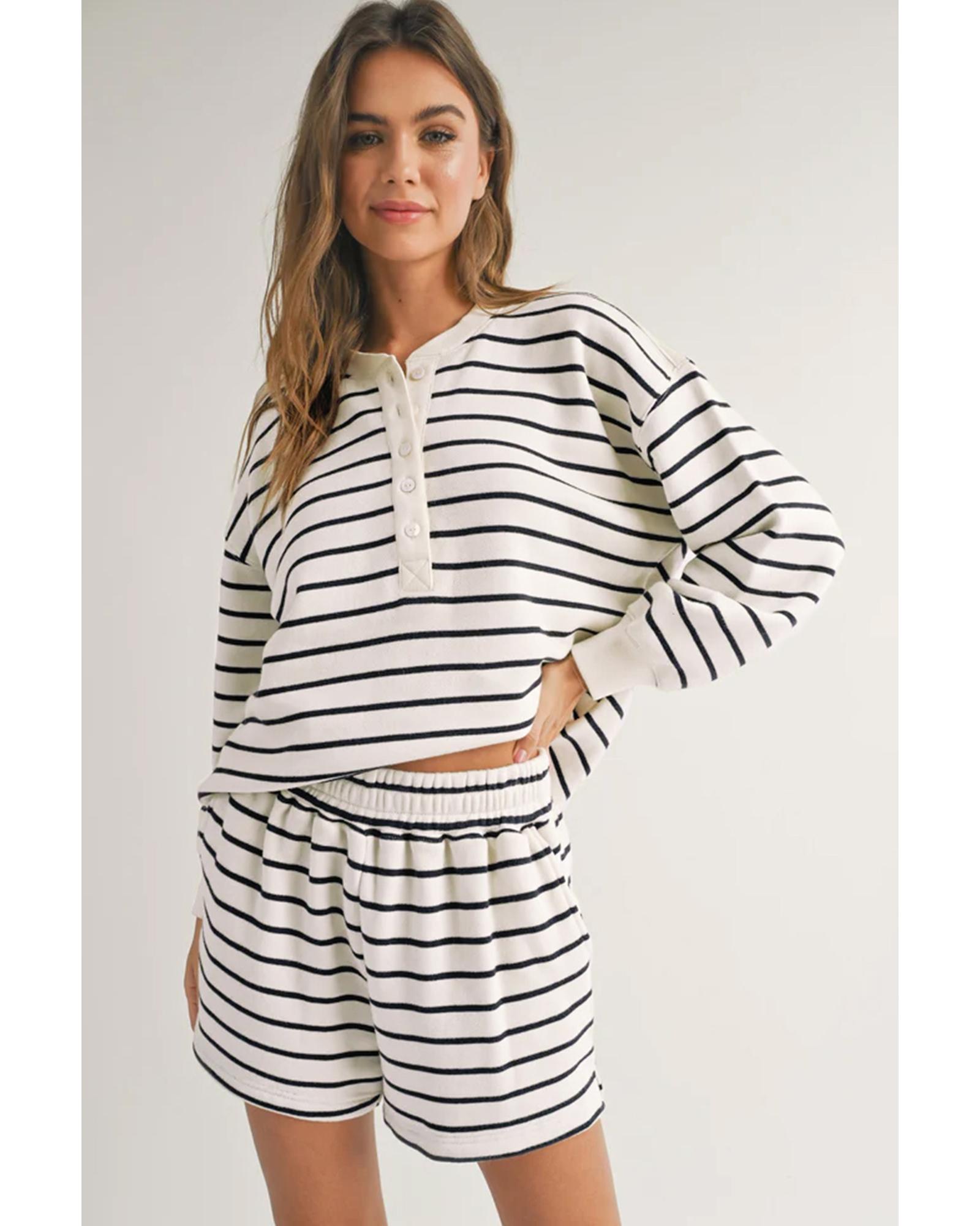 Black white Stripes Printed Half Button Long Sleeve Top and Shorts Set – M