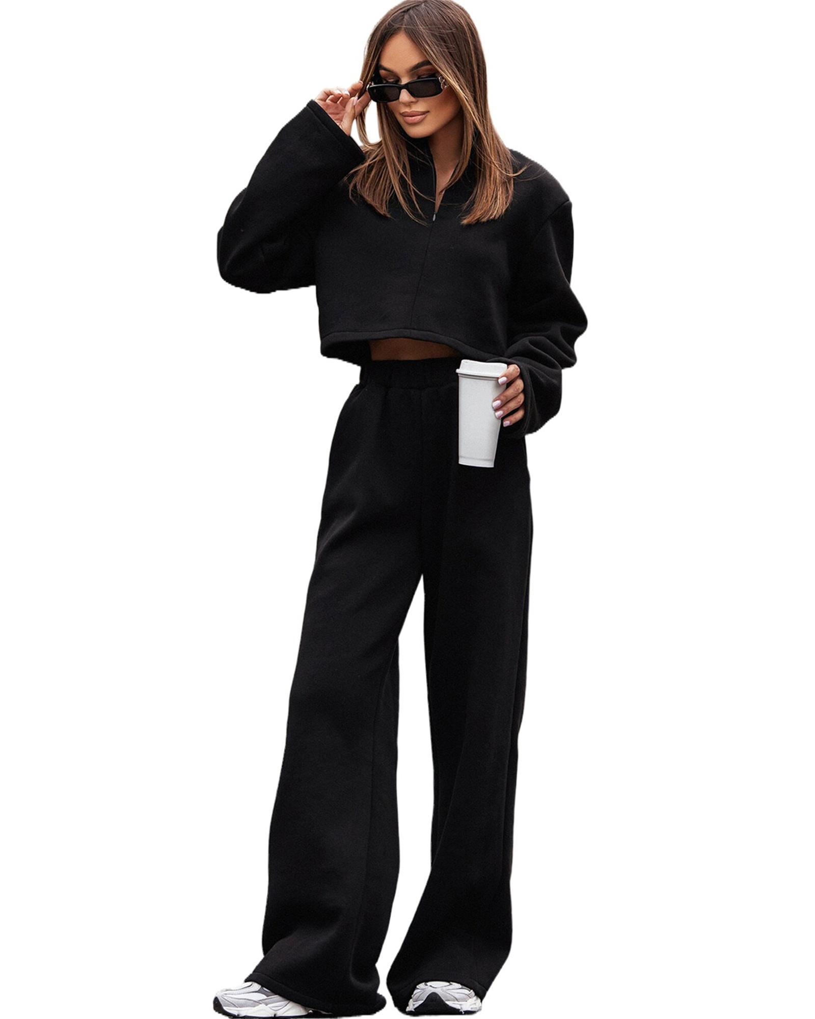 • Luxurious Black Zipped Collared Crop Top and Wide Leg Pants Set