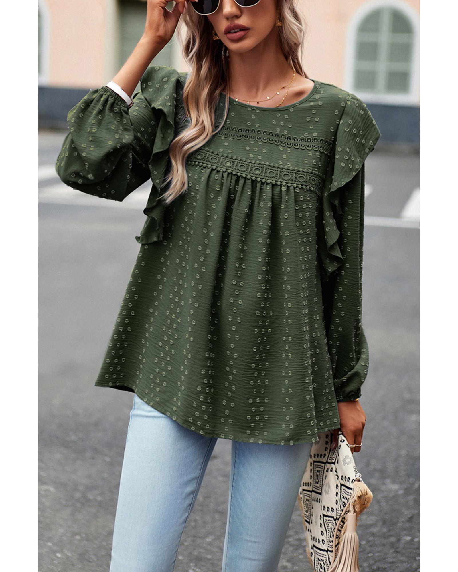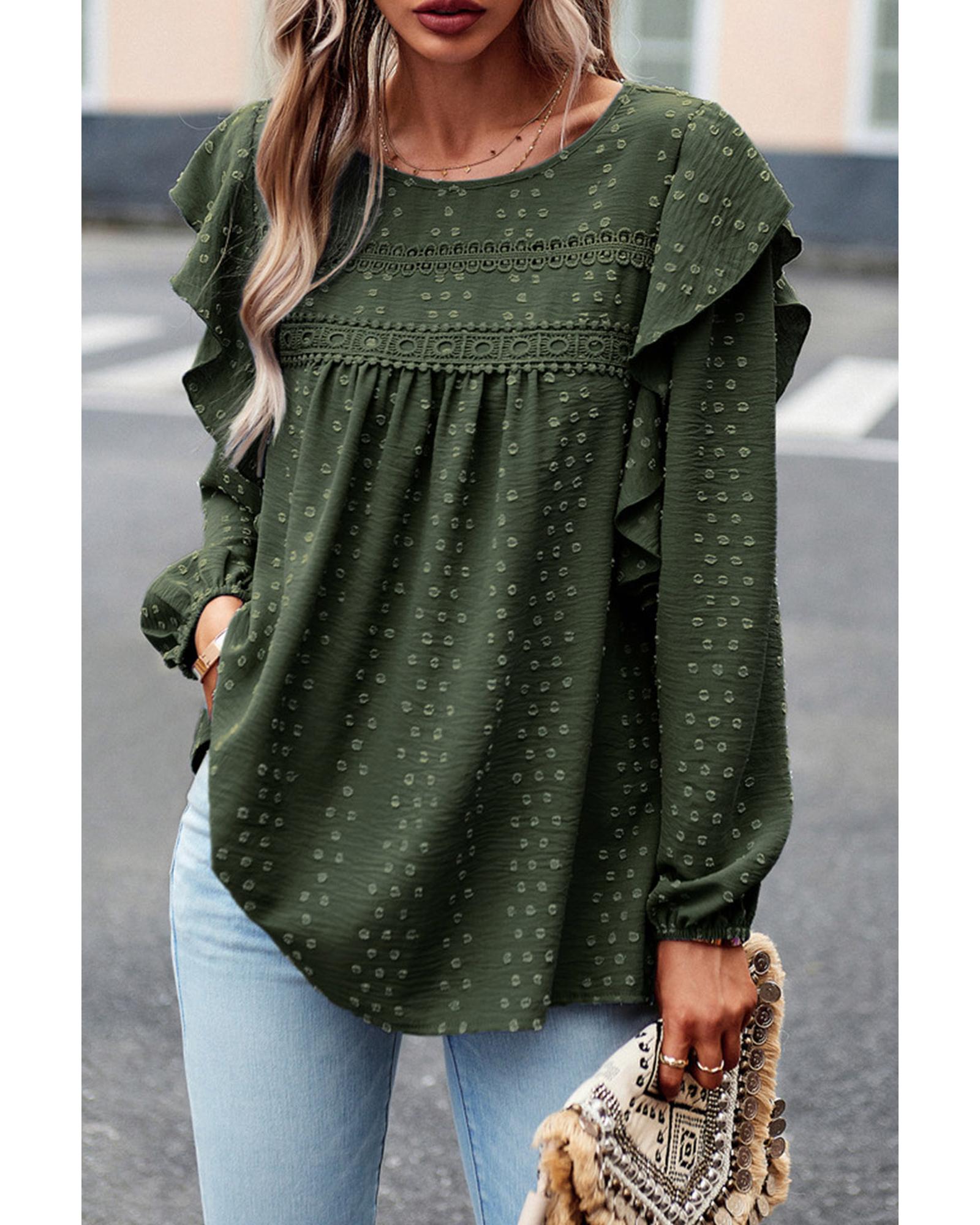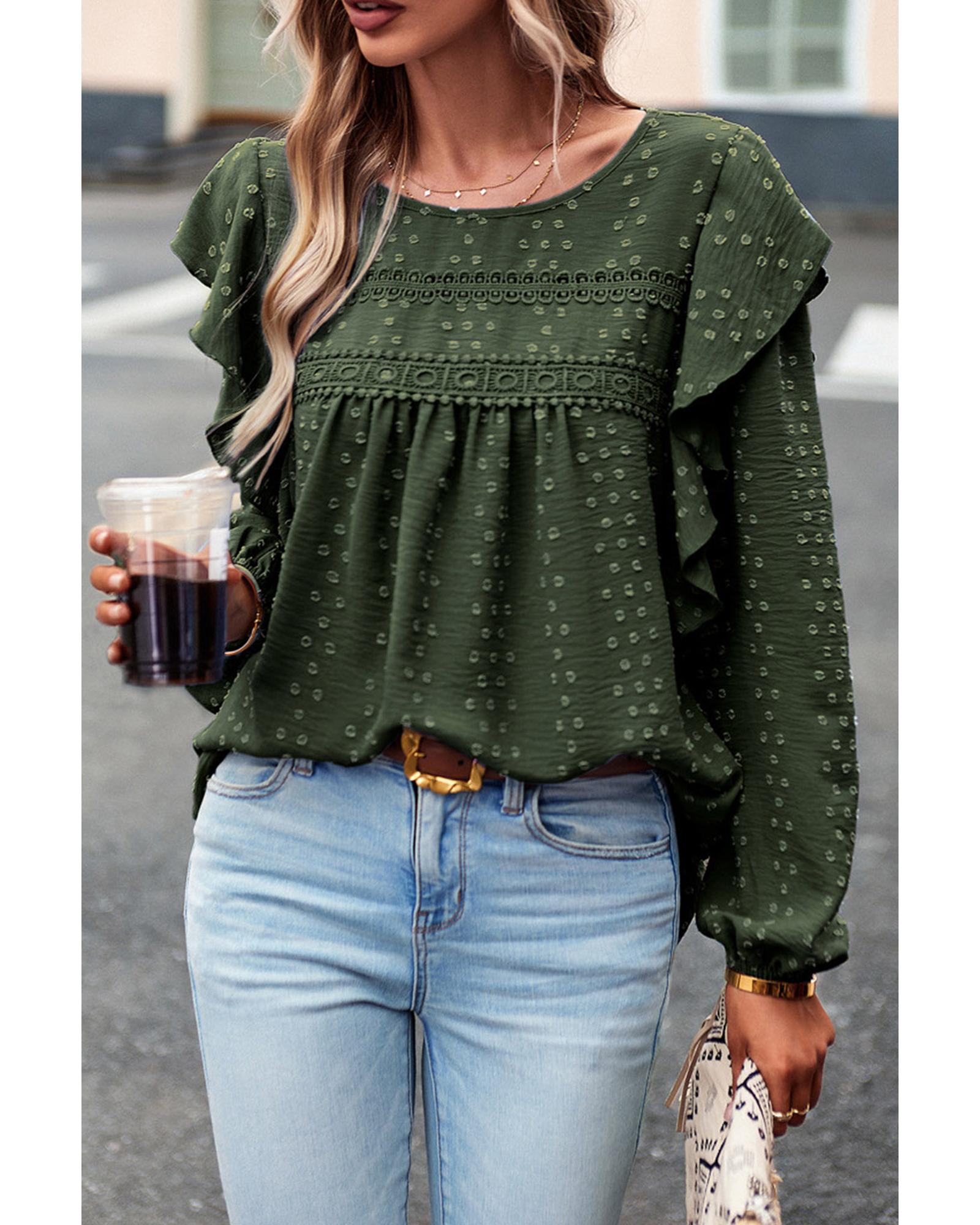 Blackish Green Lace Eyelet Ruffle Shoulder Long Sleeve Blouse – S
