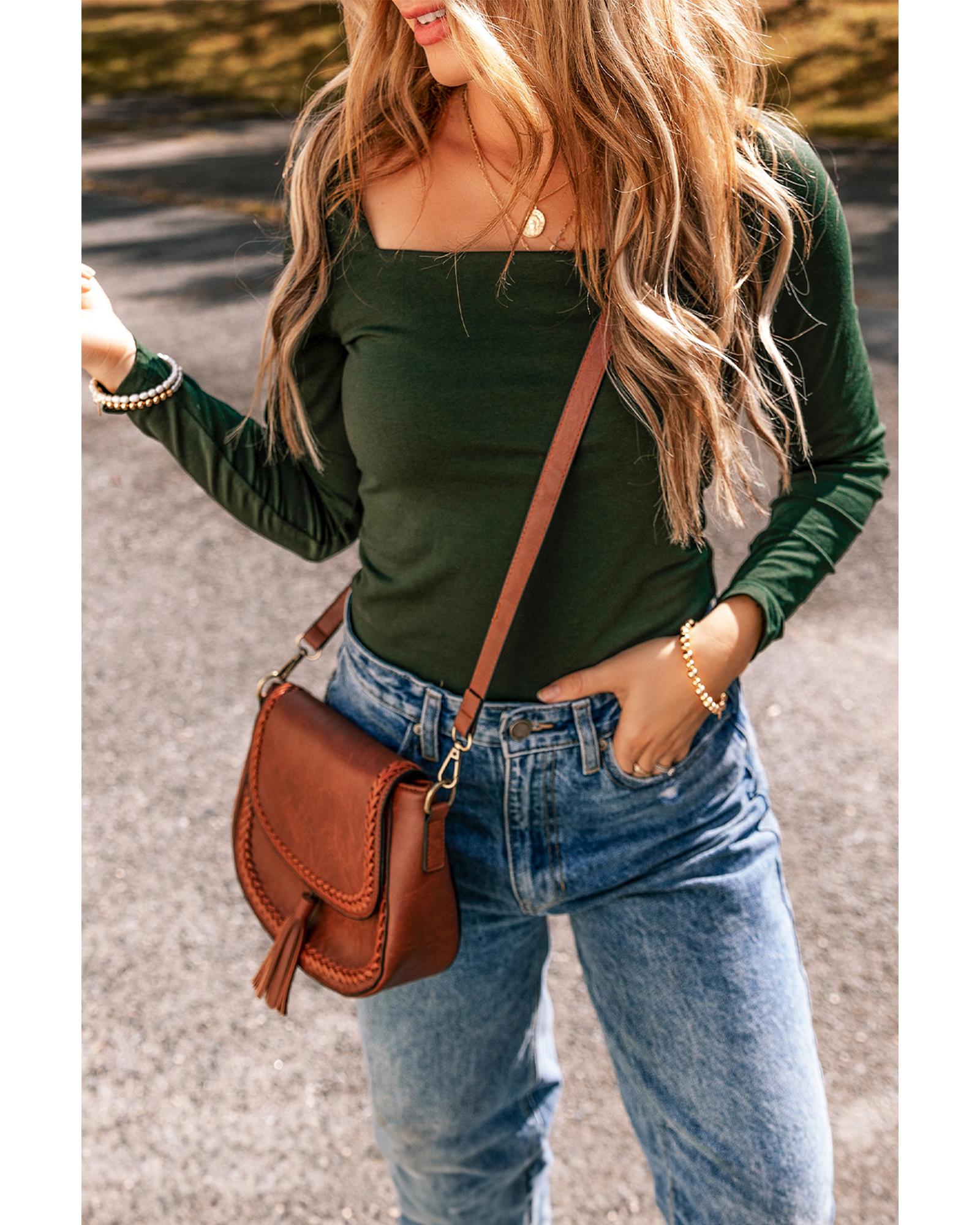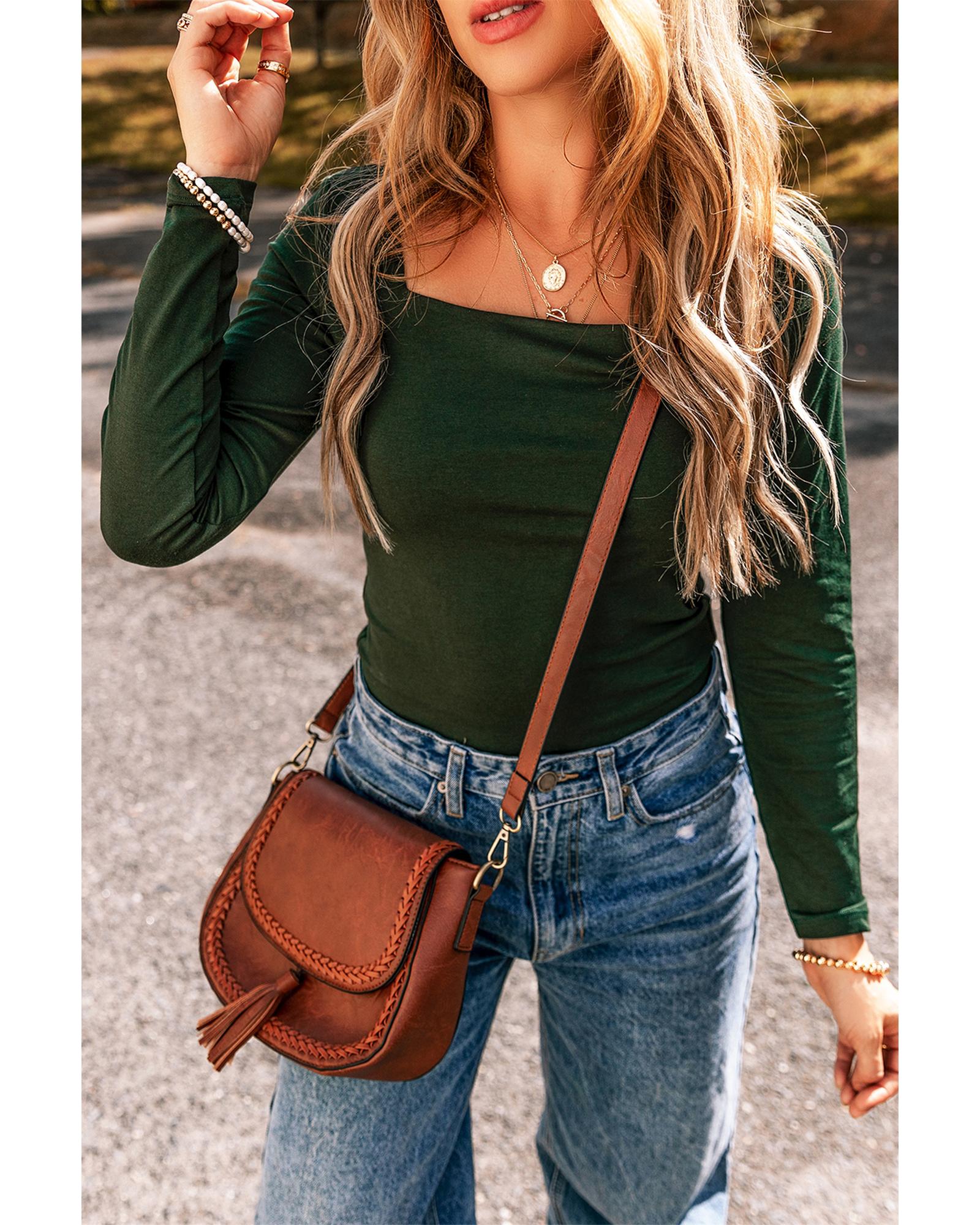 Blackish Green Solid Color Square Neck Long Sleeve Slim Fit Bodysuit – XL