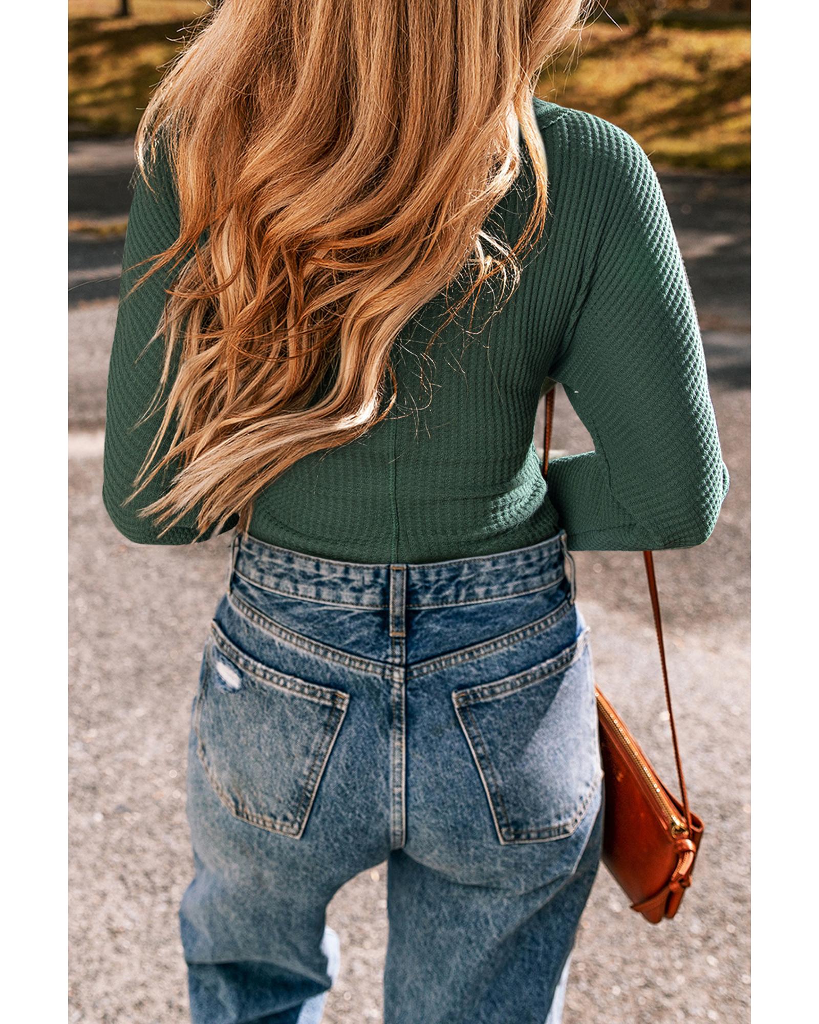 Blackish Green Waffle Knit Slim Fit Wrap V Neck Bodysuit – L