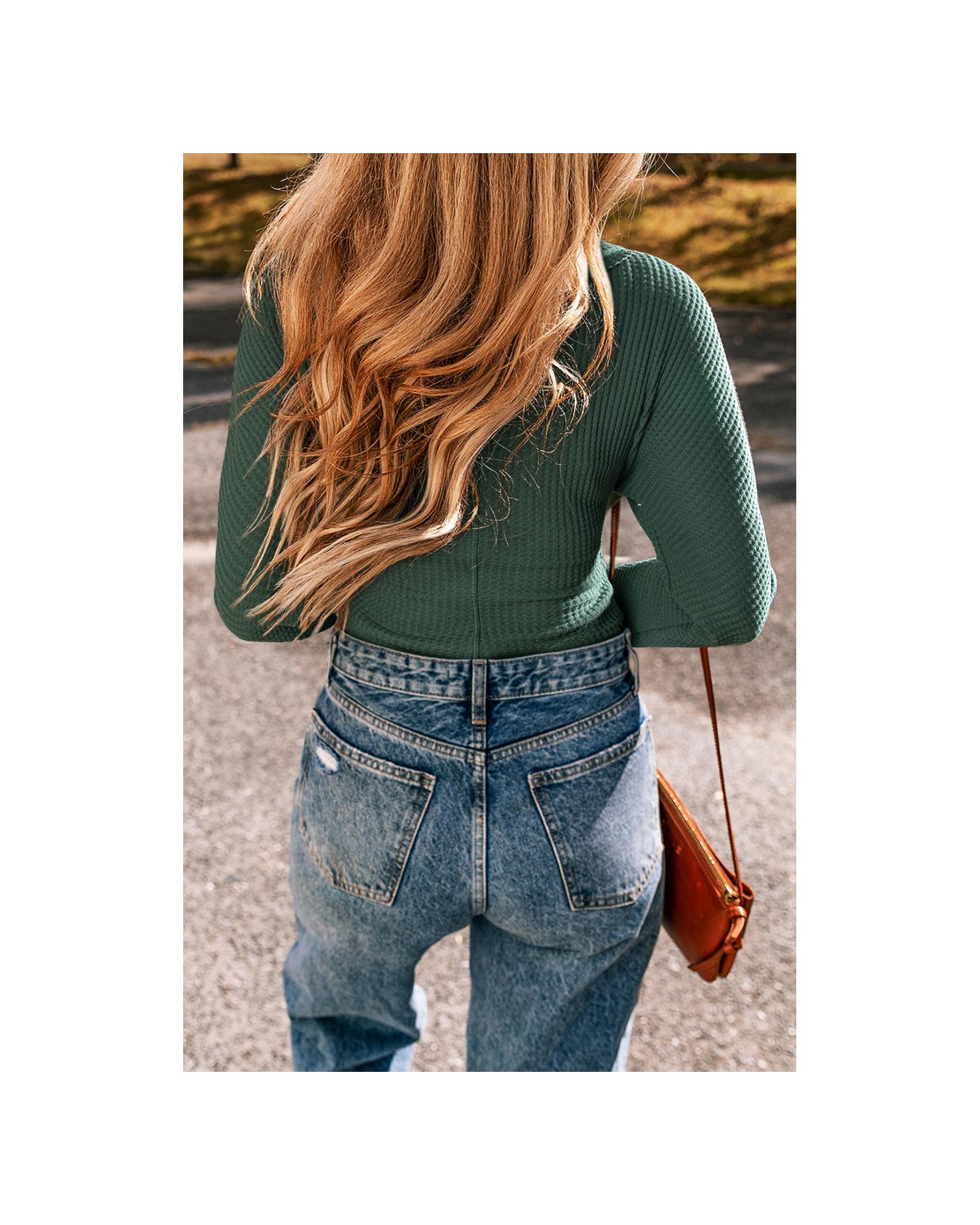 Blackish Green Waffle Knit Slim Fit Wrap V Neck Bodysuit – M