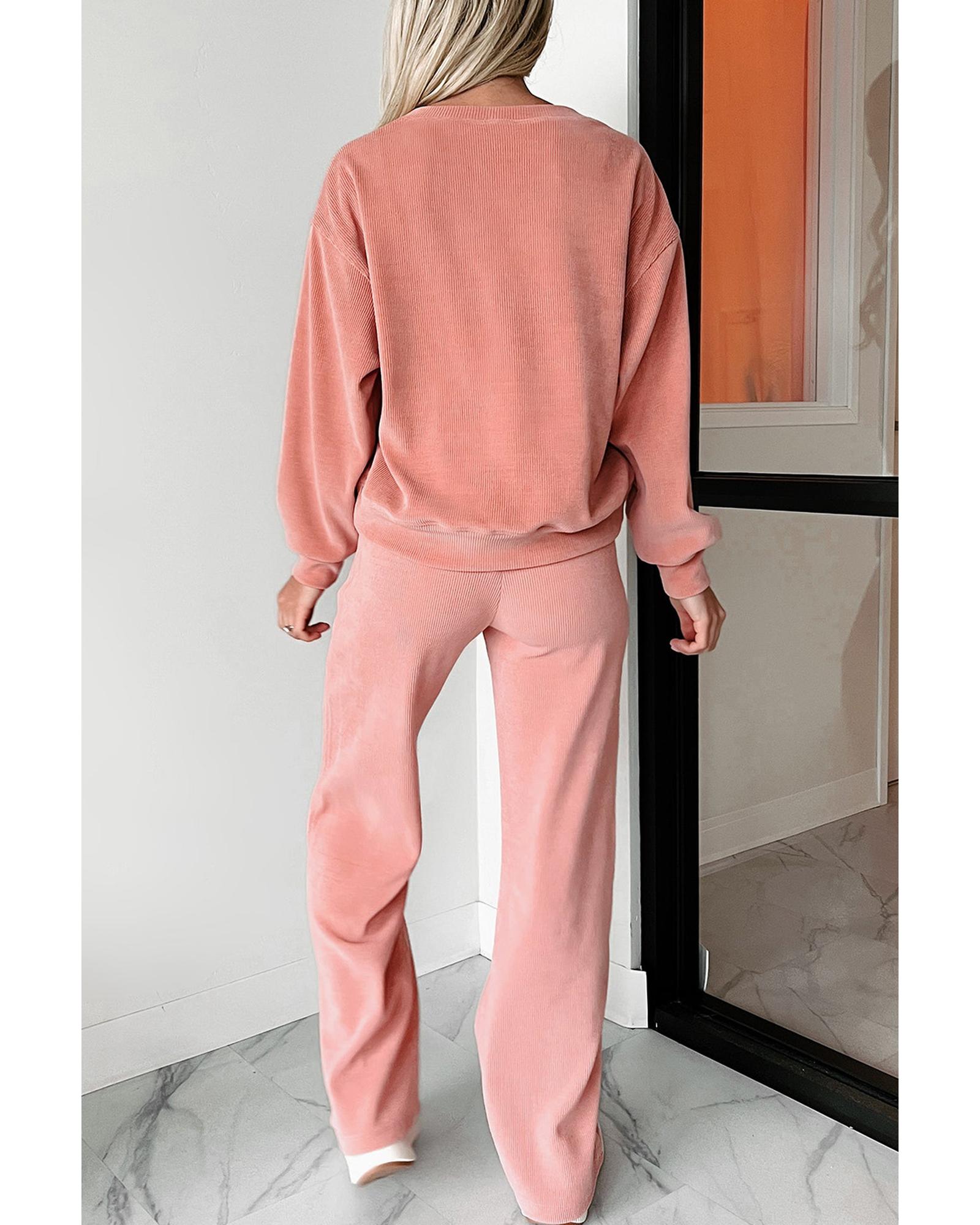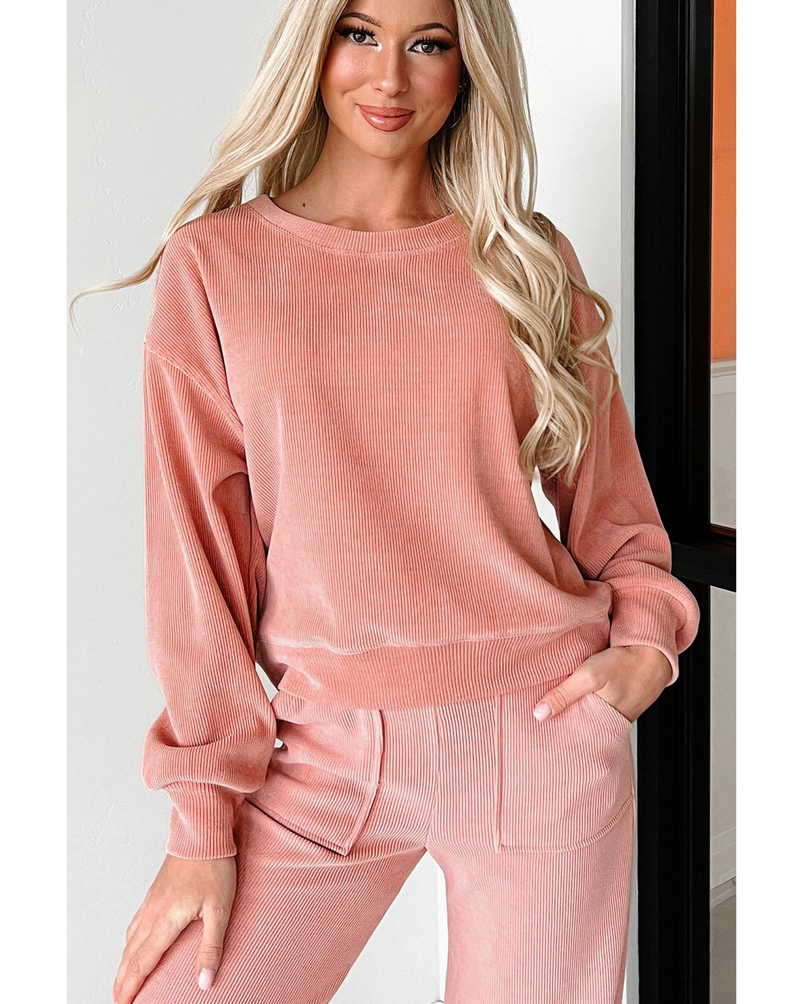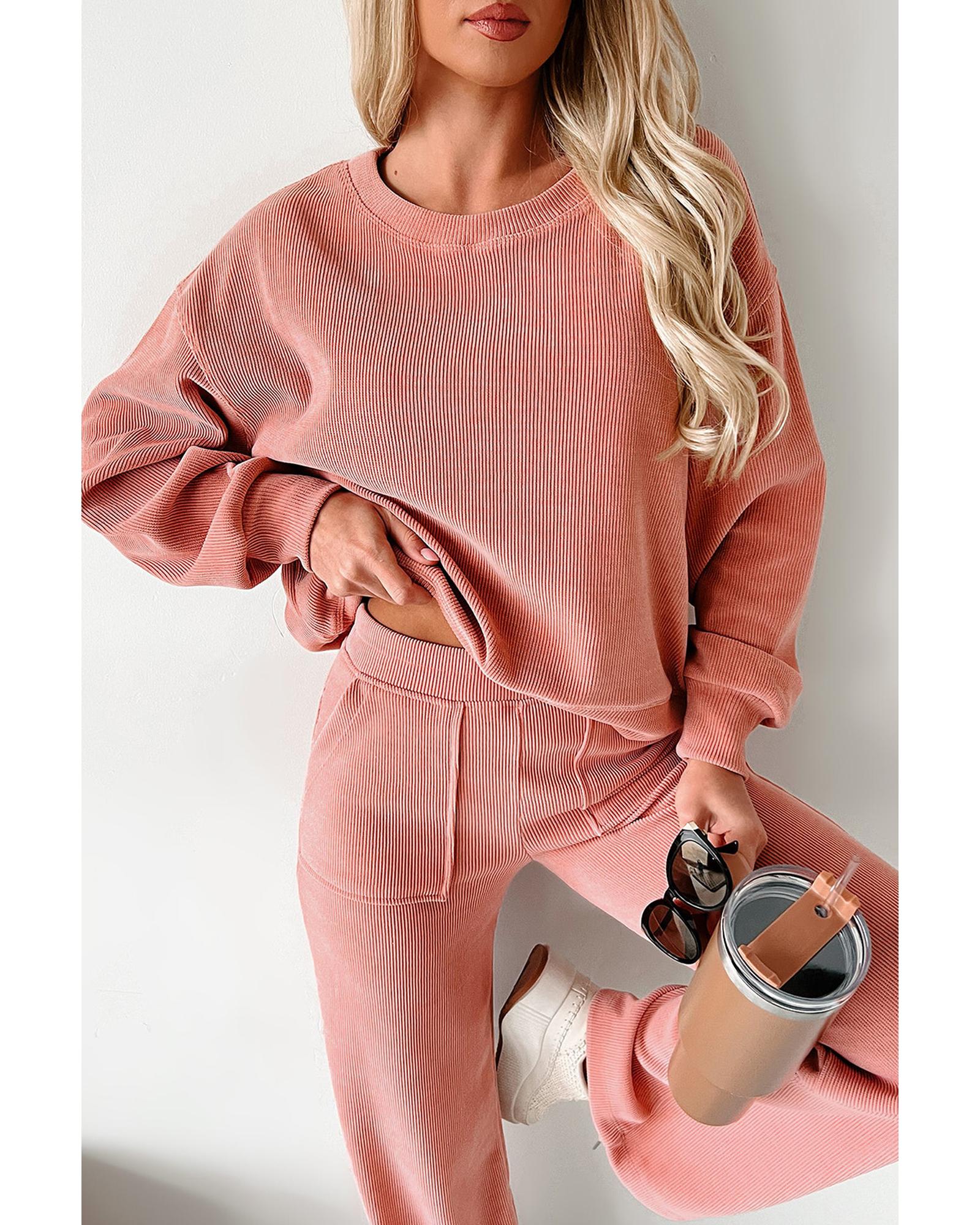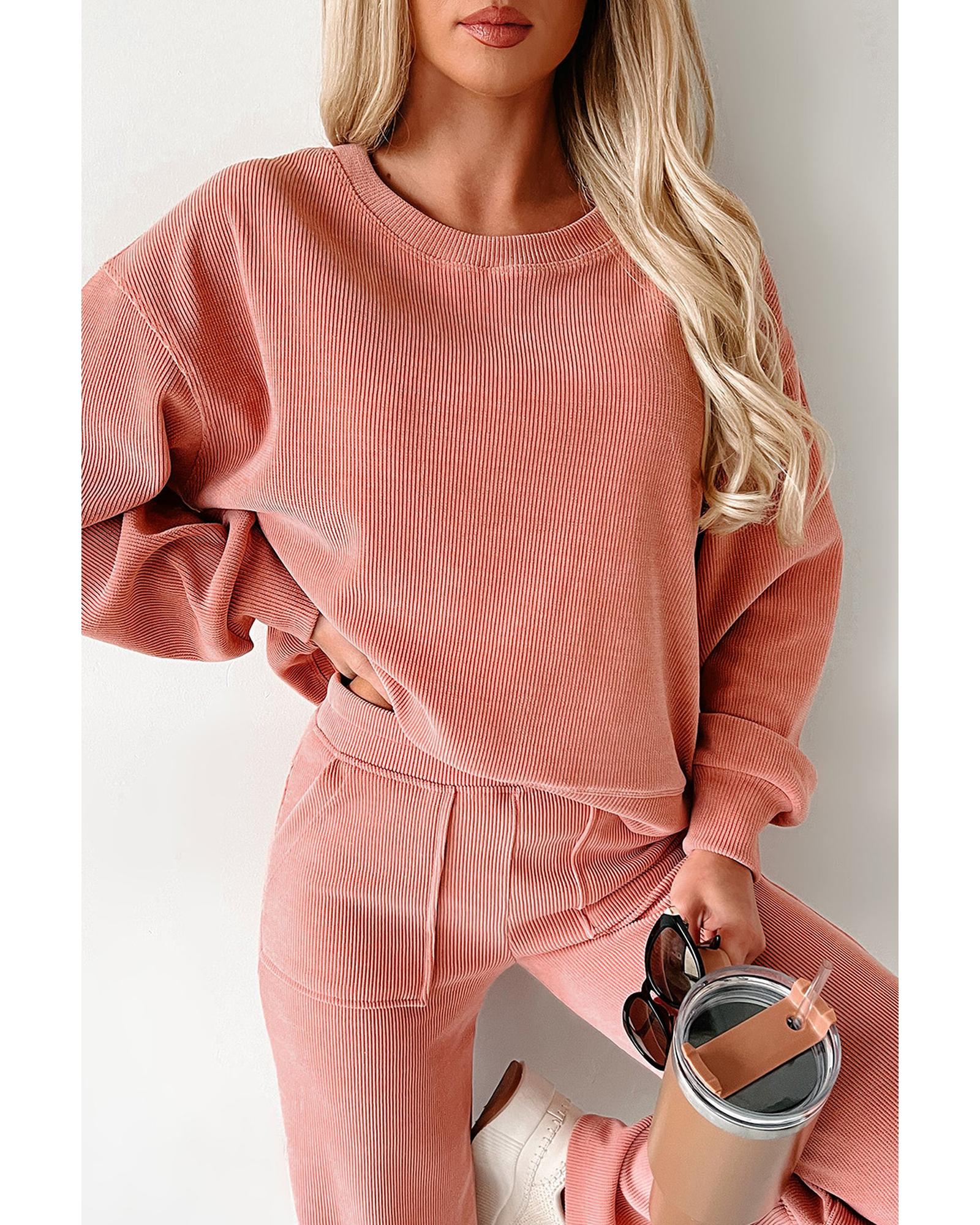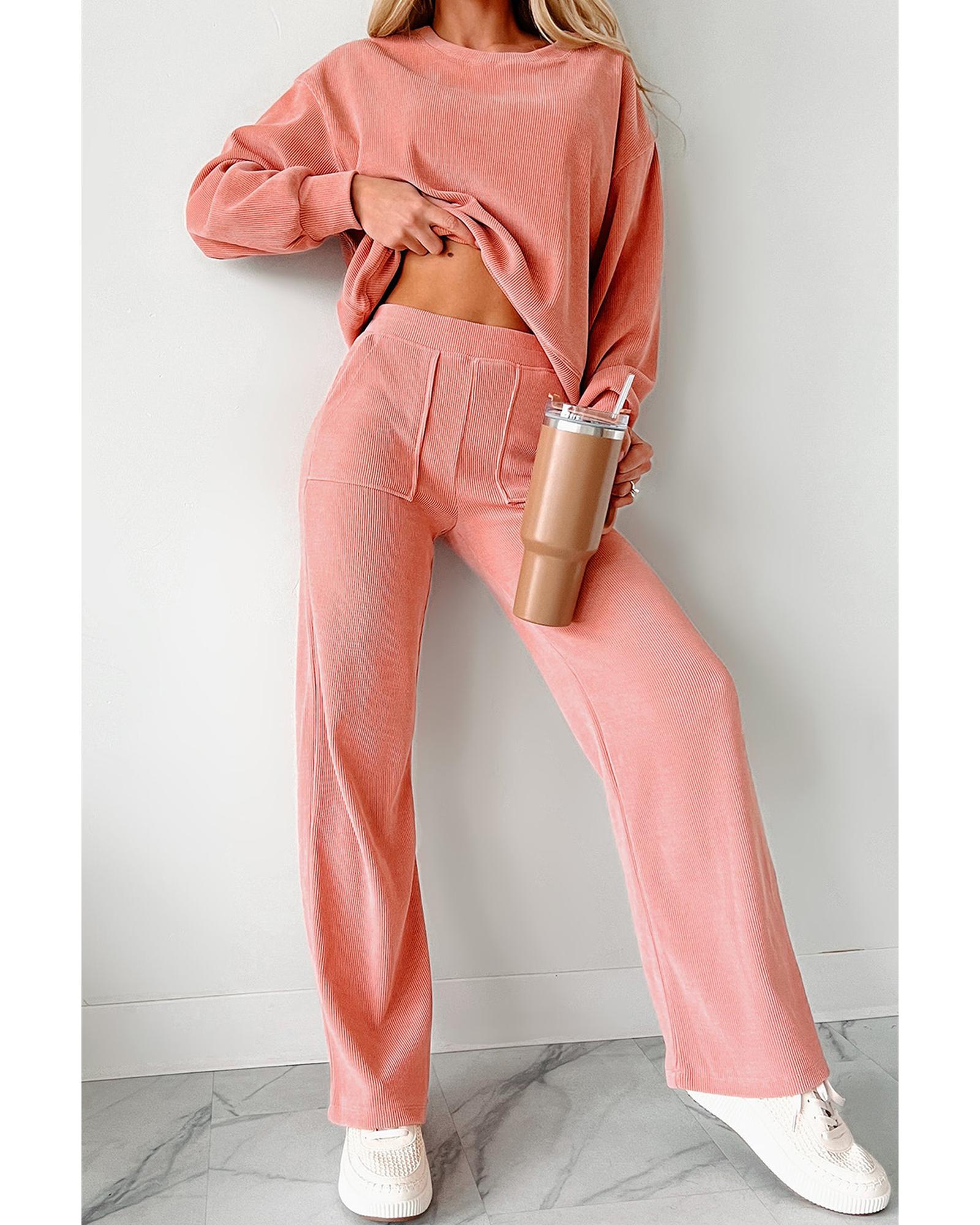 Blossom Ribbed Knit Drop Shoulder Pocketed Two Piece Lounge Set – L
