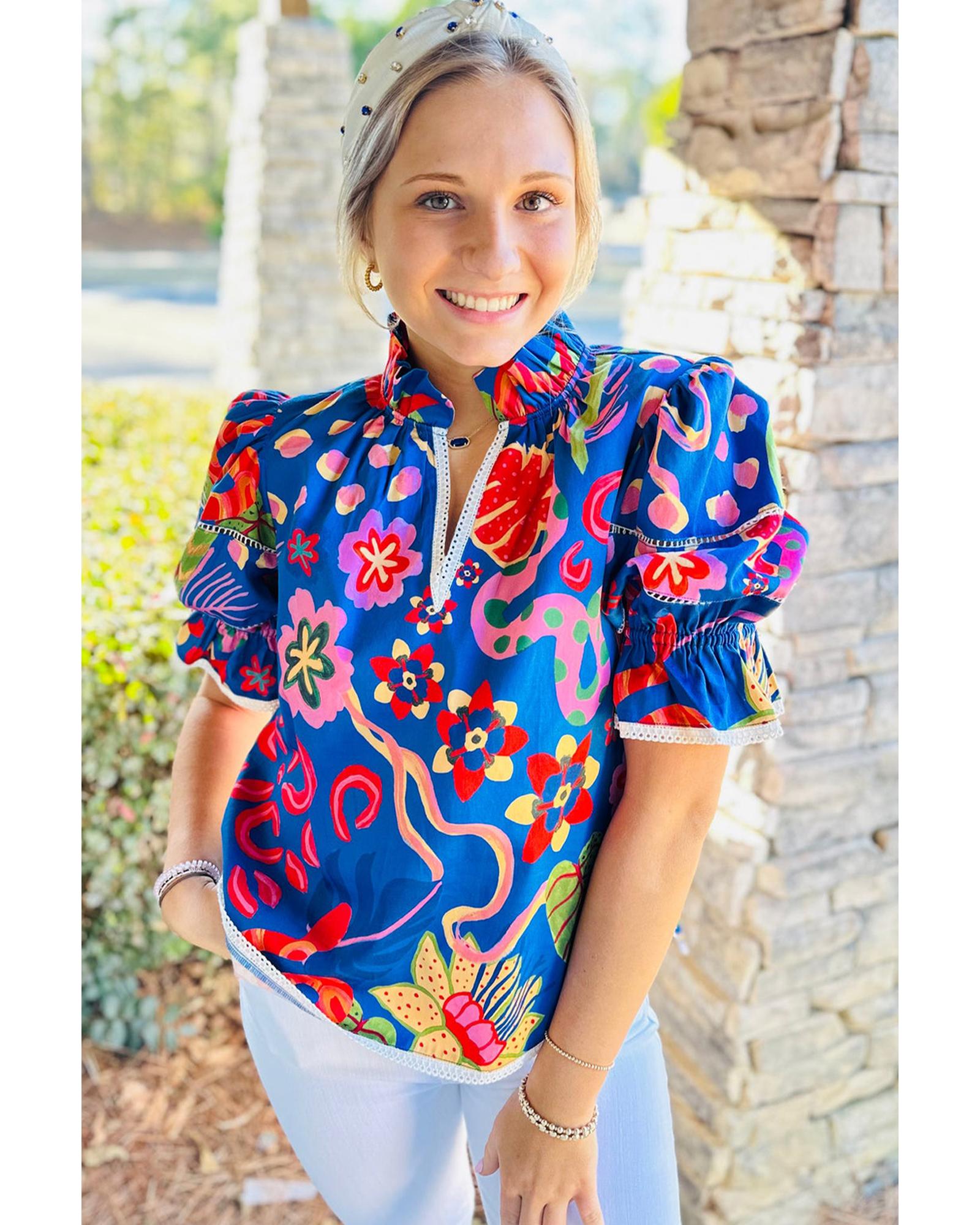 Blue Abstract Print Frilled Collar Ruffled Puff Short Sleeve Top – M